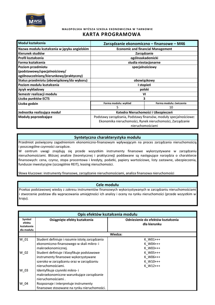 MAŁOP OLSKA WYŻSZ A SZ KOŁA E KONOMICZNA W TARN OW IE KARTA PROGRAMOWA Moduł kształcenia Zarządzanie ekonomiczno – finansowe – M46 Nazwa modułu kształcenia w języku angielskim Kierunek studiów Profil kształcenia Forma kształcenia Poziom przedmiotu (podstawowy/specjalnościowy/ ogólnouczelniany/kierunkowy/praktyczny) Status przedmiotu (obowiązkowy/do wyboru) Poziom modułu kształcenia Język wykładowy Semestr realizacji modułu Liczba punktów ECTS Liczba godzin Economic and financial Management Zarządzanie ogólnoakademicki studia niestacjonarne specjalnościowy obowiązkowy I stopień polski VI 3 Forma modułu: wykład Forma modułu: ćwiczenia 5 10 Katedra Nieruchomości i Ubezpieczeń Podstawy zarządzania, Podstawy finansów, moduły specjalnościowe: Ekonomika nieruchomości, Rynek nieruchomości, Zarządzanie nieruchomościami Jednostka realizująca moduł Moduły poprzedzające Syntetyczna charakterystyka modułu Przedmiot poświęcony zagadnieniom ekonomiczno-finansowym wpływającym na proces zarządzania nieruchomością i poszczególne czynności zarządcze. W centrum uwagi znajdują się przede wszystkim instrumenty finansowe wykorzystywane w zarządzaniu nieruchomościami. Bliższej analizie (teoretycznej i praktycznej) poddawane są następujące narzędzia o charakterze finansowych: cena, czynsz, stopa procentowa i kredyty, podatki, papiery wartościowe, listy zastawne, ubezpieczenia, fundusze inwestycyjne (szczególnie REIT), leasing nieruchomości. Słowa kluczowe: instrumenty finansowe, zarządzanie nieruchomościami, analiza finansowa nieruchomości Cele modułu Przekaz podstawowej wiedzy z zakresu instrumentów finansowych wykorzystywanych w zarządzaniu nieruchomościami i stworzenie podstaw dla wypracowania umiejętności ich analizy i oceny na rynku nieruchomości (przede wszystkim w kraju). Opis efektów kształcenia modułu Symbol efektu kształcenia dla modułu Osiągnięte efekty kształcenia Odniesienie do efektów kształcenia dla kierunku Wiedza: W_01 W_02 W_03 W_04 Student definiuje i rozumie istotę zarządzania ekonomiczno-finansowego w skali mikro- i makroekonomicznej. Student definiuje i klasyfikuje podstawowe instrumenty finansowe wykorzystywane szeroko w zarządzaniu oraz w zarządzaniu nieruchomościami. Identyfikuje czynniki mikro- i makroekonomiczne warunkujące zarządzanie nieruchomościami . Rozpoznaje i interpretuje instrumenty finansowe stosowane na rynku nieruchomości. K_W01+++ K_W04+++ K_W03+++ K_W05+++ K_W06+++ K_W10+++ K_W12+++ U_01 U_02 U_03 U_04 K_01 K_02 Umiejętności: Student analizuje i interpretuje podstawowe zjawiska i procesy finansowe zachodzące w organizacji i jej otoczeniu stosując kluczowe pojęcia teoretyczne. Student potrafi posługiwać się podstawowymi ujęciami teoretycznymi w celu analizowania bliższego i dalszego otoczenia rynku nieruchomości. Potrafi diagnozować aktualną i prognozować przyszłą sytuację na rynku nieruchomości oraz wybrać strategię działań praktycznych w odniesieniu do różnych kontekstów działalności zarządczej w nieruchomościach. Potrafi ocenić i zdecydować o wyborze najkorzystniejszych instrumentów finansowych w zarządzaniu nieruchomościami (np. wybór korzystnego kredytu hipotecznego na podstawie analizy produktów bankowych dostępnych w kraju, dobór ubezpieczeń majątkowych, analiza sytuacji finansowej rynku nieruchomości) i zastosować je w praktyce. Kompetencje społeczne: Student jest przygotowany do aktywnego uczestnictwa w działaniach podmiotów, instytucji/organizacji realizujących zarządzanie nieruchomościami. Potrafi pozyskać odpowiedni zasób informacji nt. instrumentów finansowych i na tej podstawie dokonać oceny, z których najlepiej skorzystać. K_U01 +++ K_U02+++ K_U03+++ K_U08+++ K_U10+++ K_K06++ K_K05+ Treści kształcenia modułu 1. 2. 3. 4. 5. Forma modułu: wykład Finanse jako zjawiska i procesy finansowe – wprowadzenie do przedmiotu Zarządzanie ekonomiczno-finansowe w skali mikro i makroekonomicznej Przegląd pojęć z zakresu zarządzania oraz zarządzania nieruchomościami (jako że przedmiot prowadzony jest na specjalności Gospodarka nieruchomościami) - przypomnienie i uporządkowanie wiedzy: - zarządzanie (definicje i schematy), - nieruchomości i ich segmenty oraz zarządzanie nimi, Instrumenty finansowe (ogólna charakterystyka instrumentów finansowych wraz z ich klasyfikacją) Instrumenty finansowe w zarządzaniu nieruchomościami: - cena – główne tendencje na rynku nieruchomości na świecie i w Polsce; wartość nieruchomości a jej cena w warunkach rynkowych, - czynsz – poziom czynszów w kraju i sposoby jego szacowania, - stopa procentowa – kredyty rynku nieruchomości, - papiery wartościowe, - fundusze inwestycyjne w Polsce, a amerykańskie REIT`s, Forma modułu: ćwiczenia 1. Rodzaje inwestycji na rynku nieruchomości (inwestycje w nieruchomości, inwestycje w instrumenty finansowe rynku nieruchomości; inwestycje rzeczowe i finansowe). 2. Zalety i wady inwestowania w nieruchomości. 3. Nieruchomość jako źródło uzyskiwania dochodu. 4. Nieruchomość jako instrument chroniący przed inflacją. 5. Nieruchomość jako podstawa osiągania ulg podatkowych. 6. Nieruchomość jako podstawa zabezpieczenia kredytu. 7. Nieruchomość jako niepodzielny instrument finansowy. 8. Ryzyko inwestowania w nieruchomości. 9. Nieruchomość jako inwestycja aktywna, wymagająca zarządzania. 10. Instrumenty finansowe w zarządzaniu nieruchomościami. * Czynsz jako narzędzie polityki mieszkaniowej - porównanie stawek czynszów w Tarnowie w mieszkaniach komunalnych, prywatnych, spółdzielczych, TBS. - składniki czynszu. * Zagadnienie dodatków mieszkaniowych (komu przysługuje, jak się o nie starać – informacje praktyczne). * Podatki w nieruchomościach (podatek od nieruchomości, podatek od spadków i darowizn, podatek dochodowy, ulgi, zwolnienia). - listy zastawne, - ubezpieczenia, - instrumenty poch