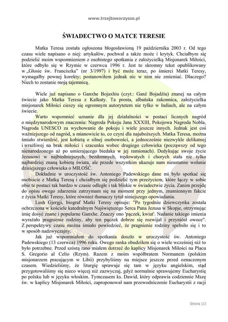 www.trzejtowarzysze.pl ŚWIADECTWO O MATCE TERESIE Matka Teresa została ogłoszona błogosławioną 19 października 2003 r. Od tego czasu wiele napisano o niej: artykułów, pochwał a także może i krytyk. Chciałbym się podzielić moim wspomnieniem z osobistego spotkania z założycielką Misjonarek Miłości, które odbyło się w Rzymie w czerwcu 1996 r. Jest to skromny tekst opublikowany w „Głosie św. Franciszka” (nr 3/1997) i być może teraz, po śmierci Matki Teresy, wymagałby pewnej korekty; postanowiłem jednak nic w nim nie zmieniać. Dlaczego? Niech to zostanie moją tajemnicą. Wiele już napisano o Ganxhe Bojaxhiu (czyt.: Ganż Bojadżiu) znanej na całym świecie jako Matka Teresa z Kalkuty. Ta prosta, albańska zakonnica, założycielka misjonarek Miłości cieszy się ogromnym autorytetem nie tylko w Indiach, ale na całym świecie. Warto wspomnieć uznanie dla jej działalności w postaci licznych nagród o międzynarodowym znaczeniu: Nagroda Pokoju Jana XXXIII, Pokojowa Nagroda Nobla, Nagroda UNESCO za wychowanie do pokoju i wiele jeszcze innych. Jednak jest coś ważniejszego od nagród, a mianowicie to, co czyni dla najuboższych. Matka Teresa, można śmiało stwierdzić, jest kobietą o silnej osobowości, a jednocześnie niezwykle delikatnej i wrażliwej na brak miłości i szacunku wobec drugiego człowieka (począwszy od tego nienarodzonego aż po umierającego biedaka w jej ramionach). Dedykując swoje życie Jezusowi w najbiedniejszych, bezdomnych, trędowatych i chorych stała nie tylko najbardziej znaną kobietą świata, ale przede wszystkim ukazuje nam nieustanne wołanie dzisiejszego człowieka o MIŁOŚĆ. Dokładnie w uroczystość św. Antoniego Padewskiego dane mi było spotkać się osobiście z Matką Teresą i chciałbym się podzielić tym przeżyciem, które łączy w sobie obie te postaci tak bardzo w czasie odległe i tak bliskie w świadectwie życia. Zanim przejdę do opisu owego zdarzenia zatrzymam się na moment przy jednym, znamiennym fakcie z życia Matki Teresy, które również tłumaczy tytuł niniejszego opowiadania. Lush Gjergji, biograf Matki Teresy opisuje: "Po tygodniu dziewczynka została ochrzczona w kościele katedralnym Najświętszego Serca Pana Jezusa w Skopje, otrzymując imię dosyć znane i popularne Ganxhe. Znaczy ono 'pączek, kwiat'. Nadanie takiego imienia wyrażało pragnienie rodziny, aby ten pączek dobrze się rozwijał i przyniósł owoce". Z perspektywy czasu można śmiało powiedzieć, że pragnienie rodziny spełniło się i to w sposób nadzwyczajny. Jak już wspomniałem do spotkania doszło w uroczystość św. Antoniego Padewskiego (13 czerwca) 1996 roku. Owego ranka obudziłem się o wiele wcześniej niż to było potrzebne. Przed szóstą rano miałem dotrzeć do kaplicy Misjonarek Miłości na Placu S. Gregorio al Celio (Rzym). Razem z moim współbratem Normanem (polskim misjonarzem pracującym w Libii) przybyliśmy na miejsce jeszcze przed oznaczonym czasem. Wiedzieliśmy, że liturgię sprawuje się tam w języku angielskim, stąd przygotowaliśmy się nieco więcej niż zazwyczaj, gdyż normalnie sprawujemy Eucharystię po polsku lub w języku włoskim. Tymczasem ks. Dawid, który odprawia codziennie Mszę św. w kaplicy Misjonarek Miłości, zaproponował nam przewodniczenie Eucharystii z racji Strona 1/2 www.trzejtowarzysze.pl wspomnianej już wcześniej uroczystości św. Antoniego. Można sobie łatwo wyobrazić sytuację, w której się znalazłem, nie mniej jednak odpowiedziałem pozytywnie na powyższą propozycję mając nadzieję, że św. Antoni nie opuści mnie w tych wyjątkowych okolicznościach. Zbliżywszy się zatem do ołtarza byłem już spokojny i kiedy zacząłem mówić poczułem w sercu światło Ducha Świętego. Po Mszy św. i dziękczynieniu Matka Teresa podeszła do nas w zakrystii i mogliśmy przez chwilę z nią porozmawiać. Ona sama nie mówiła zbyt wiele, ale jej słowa choć krótkie okazały się wielce dla mnie znaczące. Przede wszystkim zwróciła nam uwagę na codzienną modlitwę. Wskazała na przykład swoich sióstr, które obecne w 130 krajach na całym świecie, każdego dnia poświęcają pewien określony czas na adorację Najświętszego Sakramentu(w ich regule przewidziana jest godzina adoracji rano i wieczorem). Zdarza się bowiem, że spoglądamy na modlących się odważnie wyznawców innych religii, a sami zapominamy o bogactwie własnego dziedzictwa duchowego. Może nawet czasem zdarzyć się tak, iż nie potrafimy dostrzec i uszanować obecności Chrystusa w Eucharystii. Dlatego słowa Matki Teresy wydają mi się w tym przypadku słuszne i zobowiązujące. Chciejmy spróbować znaleźć trochę czasu w ciągu dnia na osobiste spotkanie z Jezusem obecnym w Najświętszym Sakramencie. Po tej krótkiej rozmowie Matka Teresa pożegnała się z nami, gdyż jeszcze tego samego dnia miała udać się do Irlandii w celu otwarcia nowej placówki Misjonarek Miłości. W tym miejscu warto zauważyć, że ich domy są kolejnym znakiem Bożej Opatrzności i potwierdzeniem wielkiego zapotrzebowania na ludzi, którzy naśladują Jezusa Chrystusa na styl życia zaproponowany przez Ganxhe Bojaxhiu. Z drugiej strony, potrzeba ich obecności w dzisiejszym świecie potwierdza się dużą liczbą powołań. Wiele dziewcząt z całego świata pragnie poświęcić swoje życie w służbie najbiedniejszym z najbiedniejszych. Są gotowe pomagać im w slamsach Kalkuty czy San Paolo; przygotować posiłek biednym z dzielnic Nowego Jorku czy zaopiekować się bezdomnymi w Rzymie. Nie boją się służyć chorym na AIDS. Jeszcze jedna sprawa: chciałem zrobić zdjęcie Matce Teresie, ale nie ośmieliłem się nawet poprosić o to. Czułem, że moja prośba mogłaby zepsuć tę wyjątkową atmosferę, która wytworzyła się wokół jej osoby. Postać św. Antoniego - naśladowcy Biedaczyny z Asyżu oraz szczególny charyzmat Matki Teresy wydają mi się bardzo wa