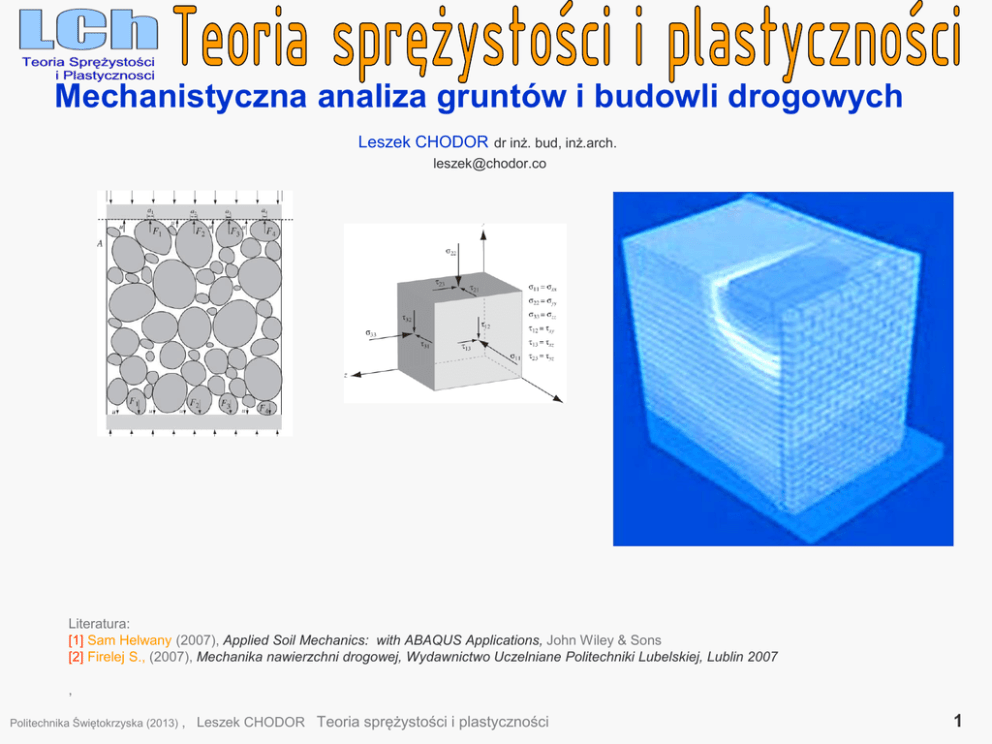 Mechanistyczna analiza gruntów i budowli drogowych Leszek CHODOR dr inż. bud, inż.arch. [email protected] Literatura: [1] Sam Helwany (2007), Applied Soil Mechanics: with ABAQUS Applications, John Wiley & Sons [2] Firelej S., (2007), Mechanika nawierzchni drogowej, Wydawnictwo Uczelniane Politechniki Lubelskiej, Lublin 2007 , Politechnika Świętokrzyska (2013) , Leszek CHODOR Teoria sprężystości i plastyczności 1 Mechanistyczna analiza gruntów i budowli drogowych Istota problemu Przewidywana do realizacji droga wymaga dokumentacji projektowej, którą należy opracować stosowanie do kategorii drogi ( autostrada, krajowa,.., lokalna) oraz złożoności warunków gruntowo-wodnych. Najczęściej drogi prowadzi się przez tereny , które są już nieodpowiednie dla budownictwa innego typu. W takim terenie pojawiają się dodatkowe problemy związane z mało nośnym podłożem drogi, niekorzystnymi warunkami gruntowo-wodnymi, ochroną środowiska przyrodniczego. Przy opracowaniu takiej dokumentacji uczestniczy wielu specjalistów: inżynier drogowy i urbanista (usytuowanie w sieci dróg), inżynier budowy mostów, inżynier geoetchnik, ekolog, inżynier inżynierii środowiska, itd. Z punktu widzenia poprawnej konstrukcji drogi najważniejsze jest właściwe rozpoznanie warunków gruntowych na trasie drogi. Rozwiązania konstrukcyjne będą inne w zależności od przeszkód (bagna, góry rzeki, itp.). Na konstrukcjach inżynierskich (mosty, wiadukty, tunele) podłożem będzie konstrukcja obiektu, i w tym przypadku podbudowa może być ograniczona do minimum. Najtrudniejsze jest prawidłowe zaprojektowanie konstrukcji drogi na podłożu gruntowym. Stosowane dotychczas w Polsce projektowanie z użyciem katalogów nawierzchni sztywnych lub półsztywnych lub też innych wytycznych bez indywidulanych obliczeń, prowadzi wielokrotnie do: 1) niedowymiarowania konstrukcji, co powoduje uszkodzenia w czasie eksploatacji z katastrofami budowlanymi włącznie, lub 2) przewymiarowania, czyli stosowanie rozwiązań ekonomicznie nieuzasadnionych, co powoduje istotne straty budżetu Państwa oraz całej Unii Eurpoejskiej. Dlatego, co najmniej w przypadku autostrad i dróg krajowych oraz dróg w miastach zaleca się, a nawet wymaga zaprojektowania konstrukcji drogi ze wspomaganiem obliczeniami mechanistycznymi. Politechnika Świętokrzyska (2013) , Leszek CHODOR Teoria sprężystości i plastyczności 2 Mechanistyczna analiza gruntów i budowli drogowych Model konstrukcji nawierzchni Model nawierzchni wielowarstwowej i przestrzenny wycinek: [2] Do analizy modelu nawierzchni najczęściej używa się zapisu w walcowym układzie współrzędnych. Wycinek ma kształt klina o wymiarach dx, dr, r df Na jego powierzchni działają siły normalne i styczne. N a skutek obciążenia model doznaje przemieszczeń, odkształceń. Konstrukcja nawierzchni składa się z n warstw o rozmaitych własnościach mechanicznych, które wstępnie możemy przyjąć na podstawie katalogu nawierzchni [Rozporządzenie Ministra(1999 z późn. zmianami )] , a dolne warstwy na podstawie rozpoznania gruntowego. Podstawowy model, to półprzestrzeń sprężysta, wielowarstwowa. Przyjmuje się , że półprzestrzeń ma nieograniczoną długość i szerokość, mimo, że faktycznie szerokość jest ograniczona do szerokości pasa drogowego Politechnika Świętokrzyska (2013) , Leszek CHODOR Teoria sprężystości i plastyczności W modelu bliższym rzeczywistości uwzględnia się model reologiczny gruntu i działanie wody w gruncie. Ze względu na złożoność modelu taką analizę umożiwiają zaawansowane programy komputerowe 3 Mechanistyczna analiza gruntów i budowli drogowych Warunki równowagi Warunki równowagi klina półprzestrzeni sprężystej [2] [2] Politechnika Świętokrzyska (2013) , Leszek CHODOR Teoria sprężystości i plastyczności 4 Mechanistyczna analiza gruntów i budowli drogowych Naprężenia, odkształcenia, przemieszczenia {1} Rozwiązanie modelu nawierzchni przeprowadza się poprzez przyjęcie funkcji naprężeń F(r,z) . Funkcja naprężeń jest przypuszczoną funkcją analityczną, taką by spełniała równanie biharmoniczne , tzn równanie: Operator Laplace’a uprości się w przypadku symetrii obciążenia. F- siła masowa po zrzutowaniu na oś f Równania Hooke’a Politechnika Świętokrzyska (2013) Równania geometryczne Dylatacja (względna zmiana objętości) , Leszek CHODOR Teoria sprężystości i plastyczności 5 Mechanistyczna analiza gruntów i budowli drogowych Naprężenia, odkształcenia, przemieszczenia {2} Równanie Hooke’a-inne postacie Politechnika Świętokrzyska (2013) , Leszek CHODOR Teoria sprężystości i plastyczności Wyrażenie w funkcji naprężeń 6 Mechanistyczna analiza gruntów i budowli drogowych Naprężenia, odkształcenia, przemieszczenia {3} Wyrażenie w funkcji naprężeń , cd Politechnika Świętokrzyska (2013) , Leszek CHODOR Teoria sprężystości i plastyczności Inne zależności 7 Mechanistyczna analiza gruntów i budowli drogowych Funkcje Bessela w modelu nawierzchni Rozwiązanie nawierzchni drogowej wymaga stosowania funkcji Bessela, które są rozwiązaniem równania różniczkowego Funkcje Bessela pierwszego rzędu Politechnika Świętokrzyska (2013) , Leszek CHODOR Teoria sprężystości i plastyczności 8 Mechanistyczna analiza gruntów i budowli drogowych Warunki brzegowe w modelu nawierzchni W modelu o n-warstwach (łącznie z warstwą półprzestrzeni (najniższą) mamy N niewiadomych Zakłada się, że na styku warstw sąsiednich naprężenia i przemieszczenia powinny być równe (kontinuum materiału) Dwa następne równania na styku warstw będą zależne od rodzaju współpracy między nimi: • Pełna współpraca, gdy przemieszczenia poziome i naprężenia styczne są równe • brak tarcia, gdy naprężenia styczne są zerowe • Pośredni warunek współpracy, gdy naprężenia styczne są ograniczone do pewnej wielkości po przekrocz