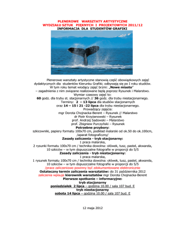 PLENEROWE WARSZTATY ARTYSTYCZNE WYDZIAŁU SZTUK PIĘKNYCH I PROJEKTOWYCH 2011/12 INFORMACJA DLA STUDENTÓW GRAFIKI Plenerowe warsztaty artystyczne stanowią część obowiązkowych zajęć dydaktycznych dla studentów Kierunku Grafiki; odbywają się po I roku studiów. W tym roku temat wiodący zajęć brzmi: „Nowe miasto” – zagadnienia z nim związane realizowane będą poprzez Rysunek i Malarstwo. Wymiar czasowy zajęć to: 60 godz. dla trybu st. stacjonarnych // 36 godz. dla trybu niestacjonarnego. Terminy: 2 – 13 lipca dla studiów stacjonarnych oraz 14 – 15 i 21 -22 lipca dla trybu niestacjonarnego. Prowadzący zajęcia: mgr Dorota Chojnacka-Berent – Rysunek // Malarstwo dr Piotr Krzyżanowski – Rysunek prof. Andrzej Sadowski – Malarstwo prof. Zbigniew Purczyński – Rysunek Potrzebne przybory: szkicowniki, papiery formatu 100x70 cm, podkład malarski od ok.50 do ok.100cm, /aparat fotograficzny/ Zasady zaliczenia - tryb stacjonarny: 1 praca malarska, 2 rysunki formatu 100x70 cm / technika dowolna: ołówek, tusz, pastel, akwarela, 10 szkiców – w tym dopuszczalne fotografie w proporcji do 5/5 Zasady zaliczenia - tryb niestacjonarny: 1 praca malarska, 1 rysunek formatu 100x70 cm / technika dowolna: ołówek, tusz, pastel, akwarela, 10 szkiców – w tym dopuszczalne fotografie w proporcji do 5/5 /prace zaliczeniowe powinny być zdokumentowane elektronicznie Ostateczny termin zaliczenia warsztatów: do 31 października 2012 zaliczenia wpisuje kierownik warsztatów mgr Dorota Chojnacka-Berent Pierwsze spotkanie – informacyjne: tryb stacjonarny poniedziałek 2 lipca – godzina 10.00 / sala 107 bud. E tryb niestacjonarny sobota 14 lipca – godzina 10.00 / sala 107 bud. E 12 maja 2012