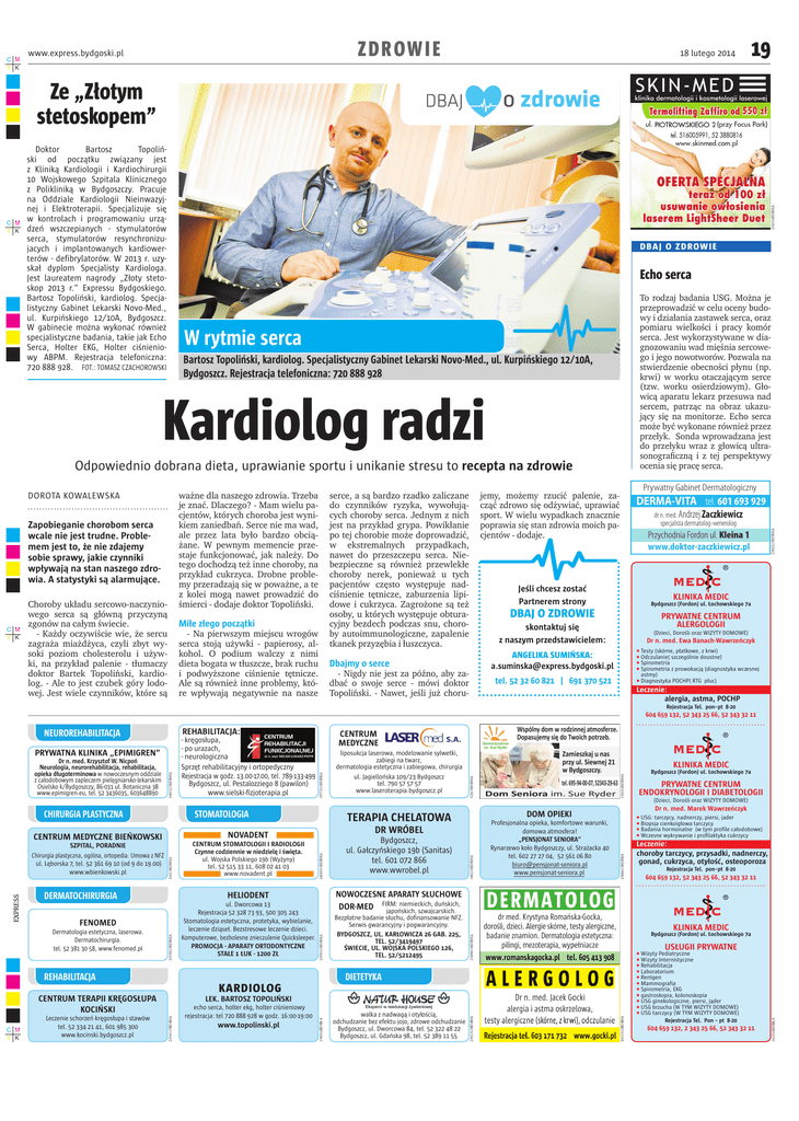 Z DROWI E www.express.bydgoski.pl Ze „Złotym stetoskopem” 550 zł ul. tel. 516005991, 52 3880816 www.skinmed.com.pl w www .skinmed.com.pl med.com.pl Doktor Bartosz Topoliński od początku związany jest z Kliniką Kardiologii i Kardiochirurgii 10 Wojskowego Szpitala Klinicznego z Polikliniką w Bydgoszczy. Pracuje na Oddziale Kardiologii Nieinwazyjnej i Elektroterapii. Specjalizuje się w kontrolach i programowaniu urządzeń wszczepianych - stymulatorów serca, stymulatorów resynchronizujacych i implantowanych kardiowerterów - defibrylatorów. W 2013 r. uzyskał dyplom Specjalisty Kardiologa. Jest laureatem nagrody „Złoty stetoskop 2013 r.” Expressu Bydgoskiego. Bartosz Topoliński, kardiolog. Specjalistyczny Gabinet Lekarski Novo-Med., ul. Kurpińskiego 12/10A, Bydgoszcz. W gabinecie można wykonać również specjalistyczne badania, takie jak Echo Serca, Holter EKG, Holter ciśnieniowy ABPM. Rejestracja telefoniczna: 720 888 928. FOT.: TOMASZ CZACHOROWSKI OFERTA SPECJALNA teraz od 100 zł usuwanie owłosienia laserem LightSheer Duet DBA J O ZDROWI E Echo serca To rodzaj badania USG. Można je przeprowadzić w celu oceny budowy i działania zastawek serca, oraz pomiaru wielkości i pracy komór serca. Jest wykorzystywane w diagnozowaniu wad mięśnia sercowego i jego nowotworów. Pozwala na stwierdzenie obecności płynu (np. krwi) w worku otaczającym serce (tzw. worku osierdziowym). Głowicą aparatu lekarz przesuwa nad sercem, patrząc na obraz ukazujący się na monitorze. Echo serca może być wykonane również przez przełyk. Sonda wprowadzana jest do przełyku wraz z głowicą ultrasonograficzną i z tej perspektywy ocenia się pracę serca. W rytmie serca Bartosz Topoliński, kardiolog. Specjalistyczny Gabinet Lekarski Novo-Med., ul. Kurpińskiego 12/10A, Bydgoszcz. Rejestracja telefoniczna: 720 888 928 Kardiolog radzi Odpowiednio dobrana dieta, uprawianie sportu i unikanie stresu to recepta na zdrowie Zapobieganie chorobom serca wcale nie jest trudne. Problemem jest to, że nie zdajemy sobie sprawy, jakie czynniki wpływają na stan naszego zdrowia. A statystyki są alarmujące. Choroby układu sercowo-naczyniowego serca są główną przyczyną zgonów na całym świecie. - Każdy oczywiście wie, że sercu zagraża miażdżyca, czyli zbyt wysoki poziom cholesterolu i używki, na przykład palenie - tłumaczy doktor Bartek Topoliński, kardiolog. - Ale to jest czubek góry lodowej. Jest wiele czynników, które są Miłe złego początki - Na pierwszym miejscu wrogów serca stoją używki - papierosy, alkohol. O podium walczy z nimi dieta bogata w tłuszcze, brak ruchu i podwyższone ciśnienie tętnicze. Ale są również inne problemy, które wpływają negatywnie na nasze Prywatny Gabinet Dermatologiczny jemy, możemy rzucić palenie, zacząć zdrowo się odżywiać, uprawiać sport. W wielu wypadkach znacznie poprawia się stan zdrowia moich pacjentów - dodaje. serce, a są bardzo rzadko zaliczane do czynników ryzyka, wywołujących choroby serca. Jednym z nich jest na przykład grypa. Powikłanie po tej chorobie może doprowadzić, w ekstremalnych przypadkach, nawet do przeszczepu serca. Niebezpieczne są również przewlekłe choroby nerek, ponieważ u tych pacjentów często występuje nadciśnienie tętnicze, zaburzenia lipidowe i cukrzyca. Zagrożone są też osoby, u których występuje obturacyjny bezdech podczas snu, choroby autoimmunologiczne, zapalenie tkanek przyzębia i łuszczyca. ważne dla naszego zdrowia. Trzeba je znać. Dlaczego? - Mam wielu pacjentów, których choroba jest wynikiem zaniedbań. Serce nie ma wad, ale przez lata było bardzo obciążane. W pewnym memencie przestaje funkcjonować, jak należy. Do tego dochodzą też inne choroby, na przykład cukrzyca. Drobne problemy przeradzają się w poważne, a te z kolei mogą nawet prowadzić do śmierci - dodaje doktor Topoliński. DOROTA KOWALEWSKA C M Y K (przy Focus Park) 234514BDBHA C M Y K 19 18 lutego 2014 DERMA-VITA tel. 601 693 929 dr n. med. Andrzej Zaczkiewicz specjalista dermatolog-wenerolog Przychodnia Fordon ul. Kleina 1 www.doktor-zaczkiewicz.pl Jeśli chcesz zostać Partnerem strony KLINIKA MEDIC Bydgoszcz (Fordon) ul. Łochowskiego 7a DBAJ O ZDROWIE PRYWATNE CENTRUM ALERGOLOGII skontaktuj się z naszym przedstawicielem: (Dzieci, Dorośli oraz WIZYTY DOMOWE) Dr n. med. Ewa Banach-Wawrzeńczyk P Testy (skórne, płatkowe, z krwi) P Odczulanie( szczególnie doustne) P Spirometria P Spirometria z prowokacją (diagnostyka wczesnej astmy) P Diagnostyka POCHP( RTG płuc) ANGELIKA SUMIŃSKA: [email protected] Dbajmy o serce - Nigdy nie jest za późno, aby zadbać o swoje serce - mówi doktor Topoliński. - Nawet, jeśli już choru- 2382213BDBHA C M Y K tel. 52 32 60 821 | 691 370 521 Leczenie: alergia, astma, POCHP Rejestracja Tel. pon–pt 8-20 604 659 132, 52 343 25 66, 52 343 32 11 Bezpłatne badanie słuchu, dofinansowanie NFZ. Serwis gwarancyjny i pogwarancyjny. BYDGOSZCZ, UL. KARŁOWICZA 26 GAB. 225, TEL. 52/3419497 ŚWIECIE, UL. WOJSKA POLSKIEGO 126, TEL. 52/5212495 186214BDBHA 134314BDBHA 2386613BDBRA USŁUGII PRYWATNE walka lk z nadwagą d i otyłością, ł śi odchudzanie bez efektu jojo, zdrowe odchudzanie Bydgoszcz, ul. Dworcowa 84, tel. 52 322 48 22 Bydgoszcz, ul. Gdańska 98, tel. 52 389 11 55 3011512BDBHA www.topolinski.pl Rejestracja Tel. pon–pt 8-20 604 659 132, 52 343 25 66, 52 343 32 11 KLINIKA MEDIC 2391313BDBHA echo serca, holter ekg, holter ciśnieniowy rejestracja: tel 720 888 928 w godz. 16:00-19:00 Leczenie: choroby tarczycy, przysadki, nadnerczy, gonad, cukrzyca, otyłość, osteoporoza Bydgoszcz (Fordon) ul. Łochowskiego 7a LEK. BARTOSZ TOPOLIŃSKI 2354113BDBHA C M Y K Leczenie schorzeń kręgosłupa i stawów tel. 52 334 21 41, 601 985 300 www.kocinski.bydgoszcz.pl P USG: tarczycy, nadnerczy, piersi, jader P Biopsja cienkoigłowa tarczycy P Badania hormonalne (w tym profile całodobowe) P Wczesne wykrywanie i profilaktyka cukrzycy DIETETYKA K
