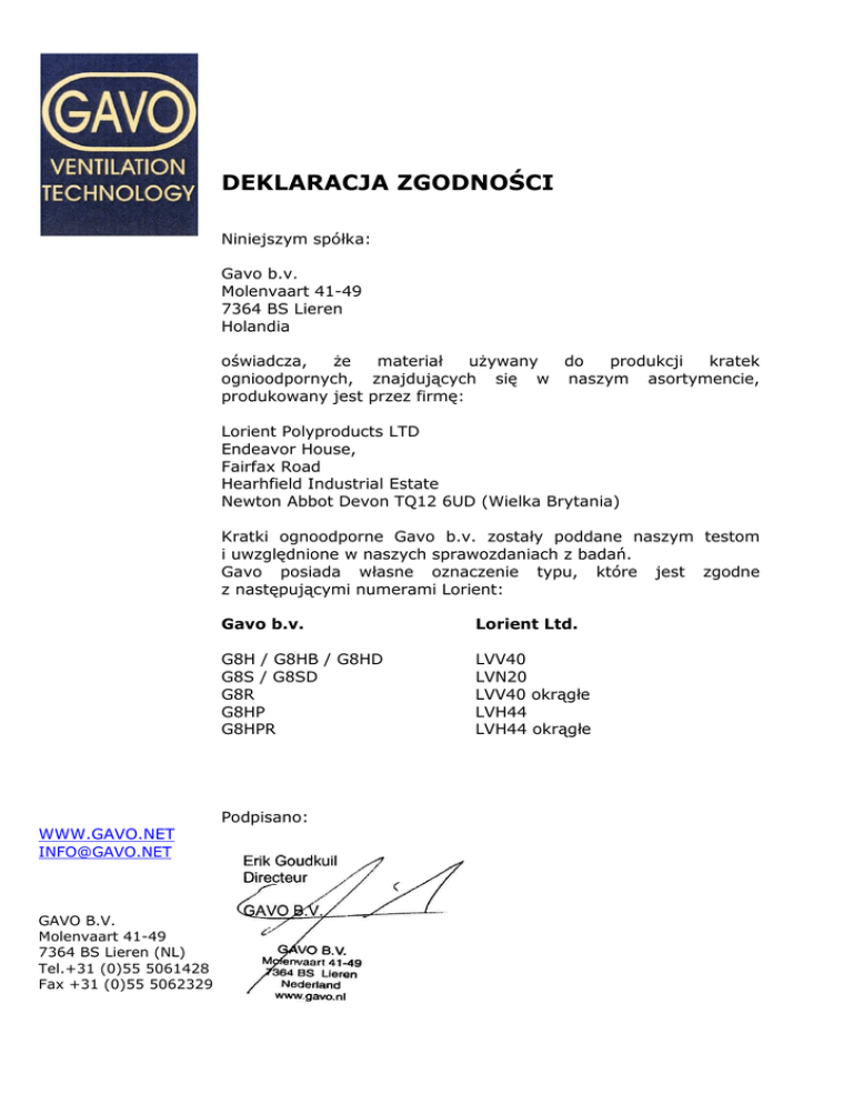 DEKLARACJA ZGODNOŚCI Niniejszym spółka: Gavo b.v. Molenvaart 41-49 7364 BS Lieren Holandia oświadcza, że materiał używany do produkcji kratek ognioodpornych, znajdujących się w naszym asortymencie, produkowany jest przez firmę: Lorient Polyproducts LTD Endeavor House, Fairfax Road Hearhfield Industrial Estate Newton Abbot Devon TQ12 6UD (Wielka Brytania) Kratki ognoodporne Gavo b.v. zostały poddane naszym testom i uwzględnione w naszych sprawozdaniach z badań. Gavo posiada własne oznaczenie typu, które jest zgodne z następującymi numerami Lorient: Gavo b.v. Lorient Ltd. G8H / G8HB / G8HD G8S / G8SD G8R G8HP G8HPR LVV40 LVN20 LVV40 okrągłe LVH44 LVH44 okrągłe Podpisano: WWW.GAVO.NET [email protected] GAVO B.V. Molenvaart 41-49 7364 BS Lieren (NL) Tel.+31 (0)55 5061428 Fax +31 (0)55 5062329