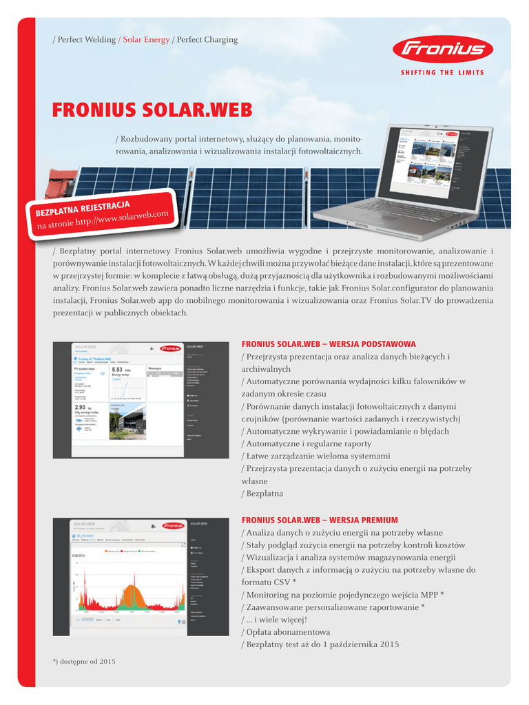 / Perfect Welding / Solar Energy / Perfect Charging Fronius solar.web / Rozbudowany portal internetowy, służący do planowania, monitorowania, analizowania i wizualizowania instalacji fotowoltaicznych. REJESTRACJA BEZPŁATNA .com ww.solarweb /w :/ p tt h ie n na stro / Bezpłatny portal internetowy Fronius Solar.web umożliwia wygodne i przejrzyste monitorowanie, analizowanie i porównywanie instalacji fotowoltaicznych. W każdej chwili można przywołać bieżące dane instalacji, które są prezentowane w przejrzystej formie: w komplecie z łatwą obsługą, dużą przyjaznością dla użytkownika i rozbudowanymi możliwościami analizy. Fronius Solar.web zawiera ponadto liczne narzędzia i funkcje, takie jak Fronius Solar.configurator do planowania instalacji, Fronius Solar.web app do mobilnego monitorowania i wizualizowania oraz Fronius Solar.TV do prowadzenia prezentacji w publicznych obiektach. FRONIUS SOLAR.WEB – WERSJA PODSTAWOWA / Przejrzysta prezentacja oraz analiza danych bieżących i archiwalnych / Automatyczne porównania wydajności kilku falowników w zadanym okresie czasu / Porównanie danych instalacji fotowoltaicznych z danymi czujników (porównanie wartości zadanych i rzeczywistych) / Automatyczne wykrywanie i powiadamianie o błędach / Automatyczne i regularne raporty / Łatwe zarządzanie wieloma systemami / Przejrzysta prezentacja danych o zużyciu energii na potrzeby własne / Bezpłatna FRONIUS SOLAR.WEB – WERSJA PREMIUM / Analiza danych o zużyciu energii na potrzeby własne / Stały podgląd zużycia energii na potrzeby kontroli kosztów / Wizualizacja i analiza systemów magazynowania energii / Eksport danych z informacją o zużyciu na potrzeby własne do formatu CSV * / Monitoring na poziomie pojedynczego wejścia MPP * / Zaawansowane personalizowane raportowanie * / ... i wiele więcej! / Opłata abonamentowa / Bezpłatny test aż do 1 października 2015 *) dostępne od 2015 FRONIUS SOLAR.WEB W SKRÓCIE / Planowanie instalacji online za pomocą Fronius Solar.configurator. Oprogramowanie zapewnia wsparcie w dokładnym projektowaniu instalacji fotowoltaicznych. / Mobilna wizualizacja za pomocą Fronius Solar.web App. Mobilny wariant usługi on-line pozwala na kontrolowanie uzysków z instalacji fotowoltaicznej w dowolnym czasie i w dowolnym miejscu. / Efektowna prezentacja za pomocą Fronius Solar.TV. Funkcja Public Display umożliwia przejrzystą prezentację najważniejszych parametrów instalacji fotowoltaicznej, na przykład wyprodukowanej energii lub osiągniętego zysku. WiFi lub LAN FALOWNIK FRONIUS Z KARTĄ DATAMANAGER router FRONIUS SOLAR.WEB połączenie danych przepływ energii / Warunkiem korzystania z usługi Fronius Solar.web jest wyposażenie falownika w kartę Datamanager (zintegrowana standardowo w falownikach Fronius Galvo. Fronius Symo oraz Fronius Symo Hybrid). Możliwa jest bezproblemowa późniejsza instalacja karty Fronius Datamanager lub wersji Fronius Datamanager Box. W celu prezentacji danych o zużyciu energii konieczne jest podłączenie do licznika energii. WYMAGANIA SYSTEMOWE: Aktualna przeglądarka internetowa z obsługą kodowania HTML 5 (np. Microsoft Internet Explorer 9, Google Chrome 18 lub Mozilla Firefox 11 lub nowsze). / Perfect Welding / Solar Energy / Perfect Charging DZIAŁAMY W TRZECH DZIEDZINACH, LECZ MAMY JEDNĄ PASJĘ: PRZESUWAMY GRANICE MOŻLIWOŚCI. / Nieważne, czy chodzi o spawalnictwo, fotowoltaikę, czy technologię ładowania akumulatorów — nasz cel jest jasno określony: być liderem w dziedzinie innowacyjności. Razem z około trzema tysiącami naszych pracowników na całym świecie przesuwamy granice możliwości, czego dowodem jest ponad 1000 przyznanych patentów. Tam, gdzie inni stawiają małe kroki, my wykonujemy skoki w rozwoju. Jak zawsze. Odpowiedzialne obchodzenie się z naszymi zasobami jest podstawą działalności naszej firmy. Dalsze informacje na temat wszystkich produktów firmy Fronius oraz naszych partnerów handlowych i przedstawicieli można uzyskać na stronie internetowej www.fronius.com as16 v04 Nov 2014 PL Fronius Schweiz AG Oberglatterstrasse 11 8153 Rümlang Schweiz [email protected] www.fronius.ch Fronius Deutschland GmbH Am Stockgraben 3 36119 Neuhof-Dorfborn bei Fulda Deutschland [email protected] www.fronius.de Fronius International GmbH Froniusplatz 1 4600 Wels Österreich [email protected] www.fronius.com PL v03 Feb 2015 GENERATOR PV Www Tekst i rysunki zgodne ze stanem technicznym w czasie przekazania do druku. Zmiany zastrzeżone. Wszystkie dane pomimo starannego opracowania są bez gwarancji i są wyłączone od odpowiedzialności. Prawo autorskie © 2011 Fronius™. Wszelkie prawa zastrzeżone. SCHEMAT POŁĄCZEŃ