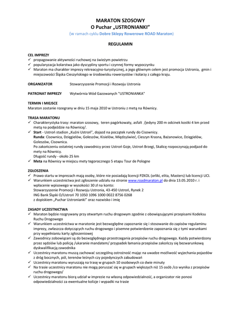 MARATON SZOSOWY O Puchar „USTRONIANKI” (w ramach cyklu Dobre Sklepy Rowerowe ROAD Maraton) REGULAMIN CEL IMPREZY propagowanie aktywności ruchowej na świeżym powietrzu popularyzacja kolarstwa jako dyscypliny sportu i czynnej formy wypoczynku Maraton ma charakter imprezy rekreacyjno-turystycznej, a jego głównym celem jest promocja Ustronia, gmin i miejscowości Śląska Cieszyoskiego w środowisku rowerzystów i kolarzy z całego kraju. ORGANIZATOR Stowarzyszenie Promocji i Rozwoju Ustronia PATRONAT IMPREZY Wytwórnia Wód Gazowanych "USTRONIANKA" TERMIN I MIEJSCE Maraton zostanie rozegrany w dniu 15 maja 2010 w Ustroniu z metą na Równicy. TRASA MARATONU Charakterystyka trasy: maraton szosowy, teren pagórkowaty, asfalt /jedyny 200 m odcinek kostki 4 km przed metą na podjeździe na Równicę/. Start - Ustroo stadion „Kuźni Ustroo”, dojazd na początek rundy do Cisownicy. Runda: Cisownica, Dzięgielów, Goleszów, Kisielów, Międzyświed, Cieszyn Krasna, Bażanowice, Dzięgielów, Goleszów, Cisownica. Po zakooczeniu ostatniej rundy zawodnicy przez Ustroo Goje, Ustroo Brzegi, Skalicę rozpoczynają podjazd do mety na Równicy. Długośd rundy - około 25 km Meta na Równicy w miejscu mety tegorocznego 5 etapu Tour de Pologne ZGŁOSZENIA Prawo startu w imprezach mają osoby, które nie posiadają licencji PZKOL (orliki, elita, Masters) lub licencji UCI. Warunkiem uczestnictwa jest zgłoszenie udziału na stronie www.roadmaraton.pl do dnia 13.05.2010 r. i wpłacenie wpisowego w wysokości 30 zł na konto: Stowarzyszenie Promocji i Rozwoju Ustronia, 43-450 Ustroo, Rynek 2 ING Bank Śląski O/Ustroo 70 1050 1096 1000 0022 8756 0268 z dopiskiem „Puchar Ustronianki” oraz nazwisko i imię ZASADY UCZESTNICTWA Maraton będzie rozgrywany przy otwartym ruchu drogowym zgodnie z obowiązującymi przepisami Kodeksu Ruchu Drogowego Warunkiem uczestnictwa w maratonie jest bezwzględne zapoznanie się i stosowanie do zapisów regulaminu imprezy, zwłaszcza dotyczących ruchu drogowego i pisemne potwierdzenie zapoznania się z tymi warunkami przy wypełnianiu karty zgłoszeniowej Zawodnicy zobowiązani są do bezwzględnego przestrzegania przepisów ruchu drogowego. Każdy potwierdzony przez sędziów lub policję /ukaranie mandatem/ przypadek łamania przepisów zakooczy się bezwarunkową dyskwalifikacją zawodnika Uczestnicy maratonu muszą zachowad szczególną ostrożnośd mając na uwadze możliwośd wyjechania pojazdów z dróg bocznych, pól, terenów leśnych czy pojedynczych zabudowao Uczestnicy maratonu wyruszają na trasę w grupach 10 osobowych co dwie minuty Na trasie uczestnicy maratonu nie mogą poruszad się w grupach większych niż 15 osób /co wynika z przepisów ruchu drogowego/ Uczestnicy maratonu biorą udział w imprezie na własną odpowiedzialnośd, a organizator nie ponosi odpowiedzialności za ewentualne kolizje i wypadki na trasie SPOSÓB PRZEPROWADZENIA MARATONU Maraton będzie rozgrywany przy otwartym ruchu drogowym zgodnie z obowiązującymi przepisami Kodeksu Ruchu Drogowego Na 5 km rundy organizator zapewnia punkt żywnościowy CZAS STARTU I DYSTANS 07:00 – 09:30 czas pracy biura zawodów 09:45 uroczyste otwarcie imprezy 10:00 start pierwszej grupy 18:00 dekoracja najlepszych uczestników, losowanie roweru szosowego DYSTANS MARATONU 73 km kategoria K1, K2 98 km kategoria E i M 148 km pozostałe kategorie 2 rundy + podjazd na Równicę 3 rundy + podjazd na Równicę 5 rund + podjazd na Równicę KATEGORIE KLASYFIKACYJNE Zgodnie z regulaminem cyklu Road Maraton www.roadmaraton.pl uczestnicy wyruszają na trasę w grupach 10 osobowych co dwie minuty. Grupa składad się będzie z osób tej samej kategorii klasyfikacyjnej Dopuszcza się możliwośd łączenia na starcie K1 z K2 Jeśli ostatnia grupa w danej kategorii klasyfikacyjnej liczy nie więcej niż 4 osoby – zostaje połączona z grupą przedostatnią Kolejnośd startu poszczególnych kategorii: K1, K2, A, B, C, D, E, M ZASADY FINANSOWANIA Uczestnicy Maratonu ponoszą koszty wpisowego, dojazdu, noclegu i wyżywienia we własnym zakresie Uczestnicy Maratonu są objęci ubezpieczeniem OC i NNW organizatora KLASYFIKACJA I NAGRODY Klasyfikacja prowadzona jest dla poszczególnych kategorii wiekowych. O miejscu decyduje czas przejazdu trasy przez uczestnika maratonu. Pominięcie punktu kontrolnego na rundzie powoduje zdyskwalifikowanie uczestnika. We wszystkich kategoriach prawidłowe zaliczenie mniejszej ilości rund wystarcza do umieszczenia na liście wyników imprezy - wtedy uzyskany czas przyjazdu na metę decyduje o kolejności po osobach które ukooczyły regulaminową ilośd rund. W każdej kategorii klasyfikacyjnej pierwszych sześciu zawodników otrzymuje puchary. Wszyscy uczestnicy otrzymują pamiątkowe dyplomy. Do klasyfikacji cyklu punkty zostaną zaliczone zgodnie z regulaminem dostępnym na www.roadmaraton.pl POSTANOWIENIA KOŃCOWE Każdy z uczestników imprezy zobowiązany jest do: Przestrzegania regulaminu imprezy i regulaminu cyklu Road Maraton Zachowania zasad bezpieczeostwa w ruchu drogowym Realizowania w trakcie imprezy poleceo policji i organizatorów imprezy Jazdy w kasku na całym dystansie Kulturalnego zachowywania się Samodzielnego pokonania wyznaczonej trasy Samodzielnego dotarcia do bazy maratonu w razie wycofania się na trasie Organizator nie zwraca wpisowego na 3 dni przed imprezą Organizator nie ponosi odpowiedzialności za rzeczy zaginione, oraz wypadki spowodowane z winy uczestnika W kwestiach spornych nie objętych regulaminem decyduje organizator imprezy i jego decyzja jest ostateczna Osobą odpowiedzialną za prawidłowe przeprowadzenie imprezy jest Andrzej Nowioski – Prezes Zarządu Stowarzyszenia Promocji i Rozwoju Ustronia