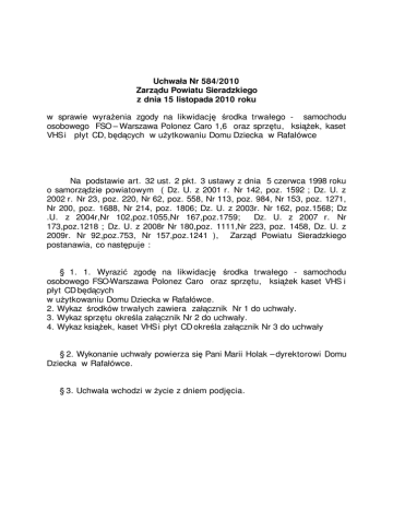 Uchwała Nr 584/2010 Zarządu Powiatu Sieradzkiego z dnia 15 listopada 2010 roku w sprawie wyrażenia zgody na likwidację środka trwałego - samochodu osobowego FSO – Warszawa Polonez Caro 1,6 oraz sprzętu, książek, kaset VHS i płyt CD, będących w użytkowaniu Domu Dziecka w Rafałówce Na podstawie art. 32 ust. 2 pkt. 3 ustawy z dnia 5 czerwca 1998 roku o samorządzie powiatowym ( Dz. U. z 2001 r. Nr 142, poz. 1592 ; Dz. U. z 2002 r. Nr 23, poz. 220, Nr 62, poz. 558, Nr 113, poz. 984, Nr 153, poz. 1271, Nr 200, poz. 1688, Nr 214, poz. 1806; Dz. U. z 2003r. Nr 162, poz.1568; Dz .U. z 2004r,Nr 102,poz.1055,Nr 167,poz.1759; Dz. U. z 2007 r. Nr 173,poz.1218 ; Dz. U. z 2008r Nr 180,poz. 1111,Nr 223, poz. 1458, Dz. U. z 2009r. Nr 92,poz.753, Nr 157,poz.1241 ), Zarząd Powiatu Sieradzkiego postanawia, co następuje : § 1. 1. Wyrazić zgodę na likwidację środka trwałego - samochodu osobowego FSO-Warszawa Polonez Caro oraz sprzętu, książek kaset VHS i płyt CD będących w użytkowaniu Domu Dziecka w Rafałówce. 2. Wykaz środków trwałych zawiera załącznik Nr 1 do uchwały. 3. Wykaz sprzętu określa załącznik Nr 2 do uchwały. 4. Wykaz książek, kaset VHS i płyt CD określa załącznik Nr 3 do uchwały § 2. Wykonanie uchwały powierza się Pani Marii Holak – dyrektorowi Domu Dziecka w Rafałówce. § 3. Uchwała wchodzi w życie z dniem podjęcia. Załącznik Nr 1 do uchwały Nr 584/2010 Zarządu Powiatu Sieradzkiego z dnia 15 listopada 2010 roku Wykaz środków trwałych przeznaczonych do likwidacji, będących w użytkowaniu Domu Dziecka w Rafałówce Lp Symbol Nazwa przedmiotu . Rok zakupu 1. 23.11.200 4 dar, rok produk. 1995 G8P74/ R741/1 FSO-Warszawa Polonez Caro 1,6 Nr silnika : CE0271824 Nr nadwozia: SVPB01CEHSW 789078 Razem : Iloś ć 1 Cena jednostk owa 19 117,4 0 Wartość (zł) 19 117,40 19 117,40 zł Umo – rze nie 100% Załącznik Nr2 do uchwały Nr 584/2010 Zarządu Powiatu Sieradzkiego z dnia 15 listopada 2010 roku Wykaz sprzętu przeznaczonego do likwidacji, będącego w użytkowaniu Domu Dziecka w Rafałówce Lp Symbol . Nazwa przedmiotu Rok zakupu 1. Wieża Hi-FI 2001 ( dar ) 2004 ( dar) 2. 3. 4. 5. 6. 7. 8. 9. 10 . 11 . 12 . Dz .I, cz. D, poz. 1 Dz. I, cz. D, poz. 3 Dz. I,cz .A, poz.5 Dz.II,cz.B , poz.3 Dz. II, cz. B, poz. 4 Wieża stereo Sony Komputer Compaq Aparat telefoniczny Patryk Aparat telef. bezprzew.S iemens typ Gigaset 4010 Dz.III,cz.A Biurko BT-80 ,poz.1 Dz.III,czB, Kanapa poz.12 Dz III, Krzesło cz.C, poz. 14 Dz.III,cz.C Krzesło ,poz. 14 Dz.III,cz.D Krzesełeczko ,poz. 2 żłobkowe Dz.III, cz Krzesełeczka D, poz. 1 przedszkolne Dz III. Tapczan cz.E , Iloś ć Wartość ( zł ) 1 Cena jednostk owa 1500,00 1500,00 Umo – rze nie 100% 1 200,00 200,00 100% 2004 ( dar ) 1 80,00 80,00 100% 2002 1 65,00 65,00 100% 2002 1 387,50 387,50 100% 1993 1 153,00 153,00 100% 2008 ( dar ) 2001 1 800,00 800,00 100% 1 160,00 160,00 100% 2001 2 155,00 310,00 100% 1995 5 18,00 90,00 100% 1993 19 0,11 2,09 100% 2001 3 594,25 1782,75 100% 13 . 14 . 15 . 16 . 17 . 18 . 19 . 20 . 21 22 23 . 24 . 25 . 26 . 27 . 28 . 29 . 30 poz. 4 Dz.III,cz.F , poz.1 Dz.III,cz.F , poz. 3 Dz.III,cz.F , poz. 4 Dz.III,cz.F , poz.4 Dz.III, cz.G, poz.4 Dz.III,cz. H,poz. 4 Dz.III,cz. N,poz. 1 Dz.III,cz. N,poz. 2 Dz.III,cz O poz. ,1 Dz.III,cz.R poz.2 Dz.IV cz.B,poz. 1 Dz.IV,cz.B .poz..2 Dz.IV,cz B, poz..3 Dz.IV, cz. C,poz.3 Dz.V,cz.B , poz. 8 Dz.V,cz B, poz. 4 Dz. V,cz.B, poz. 6 Dz.V,cz.C Łóżeczka dzieci.szpitalne 1993 4 0,10 0,40 100% Łóżeczko drewn. 2001 2 170,00 340,00 100% Łóżeczko drewn. 2001 1 158,99 158,99 100% Łóżeczko drewn. 2001 3 160,00 480,00 100% Łóżko piętrowe 2003 1 1184,00 1184,00 100% Regał R-40 na zabawki Szafki stojące 1993 1 92,00 92,00 100% 1993 8 0,10 0,80 100% Szafki wiszące 1993 8 0,10 0,80 100% Stolik pod telewizor Stolik przedszk.Ania Kojec dla dzieci 1993 1 47,00 47,00 100% 1993 3 0,05 0,15 100% 1993 1 0,03 0,03 100% Kojec duzy 2002 1 308,70 308,70 100% Kojec Jaś 2002 1 189,90 189,90 100% Leżaczek 2004 1 40,00 40,00 100% Inhalator Thomex L2 1993 1 10,86 10,86 100% Waga niemowlęca 1993 3 0,16 0,48 100% Lampa bakt wisząca 1993 5 0,18 0,90 100% Wziernik laryngol 1993 1kpl 0,04 0,04 100% . 31 32 . 33 34 . 35 . 36 . 37 . 38 . 39 . 40 . 41 . 42 . 43 44 . 45 . 46 . 47 . 48 , poz. 1 Dz.V,cz C,poz. 2 Dz.V,cz.C , poz. 4 Dz.V,cz.C . poz. Dz.V,cz.C , poz. 6 Dz.VI, cz G, poz. 1 Dz.VII, cz.D,poz. 4 Dz.VII,cz. D,poz.5 Dz.VII,cz. E,poz. 1 Dz.VII,cz. F,poz. 3 Dz.VII, cz F,poz. 3 Dz.IX,cz.A ,poz.11 Dz.IX,cz.A ,poz.12 Dz. IX, cz , poz. 4 Dz. I X, cz. B, poz. 5 Dz.IX,cz B,poz. 6 Dz.X,cz A,poz. 2 Dz.III ,cz.I, poz.8 Dz.VIII, Lampa Klara 1993 1 0,38 0,38 100% Aparat do mierzenia ciśnienia Aparat do mierzenia ciśnienia 1993 2 0,06 0,12 100% 1993 1 0,24 0,24 100% Słuchawki lekarskie 1993 1 0,06 0,06 100% Termos obiadowy 1993 2 2,50 5,00 100% Wózek 2-osobowy 1993 1 3,62 3,62 100% Wózek głęboki 1996 1 207,00 207,00 100% Rowerek 1996 2 89,00 178,00 100% Chodzik 1996 1 34,73 34,73 100% Chodzik 1996 1 34,72 34,72 100% Dywanik 2001 1 100,00 100,00 100% Dywanik 2001 1 100,00 100,00 100% Wykładzina 1997 10, 8 3,423 36,97 100% Wykładzina 2002 18, 0 40,66 731,88 100% Wykładzina 2003 40,80 489,60 100% Śmietnik na szlakę 1993 12, 0 1 1,37 1,37 100% Półka na buty 2007 2 30,00 60,00 100% Lampki biurkowe 2004 2 20,00 40,00 100% . 49 . 50 . cz.C, poz. 8 Dz.VIII, Lampki biurkowe cz. C,poz. 9 Dz.I,cz.D, Wieża Daewoo poz. 7 Razem : 2004 4 20,00 80,00 100% 2008 1 279,00 279,00 100% 10 768,08 zł Załącznik Nr3 do uchwały Nr 584/2010 Zarządu Powiatu Sieradzkiego z dnia 15 listopada 2010 roku Wykaz książek, kaset VHS i płyt CD przeznaczonych do likwidacji, będących w użytkowaniu Domu Dziecka w Rafałówce Lp Symbol . 1. 2. 3. 4. 5. 6. 7. 8. 9. 10 . 11 . 12 . 13 . 14 . 15 Nazwa przedmiotu Pan Tadeusz Epoki literackie Encyklopedia Memo Larousse tom. VI poz.113 Ilustrowana historia świata tom IV poz.114 Ilustrowana historia świata tom V poz. 310 Kodeks p