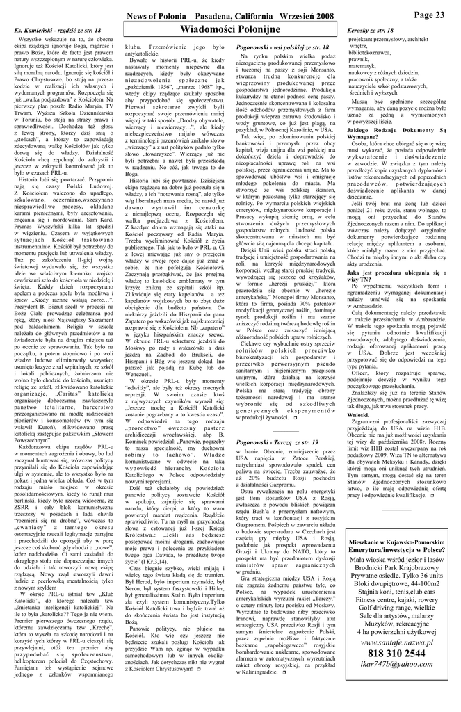 Page 23 News of Polonia Pasadena, California Wrzesień 2008 Ks. Kamieński - rządzić ze str. 18 Wszystko wskazuje na to, że obecna ekipa rządząca ignoruje Boga, mądrość i prawo Boże, które de facto jest prawem natury wszczepionym w naturę człowieka. Ignoruje też Kościół Katolicki, który jest siłą moralną narodu. Ignoruje się kościół i Prawo Chrystusowe, bo stoją na przeszkodzie w realizacji ich własnych i wydumanych programów. Rozpoczęła się już „walka podjazdowa” z Kościołem. Na pierwszy plan poszło Radio Maryia, TV Trwam, Wyższa Szkoła Dziennikarska w Toruniu, bo stoją na straży prawa i sprawiedliwości. Dochodzą też głosy z lewej strony, którzy dziś śnią o „stołkach”, a którzy to zapowiadają zdecydowaną walkę Kościołów jak tylko dorwą się do władzy. Działalność Kościoła chcą zepchnąć do zakrystii i jeszcze w zakrystii kontrolować jak to było w czasach PRL-u. Historia lubi się powtarzać. Przypominają się czasy Polski Ludowej. Z Kościołem walczono do upadłego, szkalowano, oczerniano,wszczynano niesprawiedliwe procesy, okładano karami pieniężnymi, były aresztowania, znęcania się i mordowania. Sam Kard. Prymas Wyszyński kilka lat spędził w więzieniu. Czasem w wyjątkowych s yt u acj a c h Ko ś ció ł t r a kto wa no instrumentalnie. Kościół był potrzebny do momentu przejęcia lub utrwalenia władzy. Tuż po zakończeniu II-giej wojny światowej wydawało się, że wszystko idzie we właściwym kierunku: wojsko czwórkami szło do koścvioła w niedzielę i święta. Każdy dzień rozpoczynano apelem a podczas apelu była modlitwa i śpiew „Kiedy raznne wstają zorze…”. Prezydent B. Bierut szedł w procesji na Boże Ciało prowadząc celebransa pod rękę, który niósł Najświętszy Sakrament pod baldachimem. Religia w szkole należała do głównych przedmiotów a na świadectwie była na drugim miejscu tuż po ocenie ze sprawowania. Tak było na początku, a potem stopniowo i po woli władze ludowe eliminowały wszystko; usunięto krzyże z sal szpitalnych, ze szkół i lokali poblicznych, żołnierzom nie wolno było chodzić do kościoła, usunięto religię ze szkół, zlikwidowano katolickie organizacje, „Caritas” katolicką organizację doboczynną zawłaszczyło państwo to talitarne, har cer st wo przeorganizowano na modłę radzieckich pionierów i komsomołców (w tym się wsławił Kuroń), zlikwidowano prasę katolicką zastępujac paksowkim „Słowem Powszechnym”. Każdorazowa ekipa rządów PRL-u w momentach zagrożenia i obawy, bo lud zaczynał buntować się, wówczas politycy przymilali się do Kościoła zapowiadając ulgi w systemie, ale to wszystko było na pokaz i jedna wielka obłuda. Coś w tym rodzaju miało miejsce w okresie posolidarnościowym, kiedy to runął mur berliński, kiedy było rzeczą widoczną, że ZSRR i cały blok komunistyczny trzeszczy w posadach i lada chwila “rozmieni się na drobne”, wówczas to „c waniac y” z ta mte g o o kr esu ostentacyjnie rzucali legitymacje partyjne i przechodzili do opozycji aby w porę jeszcze coś skubnać gdy chodzi o „nowe”, które nadchodziło. Ci sami zasiadali do okrągłego stołu nie dopuszczajac innych do udziału i tak utworzyli nową ekipę rządzącą. Nowy rząd stworzyli dawni ludzie z peerlowską mentalnością tylko z nowym szyldem W okrsie PRL-u istniał tzw „Klub Katolicki”, do którego należała tzw „śmietanka inteligencji katolickiej”. Na ile to była „katolicka?? Tego ja nie wiem. Premier pierwszego ówczesnego rządu, któremu zawdzięczamy tzw „Krechę”, która to wyszła na szkodę narodowi i na korzyść tych którzy w PRL-u cieszyli się przywlejami, otóż ten premier aby przypodobać się spoleczenstwu, helikopterem poleciał do Częstochowy. Pamiętam też wystąpienie sejmowe jednego z członków wspomnianego Wiadomości Polonijne klubu. Przemówienie jego było antykatolickie. Bywało w historii PRL-u, że kiedy nastawały momenty niepewne dla rządzących, kiedy były okazywane n i e z a d o wo l e n i a s p o ł e c z n e j a k „październik 1956”, „marzec 1968” itp., wtedy ekipy rządzące szukały sposobu aby przypodobać się społeczeństwu. Pierwsi sekretarze zwykli byli rozpoczynać swoje przemówienia mniej więcej w taki sposób: „Drodzy obywatele, wierzący i niewierzący…”, ale kiedy niebezpieczeństwo mijało wówczas z terminologii przemówień znikało slowo „wierzący” a z ust polityków padało tylko słowo „towarzysze”. Wierzący już nie byli potrzebni a nawet byli przeszkodą w rządzeniu. No cóż, jak trwoga to do Boga. Historia lubi się powtarzać. Dzisiejsza ekipa rządząca na dobre już poczuła się u władzy, a ich “notowania rosną”, ale tylko w/g liberalnych mass media, bo naród już d a wn o wys t a wi ł i m cen z ur kę z nienajlepszą oceną. Rozpoczęła się walka podjazdowa z Kościołem. Z każdym dniem wzmagają się ataki na Kościół począwszy od Radia Maryia. Trzeba wyeliminować Kościół z życia publicznego. Tak jak to było w PRL-u. Ci z lewej miewając już sny o przejęciu władzy w swoje ręce dając już znać o sobie, że nie pofolgują Kościołowi. Zaczynają przebąkiwać, że jak przejmą władzę to katolickie emblematy w tym krzyże znikną ze szpitali szkół itp. Zlikwiduje się etaty kapelanów a też kapelanów wojskowych bo to zbyt duże obciążenie dla budżetu państwa. Co niektórzy jeździli do Hiszpanii do pana Zapatero po wskazówki jak najskuteczniej rozprawić się z Kościołem. Nb „zapatero” w języku hiszpańskim znaczy szewc. W okresie PRL-u sekretarze jeździli do Moskwy po rady i wskazówki a dziś jeżdżą na Zachód do Brukseli, do Hiszpanii i Bóg wie jeszcze dokąd. Ino patrzeć jak pojadą na Kubę lub do Wenezueli. W okresie PRL-u były momenty “odwilży”, ale były też okresy mocnych represji. W swoim czasie ktoś z najwyższych