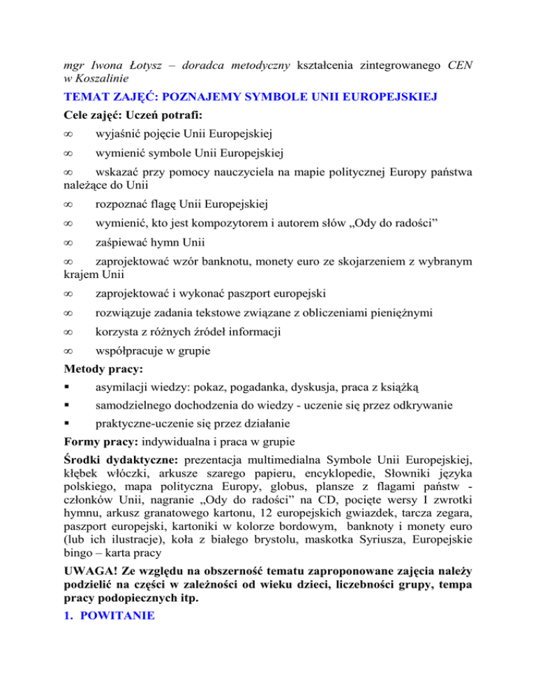 mgr Iwona Łotysz – doradca metodyczny kształcenia zintegrowanego CEN w Koszalinie TEMAT ZAJĘĆ: POZNAJEMY SYMBOLE UNII EUROPEJSKIEJ Cele zajęć: Uczeń potrafi: • wyjaśnić pojęcie Unii Europejskiej • wymienić symbole Unii Europejskiej • wskazać przy pomocy nauczyciela na mapie politycznej Europy państwa naleŜące do Unii • rozpoznać flagę Unii Europejskiej • wymienić, kto jest kompozytorem i autorem słów „Ody do radości” • zaśpiewać hymn Unii • zaprojektować wzór banknotu, monety euro ze skojarzeniem z wybranym krajem Unii • zaprojektować i wykonać paszport europejski • rozwiązuje zadania tekstowe związane z obliczeniami pienięŜnymi • korzysta z róŜnych źródeł informacji • współpracuje w grupie Metody pracy: asymilacji wiedzy: pokaz, pogadanka, dyskusja, praca z ksiąŜką samodzielnego dochodzenia do wiedzy - uczenie się przez odkrywanie praktyczne-uczenie się przez działanie Formy pracy: indywidualna i praca w grupie Środki dydaktyczne: prezentacja multimedialna Symbole Unii Europejskiej, kłębek włóczki, arkusze szarego papieru, encyklopedie, Słowniki języka polskiego, mapa polityczna Europy, globus, plansze z flagami państw członków Unii, nagranie „Ody do radości” na CD, pocięte wersy I zwrotki hymnu, arkusz granatowego kartonu, 12 europejskich gwiazdek, tarcza zegara, paszport europejski, kartoniki w kolorze bordowym, banknoty i monety euro (lub ich ilustracje), koła z białego brystolu, maskotka Syriusza, Europejskie bingo – karta pracy UWAGA! Ze względu na obszerność tematu zaproponowane zajęcia naleŜy podzielić na części w zaleŜności od wieku dzieci, liczebności grupy, tempa pracy podopiecznych itp. 1. POWITANIE Uczniowie wraz z prowadzącym zajęcia stoją w kole i rzucają do siebie kłębkiem włóczki – tworząc pajączka – wymieniając przy tym imię osoby i cechę, za którą ją lubią. Kiedy zostanie utworzona sieć, dzieci odpowiadają na pytanie: Co nas ze sobą łączy? – nić koleŜeństwa, przyjaźni... . Sieć naleŜy ostroŜnie odłoŜyć na wcześniej przygotowany szary papier i przykleić. 2. POJĘCIE „UNIA” I „UNIA EUROPEJSKA” Ćwiczenie 1. Dzieci tworzą 3-4 osobowe zespoły, a następnie z encyklopedii i słowników języka polskiego wyszukują definicję słowa „unia”. Po wykonaniu zadania kaŜda grupa głośno odczytuje znalezioną informację. W celu uporządkowania wyszukanych wiadomości nauczyciel prezentuje definicję (prezentacja multimedialna Symbole Unii Europejskiej) i wyjaśnia trudne do zrozumienia wyrazy. Porównanie Unii do grupy klasowej, w której wzajemne relacje opierają się na sympatii i przyjaźni, wszyscy znają i przestrzegają określonych zasad, wspólnie podejmują decyzje dotyczące spraw grupy, współpracują ze sobą i pomagają sobie, czynnie uczestniczą w Ŝyciu grupy, maja wspólną nazwę. Ćwiczenie 2. Nauczyciel wiesza mapę polityczną Europy. Rozdaje uczniom kartki z wyrysowaną w rogu mini flagą i wypisaną nazwą państwa. Na pozostałej części kartki dzieci rysują sceny z codziennego Ŝycia, swoje marzenia – to co naprawdę buduje Zjednoczoną Europę. Następnie uczeń stara się z pomocą nauczyciela odnaleźć kraj na mapie i przypiąć kartkę z flagą na jego terytorium. 3. HYMN EUROPEJSKI Ćwiczenie 1. Uczniowie w grupach otrzymują tekst hymnu, czytają go i analizują jego treść. Liczą, ile razy w tekście występuje słowo (z wszelkimi odmianami) brat, radość, miłość. Ćwiczenie 2. Uczniowie w grupach otrzymują pocięte wersy I zwrotki hymnu. Następnie układają je w prawidłowej kolejności. Ćwiczenie 3.Pod kierunkiem nauczyciela wspólnie śpiewają, przyjmując właściwą postawę 4. FLAGA UNII EUROPEJSKIEJ Ćwiczenie 1. Nauczyciel przygotowuje dwanaście gwiazd. Uczniowie szukają i zapisują na gwiazdach skojarzenia: • co do kolorów flagi (np. lazurowe morze, niebo, szafiry, kolor tęczy, błękitną planetę) • i liczby gwiazdek na fladze (np. 12 miesięcy, 12 godzin na zegarze 12 znaków zodiaku, tuzin, 12 apostołów) Uczniowie umieszczają gwiazdki na tarczy zegarowej i przyklejają na granatowe tło. Ćwiczenie 2. Uczniowie próbują w oparciu o własne informacje wyjaśnić wygląd flagi UE. Następnie nauczyciel wyświetla prezentację i opowiada o unijnej fladze. 5. PASZPORT EUROPEJSKI Nauczyciel prezentuje paszport europejski. Omawia jego zawartość. Opowiada historię powstania tego symbolu europejskiego. Ćwiczenie 1. KaŜdy uczeń samodzielnie wykonuje polski wzór paszportu, na przygotowanych wcześniej kartonikach w kolorze burgundzkiego wina. Następnie wklejają do środka swoje zdjęcie i wpisują w odpowiednie rubryki następujące dane: • Imię i nazwisko • Adres zamieszkania • Narodowość • Obywatelstwo • Stan cywilny • Własnoręczny podpis 6. WALUTA EURO Nauczyciel prezentuje monety euro lub ich wzory – wyjaśnia pochodzenie znaku graficznego euro. Ćwiczenie 1. Nauczyciel przygotowuje pewną ilość kół wyciętych z białego brystolu. KaŜdy uczeń z jednej strony przygotowanej „monety rysuje wspólny dla całej Unii awers, na rewersie zaś, co kojarzy mu się z jednym z europejskich krajów (np. wieŜa Eiffla – moneta francuska, Krecik – moneta czeska, pizza – moneta włoska, Smerfy – moneta belgijska itp.). Po zakończeniu rysowania dzieci mogą przedstawić reszcie klasy swoją pracę, by ta mogła zgadnąć jej „pochodzenie”. Ćwiczenie 1. Rozwiązywanie zadań tekstowych: a) b) Zosia ma 42 euro, a jej siostra o 20 euro mniej. Ile euro ma siostra Zosi? Ile euro mają razem? c) Jedno euro w kantorze kosztuje 4zł. Ile będzie kosztować 30 euro? 7. MASKOTKA UE – SYRIUSZ Nauczyciel prezentuje symbol Unii Europejskiej – maskotkę Syriusza. Ćwiczenie 1. Nauczyciel ogłasza konkurs grupowy Pt.: „Polska maskotka unijna”. Po wykonaniu następuje prezentacja na forum i wspólne oglądanie propozycji grup, a lid