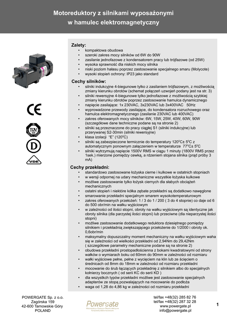 Motoreduktory z silnikami wyposażonymi w hamulec elektromagnetyczny Zalety: • • • • • • kompaktowa obudowa szeroki zakres mocy silników od 6W do 90W zasilanie jednofazowe z kondensatorem pracy lub trójfazowe (od 25W) wysoka sprawność dla niskich mocy silnika niski poziom hałasu poprzez zastosowanie specjalnego smaru (Molycote) wysoki stopień ochrony: IP23 jako standard Cechy silników: • • • • • • • • • silniki indukcyjne 4-biegunowe tylko z zasilaniem trójfazowym, z możliwością zmiany kierunku obrotów (schemat połączeń uzwojeń podany jest na str. 3) silniki rewersyjne 4-biegunowe tylko jednofazowe z możliwością szybkiej zmiany kierunku obrotów poprzez zastosowanie hamulca dynamicznego napięcie zasilające: 1x 230VAC, 3x230VAC lub 3x400VAC 50Hz wyprowadzone przewody zasilające, do kondensatora rozruchowego oraz hamulca elektromagnetycznego (zasilanie 230VAC lub 400VAC) zakres oferowanych mocy silników: 6W, 15W, 25W, 40W, 60W, 90W (szczegółowe dane techniczne podane są na stronie 2) silniki są przeznaczone do pracy ciągłej S1 (silniki indukcyjne) lub przerywanej S2-30min (silniki rewersyjne) klasa izolacji “E” (1200C) silniki są zabezpieczone termicznie do temperatury 1200C± 50C z automatycznym ponownym załączeniem w temperaturze 770C± 50C silniki wytrzymują napięcie 1500V RMS w ciągu 1 minuty (1800V RMS przez 1sek.) mierzone pomiędzy cewką, a rdzeniem stojana silnika (prąd próby 3 mA) Cechy przekładni: • • • • • • • • • • • • • • POWERGATE Sp. z o.o. Zagórska 159 42-600 Tarnowskie Góry POLAND standardowo zastosowane łożyska cierne i kulkowe w ostatnich stopniach w wersji odpornej na udary mechaniczne wszystkie łożyska kulkowe możliwe zastosowanie tylko łożysk ciernych dla słabych obciążeń mechanicznych ostatni stopień i niektóre kółka zębate przekładni są dodatkowo nawęglone smarowanie przekładni specjalnym smarem wysokotemperaturowym zakres oferowanych przełożeń: 1 / 3 do 1 / 200 ( 3 do 4 stopnie) co daje od 6 do 500 obr/min na wałku wyjściowym w zależności od ilości stopni, obroty na wałku wyjściowym są identyczne jak obroty silnika (dla parzystej ilości stopni) lub przeciwne (dla nieparzystej ilości stopni) możliwe zastosowanie dodatkowego reduktora dziesiętnego pomiędzy silnikiem i przekładnią zwiększającego przełożenie do 1/2000 i obroty ok. 0,6obr/min maksymalny dopuszczalny moment mechaniczny na wałku wyjściowym waha się w zależności od wielkości przekładni od 2,94Nm do 29,42Nm ( szczegółowe parametry mechaniczne podane są na stronie 2) obudowa przekładni prostopadłościenna z bokami kwadratowymi od strony wałków o wymiarach boku od 60mm do 90mm w zależności od rozmiaru wałki wyjściowe pełne, pełne z wycięciem na klin lub ze ścięciem o średnicach od 8mm do 18mm w zależności od rozmiaru przekładni mocowanie do śrub łączących przekładnię z silnikiem albo do specjalnych kołnierzy bocznych ( od serii KC do serii KD ) dla wszystkch typów przekładni możliwe jest zastosowanie specjalnych adapterów ze stopą pozwalających na mocowanie do podłoża waga od 1,28 do 4,86 kg w zależności od rozmiaru przekładni tel/fax +48(32) 285 82 76 tel/fax +48(32) 287 32 28 www.powergate.pl [email protected] 1 Motoreduktory z silnikami wyposażonymi w hamulec elektromagnetyczny Dane techniczne na przykładzie silników o mocy 40W z hamulcem elektromagnetycznym: Dostępne przełożenia przekładni i odpowiadające im prędkości oraz momenty, dla silnika o mocy 40W, przy częstotliwości sieci 50Hz i dla prędkości synchronicznej 1500obr/min: POWERGATE Sp. z o.o. Zagórska 159 42-600 Tarnowskie Góry POLAND tel/fax +48(32) 285 82 76 tel/fax +48(32) 287 32 28 www.powergate.pl [email protected] 2 Motoreduktory z silnikami wyposażonymi w hamulec elektromagnetyczny Rysunki techniczne dla silników rewersyjnych o mocy 40W: Schematy podłączenia i przełączania kierunku obrotów dla silników 40W: POWERGATE Sp. z o.o. Zagórska 159 42-600 Tarnowskie Góry POLAND tel/fax +48(32) 285 82 76 tel/fax +48(32) 287 32 28 www.powergate.pl [email protected] 3