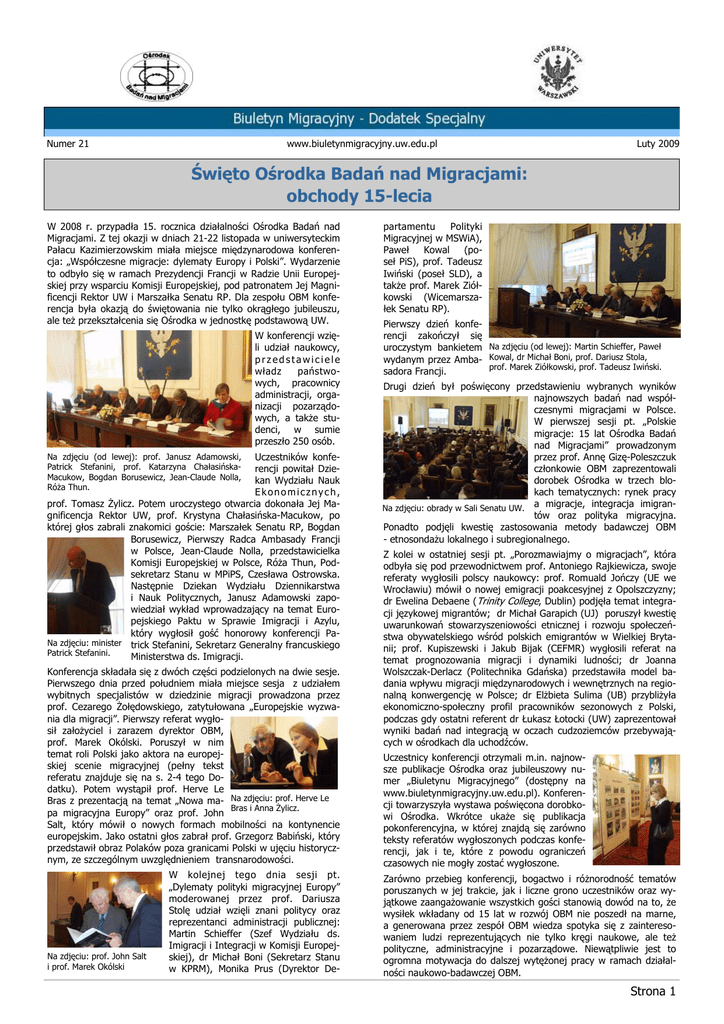 Numer 21 www.biuletynmigracyjny.uw.edu.pl Luty 2009 Święto Ośrodka Badań nad Migracjami: obchody 15-lecia W 2008 r. przypadła 15. rocznica działalności Ośrodka Badań nad Migracjami. Z tej okazji w dniach 21-22 listopada w uniwersyteckim Pałacu Kazimierzowskim miała miejsce międzynarodowa konferencja: „Współczesne migracje: dylematy Europy i Polski”. Wydarzenie to odbyło się w ramach Prezydencji Francji w Radzie Unii Europejskiej przy wsparciu Komisji Europejskiej, pod patronatem Jej Magnificencji Rektor UW i Marszałka Senatu RP. Dla zespołu OBM konferencja była okazją do świętowania nie tylko okrągłego jubileuszu, ale też przekształcenia się Ośrodka w jednostkę podstawową UW. W konferencji wzięli udział naukowcy, przedstawiciele władz państwowych, pracownicy administracji, organizacji pozarządowych, a także studenci, w sumie przeszło 250 osób. Uczestników konferencji powitał Dziekan Wydziału Nauk Ekonomicznych, prof. Tomasz Żylicz. Potem uroczystego otwarcia dokonała Jej Magnificencja Rektor UW, prof. Krystyna Chałasińska-Macukow, po której głos zabrali znakomici goście: Marszałek Senatu RP, Bogdan Borusewicz, Pierwszy Radca Ambasady Francji w Polsce, Jean-Claude Nolla, przedstawicielka Komisji Europejskiej w Polsce, Róża Thun, Podsekretarz Stanu w MPiPS, Czesława Ostrowska. Następnie Dziekan Wydziału Dziennikarstwa i Nauk Politycznych, Janusz Adamowski zapowiedział wykład wprowadzający na temat Europejskiego Paktu w Sprawie Imigracji i Azylu, który wygłosił gość honorowy konferencji PaNa zdjęciu: minister trick Stefanini, Sekretarz Generalny francuskiego Patrick Stefanini. Ministerstwa ds. Imigracji. Na zdjęciu (od lewej): prof. Janusz Adamowski, Patrick Stefanini, prof. Katarzyna ChałasińskaMacukow, Bogdan Borusewicz, Jean-Claude Nolla, Róża Thun. Konferencja składała się z dwóch części podzielonych na dwie sesje. Pierwszego dnia przed południem miała miejsce sesja z udziałem wybitnych specjalistów w dziedzinie migracji prowadzona przez prof. Cezarego Żołędowskiego, zatytułowana „Europejskie wyzwania dla migracji”. Pierwszy referat wygłosił założyciel i zarazem dyrektor OBM, prof. Marek Okólski. Poruszył w nim temat roli Polski jako aktora na europejskiej scenie migracyjnej (pełny tekst referatu znajduje się na s. 2-4 tego Dodatku). Potem wystąpił prof. Herve Le Bras z prezentacją na temat „Nowa ma- Na zdjęciu: prof. Herve Le Bras i Anna Żylicz. pa migracyjna Europy” oraz prof. John Salt, który mówił o nowych formach mobilności na kontynencie europejskim. Jako ostatni głos zabrał prof. Grzegorz Babiński, który przedstawił obraz Polaków poza granicami Polski w ujęciu historycznym, ze szczególnym uwzględnieniem transnarodowości. Na zdjęciu: prof. John Salt i prof. Marek Okólski W kolejnej tego dnia sesji pt. „Dylematy polityki migracyjnej Europy” moderowanej przez prof. Dariusza Stolę udział wzięli znani politycy oraz reprezentanci administracji publicznej: Martin Schieffer (Szef Wydziału ds. Imigracji i Integracji w Komisji Europejskiej), dr Michał Boni (Sekretarz Stanu w KPRM), Monika Prus (Dyrektor De- partamentu Polityki Migracyjnej w MSWiA), Paweł Kowal (poseł PiS), prof. Tadeusz Iwiński (poseł SLD), a także prof. Marek Ziółkowski (Wicemarszałek Senatu RP). Pierwszy dzień konferencji zakończył się uroczystym bankietem Na zdjęciu (od lewej): Martin Schieffer, Paweł wydanym przez Amba- Kowal, dr Michał Boni, prof. Dariusz Stola, prof. Marek Ziółkowski, prof. Tadeusz Iwiński. sadora Francji. Drugi dzień był poświęcony przedstawieniu wybranych wyników najnowszych badań nad współczesnymi migracjami w Polsce. W pierwszej sesji pt. „Polskie migracje: 15 lat Ośrodka Badań nad Migracjami” prowadzonym przez prof. Annę Gizę-Poleszczuk członkowie OBM zaprezentowali dorobek Ośrodka w trzech blokach tematycznych: rynek pracy Na zdjęciu: obrady w Sali Senatu UW. a migracje, integracja imigrantów oraz polityka migracyjna. Ponadto podjęli kwestię zastosowania metody badawczej OBM - etnosondażu lokalnego i subregionalnego. Z kolei w ostatniej sesji pt. „Porozmawiajmy o migracjach”, która odbyła się pod przewodnictwem prof. Antoniego Rajkiewicza, swoje referaty wygłosili polscy naukowcy: prof. Romuald Jończy (UE we Wrocławiu) mówił o nowej emigracji poakcesyjnej z Opolszczyzny; dr Ewelina Debaene (Trinity College, Dublin) podjęła temat integracji językowej migrantów; dr Michał Garapich (UJ) poruszył kwestię uwarunkowań stowarzyszeniowości etnicznej i rozwoju społeczeństwa obywatelskiego wśród polskich emigrantów w Wielkiej Brytanii; prof. Kupiszewski i Jakub Bijak (CEFMR) wygłosili referat na temat prognozowania migracji i dynamiki ludności; dr Joanna Wolszczak-Derlacz (Politechnika Gdańska) przedstawiła model badania wpływu migracji międzynarodowych i wewnętrznych na regionalną konwergencję w Polsce; dr Elżbieta Sulima (UB) przybliżyła ekonomiczno-społeczny profil pracowników sezonowych z Polski, podczas gdy ostatni referent dr Łukasz Łotocki (UW) zaprezentował wyniki badań nad integracją w oczach cudzoziemców przebywających w ośrodkach dla uchodźców. Uczestnicy konferencji otrzymali m.in. najnowsze publikacje Ośrodka oraz jubileuszowy numer „Biuletynu Migracyjnego” (dostępny na www.biuletynmigracyjny.uw.edu.pl). Konferencji towarzyszyła wystawa poświęcona dorobkowi Ośrodka. Wkrótce ukaże się publikacja pokonferencyjna, w której znajdą się zarówno teksty referatów wygłoszonych podczas konferencji, jak i te, które z powodu ograniczeń czasowych nie mogły zostać wygłoszone. Zarówno przebieg konferencji, bogactwo i różnorodność tematów poruszanych w jej trakcie, jak i liczne grono uczestników oraz wyjątkowe zaangażowanie wszystkich gości stanowią dowód na to, że wysiłek wkładany od 15 lat w rozwój OBM nie poszedł na marne, a generowana przez zes