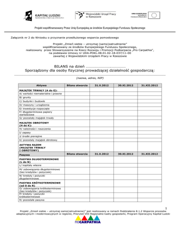 Projekt współfinansowany Przez Unię Europejską ze środków Europejskiego Funduszu Społecznego Załącznik nr 2 do Wniosku o przyznanie przedłużonego wsparcia pomostowego Projekt „Zmień siebie – utrzymaj (samo)zatrudnienie” współfinansowany ze środków Europejskiego Funduszu Społecznego, realizowany przez Stowarzyszenie na Rzecz Rozwoju i Promocji Podkarpacia „Pro Carpathia”, na podstawie Umowy nr UDA-POKL.08.01.02-18-037/11-00 zawartej z Wojewódzkim Urzędem Pracy w Rzeszowie BILANS na dzień …………………….…………… Sporządzony dla osoby fizycznej prowadzącej działalność gospodarczą: ……………………………………………………………………………………………………………………………………… (nazwa, adres, NIP) Aktywa Bilans otwarcia 31.X.2012 30.XI.2012 31.XII.2012 Bilans otwarcia 31.X.2012 30.XI.2012 31.XII.2012 MAJĄTEK TRWAŁY (A do G): A/ wartości niematerialne i prawne B/ grunty C/ budynki i budowle D/ maszyny i urządzenia E/ inwestycje rozpoczęte F/ długoterminowe papiery wartościowe G/ pozostały majątek trwały MAJĄTEK OBROTOWY (H do K): H/ należności i roszczenia I/ zapasy J/ środki pieniężne K/ pozostały majątek obrotowy AKTYWA RAZEM (MAJĄTEK TRWAŁY I OBROTOWY) Pasywa PASYWA DŁUGOTERMINOWE (L do N) L/ kapitały własne M/ zobowiązania długoterminowe (bez kredytów i pożyczek) N/ kredyty i pożyczki długoterminowe PASYWA KRÓTKOTERMINOWE (od O do R) O/ zobowiązania krótkoterminowe (bez kredytów i pożyczek) P/ kredyty i pożyczki krótkoterminowe R/ pozostałe pasywa 1 Projekt „Zmień siebie – utrzymaj samo(zatrudnienie)” jest realizowany w ramach Poddziałania 8.1.2 Wsparcie procesów adaptacyjnych i modernizacyjnych w regionie, Priorytet VIII Regionalne kadry gospodarki, Program Operacyjny Kapitał Ludzki Projekt współfinansowany Przez Unię Europejską ze środków Europejskiego Funduszu Społecznego PASYWA RAZEM (DŁUGOI KRÓTKOTERMINOWE) Sporządził: ………………………….…………. (data, podpis) Zatwierdził: ……………………………………… (data, podpis) 2 Projekt „Zmień siebie – utrzymaj samo(zatrudnienie)” jest realizowany w ramach Poddziałania 8.1.2 Wsparcie procesów adaptacyjnych i modernizacyjnych w regionie, Priorytet VIII Regionalne kadry gospodarki, Program Operacyjny Kapitał Ludzki