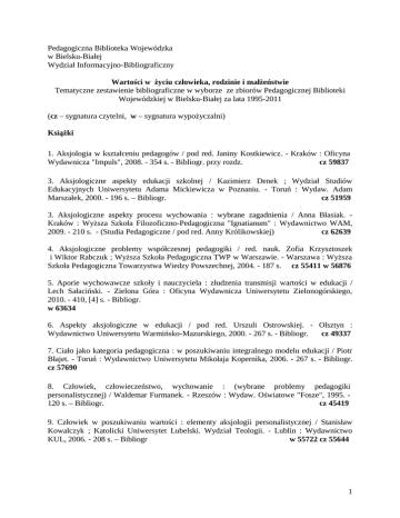 Pedagogiczna Biblioteka Wojewódzka w Bielsku-Białej Wydział Informacyjno-Bibliograficzny Wartości w życiu człowieka, rodzinie i małżeństwie Tematyczne zestawienie bibliograficzne w wyborze ze zbiorów Pedagogicznej Biblioteki Wojewódzkiej w Bielsku-Białej za lata 1995-2011 (cz – sygnatura czytelni, w – sygnatura wypożyczalni) Książki 1. Aksjologia w kształceniu pedagogów / pod red. Janiny Kostkiewicz. - Kraków : Oficyna Wydawnicza "Impuls", 2008. - 354 s. - Bibliogr. przy rozdz. cz 59837 3. Aksjologiczne aspekty edukacji szkolnej / Kazimierz Denek ; Wydział Studiów Edukacyjnych Uniwersytetu Adama Mickiewicza w Poznaniu. - Toruń : Wydaw. Adam Marszałek, 2000. - 196 s. – Bibliogr. cz 51959 3. Aksjologiczne aspekty procesu wychowania : wybrane zagadnienia / Anna Błasiak. Kraków : Wyższa Szkoła Filozoficzno-Pedagogiczna "Ignatianum" : Wydawnictwo WAM, 2009. - 210 s. - (Studia Pedagogiczne / pod red. Anny Królikowskiej) cz 62639 4. Aksjologiczne problemy współczesnej pedagogiki / red. nauk. Zofia Krzysztoszek i Wiktor Rabczuk ; Wyższa Szkoła Pedagogiczna TWP w Warszawie. - Warszawa : Wyższa Szkoła Pedagogiczna Towarzystwa Wiedzy Powszechnej, 2004. - 187 s. cz 55411 w 56876 5. Aporie wychowawcze szkoły i nauczyciela : złudzenia transmisji wartości w edukacji / Lech Sałaciński. - Zielona Góra : Oficyna Wydawnicza Uniwersytetu Zielonogórskiego, 2010. - 410, [4] s. - Bibliogr. w 63634 6. Aspekty aksjologiczne w edukacji / pod red. Urszuli Ostrowskiej. - Olsztyn : Wydawnictwo Uniwersytetu Warmińsko-Mazurskiego, 2000. - 267 s. - Bibliogr. cz 49337 7. Ciało jako kategoria pedagogiczna : w poszukiwaniu integralnego modelu edukacji / Piotr Błajet. - Toruń : Wydawnictwo Uniwersytetu Mikołaja Kopernika, 2006. - 267 s. - Bibliogr. cz 57690 8. Człowiek, człowieczeństwo, wychowanie : (wybrane problemy pedagogiki personalistycznej) / Waldemar Furmanek. - Rzeszów : Wydaw. Oświatowe "Fosze", 1995. 120 s. – Bibliogr. cz 45419 9. Człowiek w poszukiwaniu wartości : elementy aksjologii personalistycznej / Stanisław Kowalczyk ; Katolicki Uniwersytet Lubelski. Wydział Teologii. - Lublin : Wydawnictwo KUL, 2006. - 208 s. – Bibliogr w 55722 cz 55644 1 10. Człowiek w świecie wartości / Wacław Mejbaum. - Szczecin : Wydaw. Naukowe Uniwersytetu Szczecińskiego, 2000. - 230, [1] s. - (Rozprawy i Studia / Uniwersytet Szczeciński). w 50793 11. Człowiek w świecie wartości / Bożena Sztumska, Janusz Sztumski ; Polska Akademia Nauk. Oddział w Katowicach. Komisja Filozofii i Socjologii. - Katowice : "Gnome", 2002. 136 s. - (Rozprawy i Studia / Uniwersytet Szczeciński) cz 51998 12. Człowiek wobec wyzwań współczesności : upadek wartości czy walka o wartość? / pod red. Jana Mazura, Agaty Małyski, Katarzyny Sobstyl ; Centrum Języka i Kultury Polskiej dla Polonii i Cudzoziemców. - Lublin : Wydawnictwo Uniwersytetu Marii Curie-Skłodowskiej, 2007. - 306 s. - (Język, Kultura, Społeczeństwo). - Bibliogr. przy ref. cz 59183 13. Czym są wartości? : zarys aksjologii / Lech Ostasz. - Wyd. 3 popr. - Olsztyn : Wydawnictwo Uniwersytetu Warmińsko-Mazurskiego, 2009. - 152 s. cz 62826 14. Edukacja aksjologiczna wobec potrzeb współczesności / Zofia Frączek. - Rzeszów : Wydaw. Uniwersytetu Rzeszowskiego, 2002. - 200 s. – Bibliogr cz 51303 15. Etyczny wymiar edukacji nauczycielskiej / pod red. Antoniego Rumińskiego. - Kraków : "Impuls", 2004. - 230 s. - Bibliogr. przy rozdz cz 53506 16. Filozofia wychowania : aksjocentryzm i pajdocentryzm / Jan Zubelewicz. - Warszawa : "Żak", cop. 2002. - 84 s. w 50821 17. Hierarchia wartości i sposoby ich realizacji : młodzi bydgoszczanie wobec wartości / Małgorzata Jankowska, Justyna Krasoń. - Kraków : Oficyna Wydawnicza "Impuls", 2009. 122, [1] s. - Bibliogr. w 63171 18. Jak dzieci uczą się wartości : poradnik dla rodziców / Elke Leger. - Kielce : "Jedność" ; Freiburg : "Herder", 2005. – 120 s. w 53756 Gry edukacyjne 19. Językowy obraz świata wartości w wypowiedziach uczniów kończących szkołę podstawową / Ryszard Jedliński. - Kraków : Wydaw. Naukowe Akademii Pedag., 2000. - 289 s. - (Prace Monograficzne / Akademia Pedagogiczna im. Komisji Edukacji Narodowej w Krakowie). – Bibliogr w 49742 20. Między sekularyzacją i ewangelizacją : wartości prorodzinne w świadomości młodzieży szkół średnich / Janusz Mariański. - Lublin : Towarzystwo Naukowe KUL, cop. 2003. - 555, [23] s. - Bibliogr. w 52990 21 Motywy, cele, wartości : przyczynek do zrozumienia stanu ducha i stanu umysłu współczesnych Polaków : praca zbiorowa / pod red. Emilii Martynowicz. - Kraków : "Impuls" ; Gdańsk : Uniwersytet Gdański, 2004. - 361 s. - Bibliogr. przy rozdz. w 53894 22. Odpowiedzialność podmiotowa dzieci : jak rozumieć i inspirować jej rozwój? / Beata Krzywosz-Rynkiewicz. - Kraków : Oficyna Wydawnicza "Impuls", 2007. - 232 s. - Bibliogr. w 59036 2 23. Odpowiedzialność rodzicielska jako wartość : teoria i praktyka / red. nauk. Urszula B. Kazubowska. - Toruń : Wydawnictwo Edukacyjne Akapit, 2010. - 269 s. - Bibliogr. przy pracach w 64324 24. Poczucie odpowiedzialności moralnej jako aspekt podmiotowy / red. nauk. Maria Nowicka-Kozioł. - Warszawa : "Żak", 2000. - 45 s. w 48830 25. Rodzina jako wartość w rozwoju człowieka / red. nauk. Barbara Harwas-Napierała. Poznań : Wydawnictwo Naukowe Uniwersytetu im. Adama Mickiewicza, 2009. - 140, [1] s. . - Bibliogr. przy rozdz. w 62605 26. Sens życia - sens wychowania : dylematy człowieka przełomu wieków / praca pod red. Andrzeja M. de Tchorzewskiego i Piotra Zwierzchowskiego. - Bydgoszcz : "Wers", 2001. 313 s. w 49834 27. Wartości kulturowe w rodzinie : założenia, realia i egzemplifikacje / red. nauk. Wojciech Muszyński. - Toruń : Wydawnictwo Adam Marszałek, 2010. - 277 s. : il. - (Przestrzenie Życia Społecznego). - Bibliogr. przy pracach. cz 63666 28. Wolność jako wartość i problem edukacyjny / praca pod red. Andrzeja M. de Tc