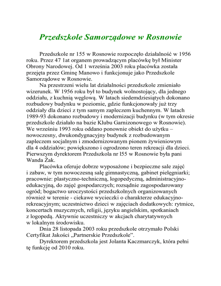 Przedszkole Samorządowe w Rosnowie Przedszkole nr 155 w Rosnowie rozpoczęło działalność w 1956 roku. Przez 47 1at organem prowadzącym placówkę był Minister Obrony Narodowej. Od 1 września 2003 roku placówka została przejęta przez Gminę Manowo i funkcjonuje jako Przedszkole Samorządowe w Rosnowie. Na przestrzeni wielu lat działalności przedszkole zmieniało wizerunek. W 1956 roku był to budynek wolnostojący, dla jednego oddziału, z kuchnią węglową. W latach siedemdziesiątych dokonano rozbudowy budynku w poziomie, gdzie funkcjonowały już trzy oddziały dla dzieci z tym samym zapleczem kuchennym. W latach 1989-93 dokonano rozbudowy i modernizacji budynku (w tym okresie przedszkole działało na bazie Klubu Garnizonowego w Rosnowie). We wrześniu 1993 roku oddano ponownie obiekt do użytku – nowoczesny, dwukondygnacyjny budynek z rozbudowanym zapleczem socjalnym i zmodernizowanym pionem żywieniowym dla 4 oddziałów; powiększono i ogrodzono teren rekreacji dla dzieci. Pierwszym dyrektorem Przedszkola nr l55 w Rosnowie była pani Wanda Żak. Placówka oferuje dobrze wyposażone i bezpieczne sale zajęć i zabaw, w tym nowoczesną salę gimnastyczną, gabinet pielęgniarki; pracownie: plastyczno-techniczną, logopedyczną, administracyjnoedukacyjną, do zajęć gospodarczych; rozsądnie zagospodarowany ogród; bogactwo uroczystości przedszkolnych organizowanych również w terenie - ciekawe wycieczki o charakterze edukacyjnorekreacyjnym; uczestnictwo dzieci w zajęciach dodatkowych: rytmice, koncertach muzycznych, religii, języku angielskim, spotkaniach z logopedą. Aktywnie uczestniczy w akcjach charytatywnych w lokalnym środowisku. Dnia 28 listopada 2003 roku przedszkole otrzymało Polski Certyfikat Jakości „Partnerskie Przedszkole”. Dyrektorem przedszkola jest Jolanta Kaczmarczyk, która pełni tę funkcję od 2010 roku.