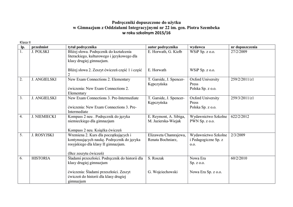 Podręczniki dopuszczone do użytku w Gimnazjum z Oddziałami Integracyjnymi nr 22 im. gen. Piotra Szembeka w roku szkolnym 2015/16 Klasa II lp. przedmiot 1. J. POLSKI 2. 3. 4. tytuł podręcznika Bliżej słowa. Podręcznik do kształcenia literackiego, kulturowego i językowego dla klasy drugiej gimnazjum. autor podręcznika E. Horwath, G. Kiełb wydawca WSiP Sp. z o.o. E. Horwath WSiP Sp. z o.o. J. ANGIELSKI Bliżej słowa 2. Zeszyt ćwiczeń część 1 i część 2 New Exam Connections 2. Elementary T. Garside, J. SpencerKępczyńska 259/2/2011/z1 J. ANGIELSKI ćwiczenia: New Exam Connections 2. Elementary New Exam Connections 3. Pre-Intermediate Oxford University Press Polska Sp. z o.o. T. Garside, J. SpencerKępczyńska Oxford University Press Polska Sp. z o.o. 259/3/2011/z1 E. Reymont, A. Sibiga, M. Jazierska-Wiejak Wydawnictwo Szkolne 622/2/2012 PWN Sp. z o.o. Elizaweta Chamrajewa, Renata Bochniarz, Wydawnictwo Szkolne 2/3/2009 i Pedagogiczne Sp. z o.o. S. Roszak Nowa Era Sp. z o.o. G. Wojciechowski Nowa Era Sp. z o.o. J. NIEMIECKI ćwiczenia: New Exam Connections 3. PreIntermediate Kompass 2 neu . Podręcznik do języka niemieckiego dla gimnazjum 5. J. ROSYJSKI Kompass 2 neu. Książka ćwiczeń Wremiena 2. Kurs dla początkujących i kontynuujących naukę. Podręcznik do języka rosyjskiego dla klasy II gimnazjum. 6. HISTORIA (Bez zeszytu ćwiczeń) Śladami przeszłości. Podręcznik do historii dla klasy drugiej gimnazjum ćwiczenia: Śladami przeszłości. Zeszyt ćwiczeń do historii dla klasy drugiej gimnazjum nr dopuszczenia 27/2/2009 60/2/2010 lp. 7. przedmiot WOS tytuł podręcznika KOSS Podręcznik i ćwiczenia. Część I. 8. RELIGIA Ty ścieżkę życia mi ukażesz. 9. BIOLOGIA Świat biologii. Podręcznik dla gimnazjum. Część 2 Świat biologii Małgorzata Kłyś, Joanna Stawarz, Wiesława Gołda, Jadwiga Wardas Zeszyt ćwiczeń Część 2 Urszula Nowak Tadeusz Ogorzałek Joanna Stawarz Anna Wilhelm Anna Drążek Ewa Duvnjak, Ewa Kokiernak-Jurkiewicz 10. 11. MATEMATYKA FIZYKA Matematyka wokół nas. Gimnazjum. Podręcznik dla klasy 2 Matematyka wokół nas. Gimnazjum Zeszyt ćwiczeń klasa 2 ( część 1 i 2) To jest fizyka. Podręcznik dla gimnazjum. Część 2 To jest fizyka. Zeszyt ćwiczeń, część 2. To jest fizyka. Podręcznik dla gimnazjum. Część 3 To jest fizyka. Zeszyt ćwiczeń, część 3. 12. INFORMATYKA Informatyka Europejczyka. Podręcznik dla gimnazjum. Edycja: Windows Vista, Linux Ubuntu, MS Office 2007, OpenOffice.org. Wydanie II (Podręcznik jest potrzebny uczniom, którzy autor podręcznika Praca zbiorowa pod red. A. Pacewicz, T. Merta Ks. Piotr Tomasik Barbara Podobińska Teresa Przetacznik Dąbrowa Marcin Braun, Weronika Śliwa Marcin Braun, Weronika Śliwa Marcin Braun, Weronika Śliwa Marcin Braun, Weronika Śliwa Jolanta Pańczyk wydawca Fundacja Centrum Edukacji Obywatelskiej Wydawnictwo Katechetyczne, Warszawa Nowa Era Spółka z o.o. nr dopuszczenia 169/1/2009 AZ-32-01/10-WA- 1/13 92/2/2010 Nowa Era Spółka z o.o. Wydawnictwa Szkolne i Pedagogiczne Sp. z o. o. 62/2/2009 Nowa Era Spółka z o.o. 73/2/2009 73/3/2010 Nowa Era Spółka z o.o. Grupa Wydawnicza "Helion" S.A. 568/2012 lp. przedmiot tytuł podręcznika chcą w domu utrwalić wiedzę z lekcji. Na zajęciach uczniowie nie korzystają z podręcznika) autor podręcznika wydawca nr dopuszczenia 13. CHEMIA Chemia Nowej Ery. Część 2. Podręcznik dla gimnazjum Jan Kulawik, Teresa Kulawik, Maria Litwin Nowa Era Spółka z o.o. 49/2/2009 Chemia Nowej Ery Zeszyt ćwiczeń, część 2. Danuta BabczonekWróbel, Teresa Kulawik, Maria Litwin Bożena Dobosik, Adam Hibszer, Józef Soja Nowa Era Spółka z o.o. 5/2/2010 14. GEOGRAFIA Puls Ziemi. Podręcznik do geografii dla klasy drugiej gimnazjum