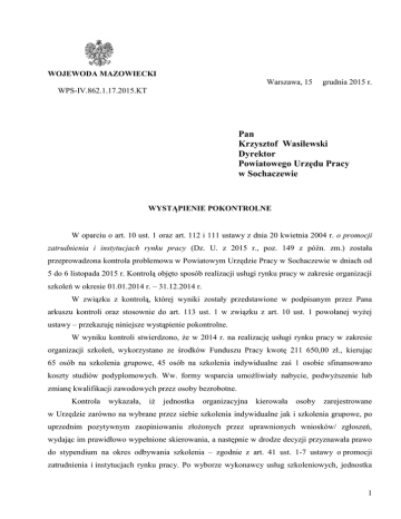 WOJEWODA MAZOWIECKI Warszawa, 15 grudnia 2015 r. WPS-IV.862.1.17.2015.KT Pan Krzysztof Wasilewski Dyrektor Powiatowego Urzędu Pracy w Sochaczewie WYSTĄPIENIE POKONTROLNE W oparciu o art. 10 ust. 1 oraz art. 112 i 111 ustawy z dnia 20 kwietnia 2004 r. o promocji zatrudnienia i instytucjach rynku pracy (Dz. U. z 2015 r., poz. 149 z późn. zm.) została przeprowadzona kontrola problemowa w Powiatowym Urzędzie Pracy w Sochaczewie w dniach od 5 do 6 listopada 2015 r. Kontrolą objęto sposób realizacji usługi rynku pracy w zakresie organizacji szkoleń w okresie 01.01.2014 r. – 31.12.2014 r. W związku z kontrolą, której wyniki zostały przedstawione w podpisanym przez Pana arkuszu kontroli oraz stosownie do art. 113 ust. 1 w związku z art. 10 ust. 1 powołanej wyżej ustawy – przekazuję niniejsze wystąpienie pokontrolne. W wyniku kontroli stwierdzono, że w 2014 r. na realizację usługi rynku pracy w zakresie organizacji szkoleń, wykorzystano ze środków Funduszu Pracy kwotę 211 650,00 zł., kierując 65 osób na szkolenia grupowe, 45 osób na szkolenia indywidualne zaś 1 osobie sfinansowano koszty studiów podyplomowych. Ww. formy wsparcia umożliwiały nabycie, podwyższenie lub zmianę kwalifikacji zawodowych przez osoby bezrobotne. Kontrola wykazała, iż jednostka organizacyjna kierowała osoby zarejestrowane w Urzędzie zarówno na wybrane przez siebie szkolenia indywidualne jak i szkolenia grupowe, po uprzednim pozytywnym zaopiniowaniu złożonych przez uprawnionych wniosków/ zgłoszeń, wydając im prawidłowo wypełnione skierowania, a następnie w drodze decyzji przyznawała prawo do stypendium na okres odbywania szkolenia – zgodnie z art. 41 ust. 1-7 ustawy o promocji zatrudnienia i instytucjach rynku pracy. Po wyborze wykonawcy usług szkoleniowych, jednostka 1 kontrolowana zawierała umowę szkoleniową dotyczącą organizacji danego szkolenia. Umowa określała warunki jego przeprowadzenia oraz zobowiązania instytucji wskazane w obowiązującym w okresie kontrolowanym rozporządzeniu Ministra Pracy i Polityki Społecznej z dnia 14.09.2010 r. w sprawie standardów i warunków prowadzenia usług rynku pracy (Dz. U. z 2010 r., Nr 177, poz. 1193) oraz rozporządzeniu Ministra Pracy i Polityki Społecznej z dnia 14.05.2014 r. w sprawie szczegółowych warunków realizacji oraz trybu i sposobów prowadzenia usług rynku pracy (Dz. U. z 2014 r., poz. 667). Jeśli chodzi o szkolenia indywidualne w 7 przypadkach, z 11 wybranych do kontroli kompletów dokumentacji, jednostka kontrolowana nie załączała do umów wzorów zaświadczeń potwierdzających ukończenie szkolenia czy wzorów anonimowych ankiet dla uczestników szkoleń. Dokumenty te stanowiły załącznik do ofert składanych przez instytucje szkoleniowe. Po zakończonym szkoleniu, instytucja szkoleniowa przedkładała kontrolowanej jednostce dokumentację rozliczającą dane szkolenie w postaci: wypełnionej przez skierowanego bezrobotnego ankiety, kserokopii zaświadczenia/ świadectwa ukończenia szkolenia, listy obecności, dziennika zajęć lekcyjnych, fakturę VAT oraz protokół z egzaminu końcowego (w przypadku zakończenia danego szkolenia egzaminem sprawdzającym nabytą wiedzę). Dodać należy, iż Powiatowy Urząd Pracy w Sochaczewie monitorował przebieg szkoleń poprzez rozmowę telefoniczną, analizę kwestionariuszy końcowej oceny szkolenia oraz poprzez wizytacje w jednostkach szkoleniowych. Z przeprowadzanej wizytacji sporządzana była notatka służbowa. Dofinansowanie kosztów studiów podyplomowych odbywało się na „wniosek o sfinansowanie kosztów studiów podyplomowych”, składany przez osoby bezrobotne, które uzasadniły celowość ich odbycia. Do wniosku załączane były następujące dokumenty: umowa dotycząca studiów podyplomowych, decyzja o przyjęciu na studia podyplomowe, oświadczenie bezrobotnego, w którym zobowiązywał się do ukończenia studiów, kserokopie dokumentów potwierdzających posiadane kwalifikacje oraz wykształcenie. We wniosku, jak również w zawartej potem umowie o sfinansowanie kosztów studiów, brak było wyraźnie określonej daty rozpoczęcia i zakończenia nauki (dzień, miesiąc, rok). Jednakże od dnia kontroli jednostka kontrolowana zaczęła wskazywać w umowach dot. finansowania studiów podyplomowych dokładną datę rozpoczęcia studiów. Wobec powyższego Wojewoda Mazowieckie odstąpił od wydania zalecenia pokontrolnego. Urząd Pracy pisemnie informował osoby bezrobotne o rozpatrzeniu wniosku. W okresie od 01.01.2014 r. do 31.12.2014 r. – 110 osób bezrobotnych zarejestrowanych w Powiatowym Urzędzie Pracy w Sochaczewie uczestniczyło w wybranych przez siebie szkoleniach indywidualnych oraz w szkoleniach grupowych. Wszystkie osoby ukończyły ww. szkolenia, a 81 osób uzyskało zatrudnienie po ukończonym szkoleniu. 1 osoba skorzystała 2 z finansowania studiów podyplomowych. Osoba ta podjęła zatrudnienie w okresie 3 miesięcy po zrealizowaniu wsparcia. Wojewoda Mazowiecki ocenił pozytywnie sposób realizowania przez Powiatowy Urząd Pracy w Sochaczewie sposób realizacji usługi rynku pracy w zakresie organizacji szkoleń w kontrolowanym okresie. Mając na uwadze powyższe ustalenia kontroli – zalecenia pokontrolne nie zostaną wydane. z up. WOJEWODY MAZOWIECKIEGO Artur Subda Zastępca Dyrektora Wydziału Polityki Społecznej 3 Otrzymują: 1. Adresat; 2. Starosta Sochaczewski 4