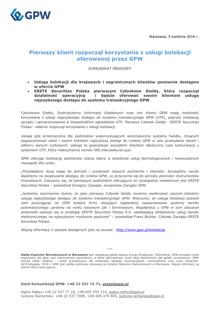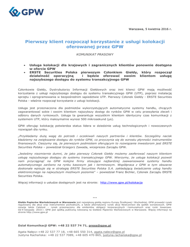 Warszawa, 5 kwietnia 2016 r. Pierwszy klient rozpoczął korzystanie z usługi kolokacji oferowanej przez GPW KOMUNIKAT PRASOWY Usługa kolokacji dla krajowych i zagranicznych klientów ponownie dostępna w ofercie GPW ERSTE Securities Polska pierwszym Członkiem Giełdy, który rozpoczął działalność operacyjną i będzie oferować swoim klientom usługę najszybszego dostępu do systemu transakcyjnego GPW Członkowie Giełdy, Dystrybutorzy Informacji Giełdowych oraz inni klienci GPW mają możliwość korzystania z usługi najszybszego dostępu do systemu transakcyjnego GPW (UTP), poprzez instalację sprzętu i oprogramowania w bezpośrednim sąsiedztwie UTP. Pierwszy Członek Giełdy - ERSTE Securities Polska - właśnie rozpoczął korzystanie z usługi kolokacji. Usługa jest przeznaczona dla podmiotów wykorzystujących automatyczne systemy handlu, chcących zagwarantować sobie i swoim klientom najszybszy dostęp do rynków GPW w celu przesyłania zleceń i odbioru danych rynkowych. Usługa ta gwarantuje wszystkim klientom identyczny czas komunikacji z systemem UTP, który maksymalnie wynosi 500 mikrosekund (μs). GPW oferując kolokację potwierdza status lidera w dziedzinie usług technologicznych i nowoczesnych rozwiązań dla rynku. „Przykładamy dużą wagę do potrzeb i oczekiwań naszych partnerów i klientów. Szczególny nacisk kładziemy na zwiększanie dostępu do rynków GPW, co przyczynia się do wzrostu płynności instrumentów finansowych. Cieszymy się, że pierwszym podmiotem oferującym to rozwiązanie inwestorom jest ERSTE Securities Polska – powiedział Grzegorz Zawada, wiceprezes Zarządu GPW. „Jesteśmy niezmiernie dumni, że jako pierwszy Członek Giełdy możemy zaoferować naszym klientom usługę najszybszego dostępu do systemu transakcyjnego GPW. Wierzymy, że usługa kolokacji pozwoli nam przyciągnąć na GPW kolejne firmy stosujące najbardziej zaawansowane systemy handlu automatycznego zarówno na rynku kasowym jak i terminowym. Współpraca z GPW w tym obszarze doskonale wpisuje się w strategię ERSTE Securities Polska S.A. zakładającą świadczenie usług handlu elektronicznego na najwyższym możliwym poziomie” – powiedział Franz Bichler, Członek Zarządu ERSTE Securities Polska. Więcej informacji o usłudze dostępnych jest na stronie: http://www.gpw.pl/kolokacja *** Giełda Papierów Wartościowych w Warszawie jest największą giełdą regionu Europy Środkowej i Wschodniej. GPW prowadzi rynek regulowany dla akcji oraz instrumentów pochodnych, a także alternatywny rynek akcji NewConnect dla spółek wzrostowych. GPW rozwija także Catalyst – rynek przeznaczony dla emitentów obligacji korporacyjnych i komunalnych oraz rynki towarowe. Od 9 listopada 2010 r. GPW jest spółką publiczną notowaną na Giełdzie Papierów Wartościowych w Warszawie. Więcej informacji na stronie http://www.gpw.pl Dział Komunikacji GPW: +48 22 537 74 71, [email protected] Agata Nałęcz:+48 22 537 77 18, +48 665 550 314, [email protected] Justyna Rachańska: +48 22 537 7089, +48 605 470 865, [email protected]