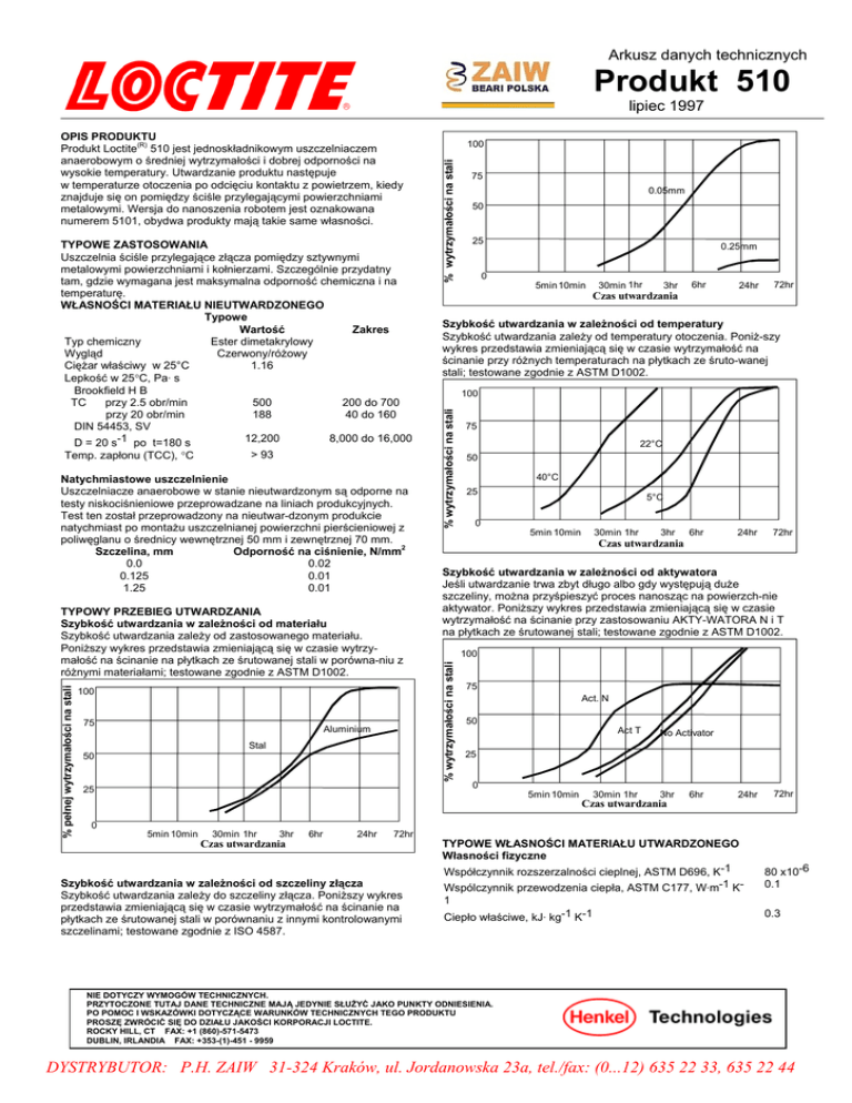 Arkusz danych technicznych Produkt 510 lipiec 1997 Temp. zapłonu (TCC), °C > 93 Natychmiastowe uszczelnienie Uszczelniacze anaerobowe w stanie nieutwardzonym są odporne na testy niskociśnieniowe przeprowadzane na liniach produkcyjnych. Test ten został przeprowadzony na nieutwar-dzonym produkcie natychmiast po montażu uszczelnianej powierzchni pierścieniowej z poliwęglanu o średnicy wewnętrznej 50 mm i zewnętrznej 70 mm. 2 Szczelina, mm Odporność na ciśnienie, N/mm 0.0 0.02 0.125 0.01 1.25 0.01 % pełnej wytrzymałości na stali TYPOWY PRZEBIEG UTWARDZANIA Szybkość utwardzania w zależności od materiału Szybkość utwardzania zależy od zastosowanego materiału. Poniższy wykres przedstawia zmieniającą się w czasie wytrzymałość na ścinanie na płytkach ze śrutowanej stali w porówna-niu z różnymi materiałami; testowane zgodnie z ASTM D1002. 100 75 Aluminium Stal 50 5min 10min 30min 1hr 3hr Czas utwardzania 6hr 24hr 72hr Szybkość utwardzania w zależności od szczeliny złącza Szybkość utwardzania zależy do szczeliny złącza. Poniższy wykres przedstawia zmieniającą się w czasie wytrzymałość na ścinanie na płytkach ze śrutowanej stali w porównaniu z innymi kontrolowanymi szczelinami; testowane zgodnie z ISO 4587. % wytrzymałości na stali 0.05mm 50 25 0 0.25mm 5min 10min 30min 1hr 3hr 6hr Czas utwardzania 24hr 72hr 100 75 22°C 50 40°C 25 0 5°C 5min 10min 30min 1hr 3hr 6hr 24hr 72hr Czas utwardzania Szybkość utwardzania w zależności od aktywatora Jeśli utwardzanie trwa zbyt długo albo gdy występują duże szczeliny, można przyśpieszyć proces nanosząc na powierzch-nie aktywator. Poniższy wykres przedstawia zmieniającą się w czasie wytrzymałość na ścinanie przy zastosowaniu AKTY-WATORA N i T na płytkach ze śrutowanej stali; testowane zgodnie z ASTM D1002. 100 25 0 75 Szybkość utwardzania w zależności od temperatury Szybkość utwardzania zależy od temperatury otoczenia. Poniż-szy wykres przedstawia zmieniającą się w czasie wytrzymałość na ścinanie przy różnych temperaturach na płytkach ze śruto-wanej stali; testowane zgodnie z ASTM D1002. % wytrzymałości na stali TYPOWE ZASTOSOWANIA Uszczelnia ściśle przylegające złącza pomiędzy sztywnymi metalowymi powierzchniami i kołnierzami. Szczególnie przydatny tam, gdzie wymagana jest maksymalna odporność chemiczna i na temperaturę. WŁASNOŚCI MATERIAŁU NIEUTWARDZONEGO Typowe Wartość Zakres Typ chemiczny Ester dimetakrylowy Wygląd Czerwony/różowy Ciężar właściwy w 25°C 1.16 Lepkość w 25°C, Pa· s Brookfield H B TC przy 2.5 obr/min 500 200 do 700 przy 20 obr/min 188 40 do 160 DIN 54453, SV 12,200 8,000 do 16,000 D = 20 s-1 po t=180 s 100 % wytrzymałości na stali OPIS PRODUKTU (R) Produkt Loctite 510 jest jednoskładnikowym uszczelniaczem anaerobowym o średniej wytrzymałości i dobrej odporności na wysokie temperatury. Utwardzanie produktu następuje w temperaturze otoczenia po odcięciu kontaktu z powietrzem, kiedy znajduje się on pomiędzy ściśle przylegającymi powierzchniami metalowymi. Wersja do nanoszenia robotem jest oznakowana numerem 5101, obydwa produkty mają takie same własności. 75 Act. N 50 Act T No Activator 25 0 5min 10min 30min 1hr 3hr Czas utwardzania 6hr 24hr TYPOWE WŁASNOŚCI MATERIAŁU UTWARDZONEGO Własności fizyczne Współczynnik rozszerzalności cieplnej, ASTM D696, K-1 Wspólczynnik przewodzenia ciepła, ASTM C177, W·m-1 K- 72hr 80 x10-6 0.1 1 Ciepło właściwe, kJ· kg-1 K-1 0.3 NIE DOTYCZY WYMOGÓW TECHNICZNYCH. PRZYTOCZONE TUTAJ DANE TECHNICZNE MAJĄ JEDYNIE SŁUŻYĆ JAKO PUNKTY ODNIESIENIA. PO POMOC I WSKAZÓWKI DOTYCZĄCE WARUNKÓW TECHNICZNYCH TEGO PRODUKTU PROSZĘ ZWRÓCIĆ SIĘ DO DZIAŁU JAKOŚCI KORPORACJI LOCTITE. ROCKY HILL, CT FAX: +1 (860)-571-5473 DUBLIN, IRLANDIA FAX: +353-(1)-451 - 9959 DYSTRYBUTOR: P.H. ZAIW 31-324 Kraków, ul. Jordanowska 23a, tel./fax: (0...12) 635 22 33, 635 22 44 TDS Loctite®510 lipiec 1997 WŁASNOŚCI FUNKCJONALNE MATERIAŁU UTWARDZONEGO (Po 24 h w 22°C na płytkach ze śrutowanej stali konstrukcyjnej) Typowe Wartość Zakres 5 3 do 7 Wytrzymałość na ścinanie, ASTM D1002, 2 N/mm (psi) (725) (435 do 1015) 7 4 do 10 Wytrzymałość na ścinanie, DIN 53283, 2 N/mm (psi) (1015) (580 do 1450) 7.5 2 do 13 Wytrzymałość na rozciąganie, DIN 53288, 2 N/mm (psi) (1087) (290 do 1885) Szczelność Uszczelkę w kształcie pierścienia o średnicy wewnętrznej 50 mm i 2 zewnętrznej 70 mm poddano testowi szczelności do 1.3 N/mm (13.5 bar) Materiał Uszczelnia szczelinę do: Stal konstrukcyjna ≤ 0.125 mm Aluminium ≤ 0.125 mm TYPOWA ODPORNOŚĆ NA ŚRODOWISKO Poniższe testy dotyczą oddziaływania środowiska na wytrzymałość. Nie mierzą one skuteczności uszczelnienia. Proces badawczy: Wytrzymałość na ścinanie, ASTM D1002 Materiał: Płytki ze śrutowanej stali konstrukcyjnej, Proces utwardzania 24 godziny w temperaturze pokojowej + 24 godziny w temperaturze Wytrzymałość na temperaturę Badane w temperaturze. % wytrz. w tem. pok. 100 75 50 25 0 0 50 100 Temperatura, °C 150 200 Starzenie cieplne Starzenie w danej temperaturze, testowane w 22°C. % wytrz. pocz. w tem. k 350 150°C 300 250 200 185°C 150 100 INFORMACJA OGÓLNA Nie poleca się stosowania tego produktu do urządzeń z czystym tlenem i/lub bogatych w tlen; nie powinien też być używany jako uszczelniacz do instalacji z chlorem i in-nych materiałów silnie utleniających. Pełna informacja dotycząca bezpiecznego obchodzenia się z tym produktem znajduje się w Arkuszu Bezpieczeństwa dotyczącym materiału (MSDS). Jeśli do czyszczenia powierzchni przed klejeniem stosuje się wodne urządzenia zmywające, należy koniecznie sprawdzić, czy roztwór wodny jest odpowiedni dla danego kleju. W pewnych przypadkach takie wodne zmywanie może mieć wpływ na utwardzanie i na własności kleju. Tego produktu normalnie nie zaleca się do tworzyw (szczególnie materiałów termoplastycznych, gdy