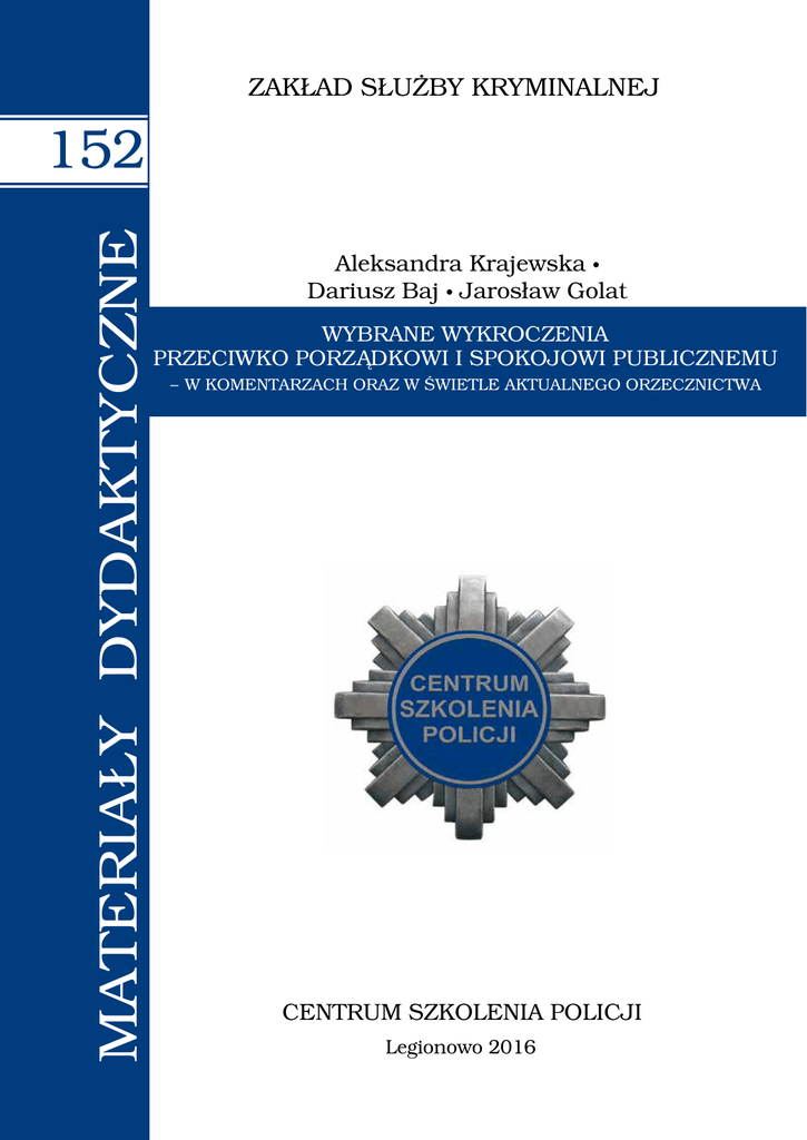 a ZAKŁAD SŁUŻBY KRYMINALNEJ MATERIAŁY DYDAKTYCZNE 152 Aleksandra Krajewska • Dariusz Baj • Jarosław Golat WYBRANE WYKROCZENIA PRZECIWKO PORZĄDKOWI I SPOKOJOWI PUBLICZNEMU – W KOMENTARZACH ORAZ W ŚWIETLE AKTUALNEGO ORZECZNICTWA CENTRUM SZKOLENIA POLICJI Legionowo 2016 1 Zakład Służby Kryminalnej Korekta, skład i druk: Wydział Wydawnictw i Poligrafii Centrum Szkolenia Policji w Legionowie Nakład 44 egz. 2 a Spis treści Wstęp ......................................................................................................................................... 5 Artykuł 50 kw – niedopuszczenie zbiegowiska ........................................................................ 7 Artykuł 50a kw – posiadanie w miejscu publicznym noża, maczety lub podobnego przedmiotu w okolicznościach wskazujących na zamiar użycia go w celu popełnienia przestępstwa . ......................................................................................... 9 Artykuł 51 kw – zakłócenie porządku i spokoju publicznego ................................................ 10 Artykuł 52a kw – publiczne nawoływanie do popełnienia czynu zabronionego .................... 18 Artykuł 54 kw – naruszenie przepisów porządkowych . ......................................................... 20 Artykuł 58 kw – żebractwo w miejscu publicznym ................................................................ 28 Artykuł 64 kw – uchybienie obowiązkowi oznakowania nieruchomości ............................... 31 3 Zakład Służby Kryminalnej 4 a Wstęp Przedmiotem niniejszego opracowania jest problematyka wybranych wykroczeń przeciwko porządkowi i spokojowi publicznemu, znajdujących się w programie szkoleń kursu podstawowego. Z uwagi na dotychczasowy przebieg służby jako funkcjonariusze pionu kryminalnego jak również nauczyciele policyjni z doświadczenia wiemy jak często problematyczne jest prawidłowe zakwalifikowanie czynu, z uwagi na to chcemy skupić się na komentarzach i orzecznictwie sądów. Mamy nadzieję, że niniejsza publikacja pozwoli słuchaczom na lepsze zrozumienie tej interesującej, a jednocześnie trudnej materii, jaka niewątpliwie jest prawo wykroczeń. Autorzy 5 Zakład Służby Kryminalnej 6 a Artykuł 50 kw – niedopuszczenie zbiegowiska Art. 50 kw Kto nie opuszcza zbiegowiska publicznego pomimo wezwania właściwego organu, podlega karze aresztu albo grzywny. Cel regulacji Przepis art. 50 ma na celu ochronę porządku i spokoju publicznego przed zbiegowiskami. Odpowiedzialność za czyn z art. 50 zachodzi w stosunku do tych wszystkich osób, które uczestniczą w zbiegowisku, tj. samorzutnym, przypadkowym zgromadzeniu się bliżej nieokreślonej liczby osób w miejscu publicznym, do którego każdy może się przyłączyć, pomimo wezwania właściwego organu do rozejścia się. Organami uprawnionymi do wezwania do rozejścia się są, np. policja, Straż Pożarna, Straż Przemysłowa, Służba Ochrony Kolei, Straż Miejska. Przestępstwo udziału w zbiegowisku publicznym Dopuszczenie się przez uczestników zbiegowiska gwałtownego zamachu na osobę lub mienie wypełnia ustawowe znamiona przestępstwa udziału w zbiegowisku publicznym, opisanego w art. 254 kk. Sam zaś fakt spowodowania zbiegowiska może być różnie oceniany. Może on nie pociągać za sobą żadnej odpowiedzialności, np. w przypadku zasłabnięcia przechodnia na ulicy. Spowodowanie zbiegowiska może czasem pociągać za sobą odpowiedzialność za wykroczenie, np. w przypadku wywołania zgorszenia w miejscu publicznym z art. 51 kw bądź też pociągać za sobą odpowiedzialność za przestępstwo, np. w przypadku spowodowania zbiegowiska w wyniku obrażania cudzych wierzeń religijnych (art. 196 kk) czy też udziału w bójce (art. 158 kk). Zasady odpowiedzialności Odpowiedzialność za wykroczenie z art. 50 ma miejsce wobec sprawcy nieopuszczającego zbiegowiska bez względu na przyczynę powstania tego zbiegowiska, jak i na fakt, iż inne osoby również nie opuściły tego zbiegowiska. Wykroczenie z art. 50 można popełnić zarówno umyślnie, jak i nieumyślnie. Z umyślnością mamy do czynienia wówczas, gdy sprawca nie chce opuścić zbiegowiska po wezwaniu do rozejścia się, a z nieumyślnością wówczas, gdy sprawca na podstawie towarzyszących okoliczności mógł i powinien był zorientować się, że takie wezwanie było wydane, lecz on nadal nie opuszcza tego zbiegowiska. Znamię czasownikowe odgrywa bardzo istotną rolę przy formułowaniu odpowiedzialności za dane zachowanie się. Wprowadzona ostatnią nowelą zmiana pociąga za sobą odpowiedzialność za wykroczenie w przypadku zaniechania zastosowania się do wezwania właściwego organu. Nie mamy zatem do czynienia z wykroczeniem, gdy wezwany do opuszczenia zbiegowiska poddaje się temu wezwaniu i rozpoczyna jakąkolwiek czynność zmierzającą do opuszczenia zbiegowiska. Pozostanie biernym na to wezwanie stanowi wykroczenie. W aktualnie obowiązującym stanie prawnym nie jest istotne, czy wezwany w rezultacie 7 Zakład Służby Kryminalnej opuścił zbiegowisko, czy też nie. Dla bytu tego wykroczenia istotne jest zignorowanie wezwania. Zastosowanie się natomiast do polecenia nie stanowi wykroczenia, nawet gdyby wezwanemu nie udało się w rzeczywistości opuścić zbiegowiska, np. pod naporem tłumu, starał się z niego wyjść, ale mu się to nie udało. 8 1. Artykuł 222 kk – naruszenie nietykalności a cielesnej funkcjonariusza publicznego Artykuł 50a kw – posiadanie w miejscu publicznym noża, maczety lub podobnego przedmiotu w okolicznościach wskazujących na zamiar użycia go w celu popełnienia przestępstwa Art. 50a kw § 1. Kto w miejscu publicznym posiada nóż, maczetę lub inny podobnie niebezpieczny przedmiot, a okoliczności jego posiadania wskazują na zamiar użycia go w celu popełnienia przestępstwa, podlega karze aresztu, ograniczenia wolności albo grzywny nie niższ