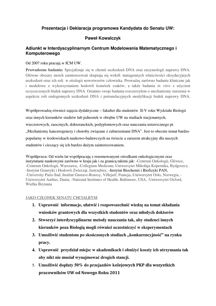 Prezentacja i Deklaracja programowa Kandydata do Senatu UW: Paweł Kowalczyk Adiunkt w Interdyscyplinarnym Centrum Modelowania Matematycznego i Komputerowego Od 2007 roku pracuję w ICM UW. Prowadzone badania: Specjalizuje się w chemii uszkodzeń DNA oraz enzymologii naprawy DNA. Główne obszary moich zainteresowań skupiają się wokół: mutagennych właściwości oksydacyjnych uszkodzeń oraz ich roli w etiologii nowotworów człowieka. Prowadzę zarówno badania kliniczne jak i modelowe z wykorzystaniem hodowli komórek ssaków, a także badania in vitro z użyciem oczyszczonych białek naprawy DNA. Ostatnio swoje badania rozszerzyłem o mechanizmy starzenia w aspekcie roli endogennych uszkodzeń DNA i potranslacyjnych modyfikacji białek naprawy DNA. Współprowadzę również zajęcia dydaktyczne – fakultet dla studentów II-V roku Wydziału Biologii oraz innych kierunków studiów lub jednostek w obrębie UW na studiach stacjonarnych, wieczorowych, zaocznych, doktoranckich, podyplomowych oraz nauczania ustawicznego pt. „Mechanizmy kancerogenezy i choroby związane z zaburzeniami DNA”. Jest to obecnie temat bardzo popularny w środowiskach naukowo-badawczych na świecie a zarazem atrakcyjny dla naszych studentów i cieszący się ich bardzo dużym zainteresowaniem. Współpraca: Od wielu lat współpracuję z renomowanymi ośrodkami onkologicznymi oraz instytutami naukowymi zarówno w kraju jak i za granicą takimi jak: -Centrum Onkologii, Gliwice, -Centrum Onkologii, Warszawa, -Collegium Medicum, Uniwersytet Mikołaja Kopernika, Bydgoszcz, -Instytut Genetyki i Hodowli Zwierząt, Jastrzębiec, -Instytut Biochemii i Biofizyki PAN, -University Paris-Sud, Institut Gustave-Roussy, Villejuif, Francja,-Uniwersytet Oslo, Norwegia, Uniwersytet Aarhus, Dania, -National Institutes of Health, Baltimore, USA, -Uniwersytet Oxford, Wielka Brytania JAKO CZŁONEK SENATU CHCIAŁBYM: 1. Usprawnić informacje, ułatwić i rozpowszechnić wiedzę na temat składania wniosków grantowych dla wszystkich studentów oraz młodych doktorów 2. Stworzyć interdyscyplinarne metody nauczania tak, aby studenci innych kierunków poza Biologią mogli również uczestniczyć w eksperymentach 3. Umożliwić studentom po skończonych studiach „konkurencyjność” na rynku pracy. 4. Usprawnić przydział miejsc w akademikach i obniżyć koszty ich utrzymania tak aby nikt nie musiał wynajmować drogich stancji. 5. Umożliwić dopłaty 50% do przejazdów kolejowych PKP dla wszystkich pracowników UW od Nowego Roku 2011