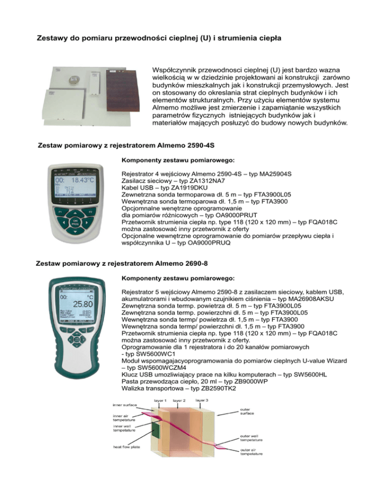 Zestawy do pomiaru przewodności cieplnej (U) i strumienia ciepła Współczynnik przewodnosci cieplnej (U) jest bardzo wazna wielkością w w dziedzinie projektowani ai konstrukcji zarówno budynków mieszkalnych jak i konstrukcji przemysłowych. Jest on stosowany do okreslania strat cieplnych budynków i ich elementów strukturalnych. Przy użyciu elementów systemu Almemo możliwe jest zmierzenie i zapamiątanie wszystkich parametrów fizycznych istniejących budynków jak i materiałów mających posłuzyć do budowy nowych budynków. Zestaw pomiarowy z rejestratorem Almemo 2590-4S Komponenty zestawu pomiarowego: Rejestrator 4 wejściowy Almemo 2590-4S – typ MA25904S Zasilacz sieciowy – typ ZA1312NA7 Kabel USB – typ ZA1919DKU Zewnetrzna sonda termoparowa dł. 5 m – typ FTA3900L05 Wewnętrzna sonda termoparowa dł. 1,5 m – typ FTA3900 Opcjomnalne wenętrzne oprogramowanie dla pomiarów różnicowych – typ OA9000PRUT Przetwornik strumienia ciepła np. type 118 (120 x 120 mm) – typ FQA018C można zastosować inny przetwornik z oferty Opcjonalne wewnętrzne oprogramowanie do pomiarów przepływu ciepła i współczynnika U – typ OA9000PRUQ Zestaw pomiarowy z rejestratorem Almemo 2690-8 Komponenty zestawu pomiarowego: Rejestrator 5 wejściowy Almemo 2590-8 z zasilaczem sieciowy, kablem USB, akumulatrorami i wbudowanym czujnikiem ciśnienia – typ MA26908AKSU Zewnętrzna sonda termp. powietrza dł. 5 m – typ FTA3900L05 Zewnętrzna sonda termp. powierzchni dł. 5 m – typ FTA3900L05 Wewnętrzna sonda termp/ powietrza dł. 1,5 m – typ FTA3900 Wewnętrzna sonda termp/ powierzchni dł. 1,5 m – typ FTA3900 Przetwornik strumienia ciepła np. type 118 (120 x 120 mm) – typ FQA018C można zastosować inny przetwornik z oferty. Oprogramowanie dla 1 rejestratora i do 20 kanałów pomiarowych - typ SW5600WC1 Moduł wspomagajacyoprogramowania do pomiarów cieplnych U-value Wizard – typ SW5600WCZM4 Klucz USB umozliwiający prace na kilku komputerach – typ SW5600HL Pasta przewodząca ciepło, 20 ml – typ ZB9000WP Walizka transportowa – typ ZB2590TK2