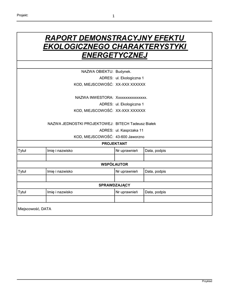 Projekt: 1 RAPORT DEMONSTRACYJNY EFEKTU EKOLOGICZNEGO CHARAKTERYSTYKI ENERGETYCZNEJ NAZWA OBIEKTU: Budynek. ADRES: ul. Ekologiczna 1 KOD, MIEJSCOWOŚĆ: XX-XXX XXXXXX NAZWA INWESTORA: Xxxxxxxxxxxxxxxx. ADRES: ul. Ekologiczna 1 KOD, MIEJSCOWOŚĆ: XX-XXX XXXXXX NAZWA JEDNOSTKI PROJEKTOWEJ: BITECH Tadeusz Białek ADRES: ul. Kasprzaka 11 KOD, MIEJSCOWOŚĆ: 43-600 Jaworzno PROJEKTANT Tytuł Imię i nazwisko Nr uprawnień Data, podpis WSPÓŁAUTOR Tytuł Imię i nazwisko Nr uprawnień Data, podpis SPRAWDZAJĄCY Tytuł Imię i nazwisko Nr uprawnień Data, podpis Miejscowość, DATA Przykład Projekt: 2 Spis treści: 1. Cel opracowania 2. Dane budynku 3. Charakterystyka źródeł ciepła systemu ogrzewania i wentylacji 4. Charakterystyka źródeł ciepła systemu przygotowania ciepłej wody 5. Charakterystyka źródeł chłodu systemu chłodzenia 6. Charakterystyka źródeł oświetlenia systemu oświetlenia wbudowanego 7. Wskaźniki emisja zanieczyszczeń poszczególnych systemów i paliw 8. Emisja zanieczyszczeń poszczególnych systemów w budynku 9. Bezpośredni efekt ekologiczny 10. Emisja zanieczyszczeń poszczególnych systemów w budynku Przykład Projekt: 3 1. Cel opracowania Celem opracowania jest pokazanie efektu ekologiczne między zaprojektowanymi systemami ogrzewczowentylacyjnymi, przygotowania ciepłej wody, chłodzenia i oświetlenia, a alternatywnymi źródłami. 2. Dane budynku Przeznaczenie budynku: Użyteczności publicznej Strefa klimatyczna: III Stacja meteorologiczna: Xxxxxxxxxxxxxxx Powierzchnia zabudowy Az=186,40 m 2 Powierzchnia o regulowanej temperaturze Af=265,00 m Powierzchnia netto A=265,00 m 2 2 Kubatura po obrysie zewnętrznym Ve=1116,41 m Kubatura ogrzewana budynku V=... m 3 3 Liczba kondygnacji: 2 Przykład Projekt: 4 3. Charakterystyka źródeł ciepła systemu ogrzewania i wentylacji 3.1. Budynek projektowany Rodzaj paliwa Udział % H,tot Hu Jedn. Paliwo - węgiel kamienny 100,0 0,74 7,70 kWh/kg 51929,8 QK,H [kWh/rok] Zużycie paliwa Jedn. B 6744,1 kg/rok Zapotrzebowanie na energię elektryczną - produkcji mieszanej od urządzeń pomocniczych systemu ogrzewania i wentylacji: 287,53 kWh/rok 3.2. Budynek z alternatywnymi źródłami Rodzaj paliwa Udział % H,tot Hu Jedn. QK,H [kWh/rok] Zużycie paliwa Jedn. B Ciepło z kogeneracji - węgiel kamienny 100,0 1,00 1,00 kWh/k Wh 14737,9 14737,9 kWh/ro k Zapotrzebowanie na energię elektryczną - produkcji mieszanej od urządzeń pomocniczych systemu ogrzewania i wentylacji: 231,94 kWh/rok 4. Charakterystyka źródeł ciepła systemu przygotowania ciepłej wody 4.1. Budynek projektowany Rodzaj paliwa Udział % W,tot Hu Jedn. Paliwo - węgiel kamienny 100,0 0,29 7,70 kWh/kg 29470,3 QK,W [kWh/rok] Zużycie paliwa Jedn. B 3827,3 kg/rok Zapotrzebowanie na energię elektryczną - produkcji mieszanej od urządzeń pomocniczych systemu ogrzewania i wentylacji: 336,00 kWh/rok 4.2. Budynek z alternatywnymi źródłami Rodzaj paliwa Udział % W,tot Hu Jedn. QK,W [kWh/rok] Zużycie paliwa Jedn. B Paliwo - Kolektory słoneczne termiczne 100,0 1,00 1,00 kWh/k Wh 8411,4 8411,4 kWh/ro k Zapotrzebowanie na energię elektryczną - produkcji mieszanej od urządzeń pomocniczych systemu ogrzewania i wentylacji: 336,00 kWh/rok 5. Charakterystyka źródeł chłodu systemu chłodzenia 5.1. Budynek projektowany Przykład Projekt: 5 Rodzaj paliwa Udział % C,tot Hu Jedn. QK,C [kWh/rok] Zużycie paliwa Jedn. B Energia elektryczna - produkcja mieszana 100,0 2,70 1,00 kWh/k Wh 8001,7 8001,7 kWh/ro k Zapotrzebowanie na energię elektryczną - produkcji mieszanej od urządzeń pomocniczych systemu ogrzewania i wentylacji: 0,00 kWh/rok 5.2. Budynek z alternatywnymi źródłami Rodzaj paliwa Udział % C,tot Hu Jedn. QK,C [kWh/rok] Zużycie paliwa Jedn. B Energia elektryczna - produkcja mieszana 100,0 3,14 1,00 kWh/k Wh 8082,9 8082,9 kWh/ro k Zapotrzebowanie na energię elektryczną - produkcji mieszanej od urządzeń pomocniczych systemu ogrzewania i wentylacji: 0,00 kWh/rok 6. Charakterystyka źródeł oświetlenia systemu oświetlenia wbudowanego 6.1. Budynek projektowany Rodzaj paliwa Udział % QK,L [kWh/rok] Zużycie paliwa B Jedn. Energia elektryczna - produkcja mieszana 100,0 2563,88 2563,9 kWh/rok Zapotrzebowanie na energię elektryczną - produkcji mieszanej od urządzeń pomocniczych systemu ogrzewania i wentylacji: 6,00 kWh/rok 6.2. Budynek z alternatywnymi źródłami Rodzaj paliwa Udział % QK,L [kWh/rok] Zużycie paliwa B Jedn. Energia elektryczna - produkcja mieszana 100,0 2563,88 2563,9 kWh/rok Zapotrzebowanie na energię elektryczną - produkcji mieszanej od urządzeń pomocniczych systemu ogrzewania i wentylacji: 6,00 kWh/rok Przykład Projekt: 6 7. Wskaźniki emisja zanieczyszczeń poszczególnych systemów i paliw 7.1. Budynek projektowany System ogrzewania i wentylacji Jedn. SO2 NOX CO CO2 PYŁ SADZA B-a-P Paliwo - węgiel kamienny kg/Mg 19,20000 0 1,000000 45,00000 0 2000,000 000 10,50000 0 0,350000 0,014000 Energia elektryczna produkcja mieszana kg/Mg 0,910000 0,002300 0,000690 1,000000 0,001500 0,000003 0,000000 Rodzaj paliwa System przygotowania ciepłej wody Jedn. SO2 NOX CO CO2 PYŁ SADZA B-a-P Paliwo - węgiel kamienny kg/Mg 19,20000 0 1,000000 45,00000 0 2000,000 000 10,50000 0 0,350000 0,014000 Energia elektryczna produkcja mieszana kg/Mg 0,910000 0,002300 0,000690 1,000000 0,001500 0,000003 0,000000 Rodzaj paliwa System chłodu Rodzaj paliwa Jedn. SO2 NOX CO CO2 PYŁ SADZA B-a-P Energia elektryczna produkcja mieszana kg/Mg 0,910000 0,002300 0,000690 1,000000 0,001500 0,000003 0,000000 System oświetlenia wbudowanego Rodzaj paliwa Jedn. SO2 NOX CO CO2 PYŁ SADZA B-a-P Energia elektryczna produkcja mieszana kg/Mg 0,910000 0,002300 0,000690 1,000000 0,001500 0,000003 0,000000 7.2. Budynek z alternatywnymi źródłami System ogrzewania i wentylacji Rodzaj paliwa Jedn. SO2 NOX CO CO2 PYŁ SADZA B-a-P Ciepło z kogeneracji węgiel kamienny kg/kWh 0,000340 0,000770 0,000130 0,372400 0,000130 0,000000 0,000000 Energia elekt