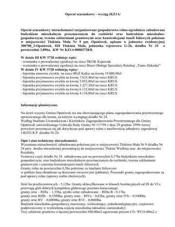 Operat szacunkowy - wyciąg (KZ1A/ Operat szacunkowy nieruchomości zorganizowane gospodarstwo rolno-ogrodnicze zabudowane budynkiem mieszkalnym przeznaczonym do rozbiórki oraz budynkiem mieszkalnogospodarczym, trzema szklarniami gruntowymi oraz konstrukcjami tuneli foliowych położone w miejscowości Tłokinia Mała Nr 9 gm. Opatówek, opisane w jednostce ewidencyjnej 300708_2-Opatówek, 020 Tłokinia Mała, jednostka rejestrowa G-26, działka Nr 24 o powierzchni 3,89ha. KW Nr KZ1A/00003728/8. W dziale III KW 3728 widnieje wpis: - wzmianka o prowadzonej egzekucji na rzecz SKOK Kujawiak - wzmianka o prowadzonej egzekucji na rzecz Biuro Obsługi Sprzedaży Ratalnej „Trans-Dekoder” W dziale IV KW 3728 widnieją wpisy: - hipoteka umowna zwykła na rzecz BGŻ Kalisz na kwotę 19.000,00zł - hipoteka przymusowa zwykła na kwotę 7.635,40zł na rzecz KRUS - hipoteka przymusowa zwykła na kwotę 5.052,00zł na rzecz KRUS - hipoteka przymusowa zwykła na kwotę 3.227,20zł na rzecz KRUS - hipoteka przymusowa zwykła na kwotę 6.123,60zł na rzecz KRUS - hipoteka przymusowa zwykła na kwotę 4.134,00zł na rzecz KRUS Informacje planistyczne. Na dzień wyceny Gmina Opatówek nie ma obowiązującego planu zagospodarowania przestrzennego opracowanego dla terenu, na którym występują działki Nr 24. Według Studium Uwarunkowań i Kierunków Zagospodarowania Przestrzennego dla Gminy Opatówek zatwierdzonego Uchwała Rady Gminy Nr 117/99 z dnia 29 grudnia 1999r tereny powyższe przeznacza się jak dotychczas pod uprawy rolne z możliwością zabudowy zagrodowej J.B.032.R.P. działka Nr 24. Opis i stan techniczny nieruchomości. Wyceniana nieruchomość zabudowana położona jest w miejscowości Tłokinia Mała Nr 9 działka Nr 24 przy drodze utwardzonej prowadzącej do miejscowości Tłokini Wielkiej oraz do miejscowości Rożdżały. Frontowa część działki Nr 24 zabudowana jest na powierzchni 0,17ha budynkiem mieszkalnogospodarczym, oraz budynkiem mieszkalnym przeznaczonym do rozbiórki, trzema szklarniami gruntowymi i czterema konstrukcjami tuneli foliowych. Grunty rolne na powierzchni 0,5ha położone za tunelami foliowymi w pobliżu lasu obsadzone są drzewami owocowymi (jabłonie). Pozostałe grunty zagospodarowane są pod uprawy rolne (uprawy roślin zbożowych). Ilość ha przeliczeniowych - 5,12ha. Grunty sklasyfikowane w klasach bonitacyjnych od III do VI z przewagą gleb dobrych kompleksu glebowego pszenno-buraczanego. grunty orne – RIIIa – 1,35ha, użytki rolne zabudowane – RIIIa-B - 0,17ha grunty orne RIIIb – 0,5500ha, grunty orne – RIVa – 0,62ha, grunty orne IVb – 0,5400ha grunty orne RV – 0,6000ha, grunty orne RVI – 0,0600ha Budynek mieszkalno-gospodarczy murowany, wolnostojący, jednokondygnacyjny, częściowo podpiwniczony w wydzieloną częścią mieszkalną (aktualnie zamieszkały). Trzy szklarnie gruntowe o łącznej powierzchni 840,00m2 ogrzewane piecem CO. WCO-80m2 z rusztem stałym - komin stalowy h-20m. Konstrukcje tuneli foliowych trzy - drewniane, jedna stalowa, dwie - przykryte płachtami foliowymi (nie podlegającej wycenie ze względu na znaczny stopień zużycia). Nieruchomość położona od centrum administracyjnego Gminy w odległości ca - 4km i m. Kalisza 10 km. Kształt działki - prostokątny. Warunki geotechniczne - korzystne. Skłon gruntów południowy. Do budynków doprowadzona jest energia elektryczna, woda z ujęcia gminnego, oraz sieć telefoniczną. Siedlisko gospodarstwa od drogi ogrodzone z bramą wjazdową. Budynek mieszkalny murowany z cegły jest przeznaczony do rozbiórki ze względu na znaczny stopień zużycia technicznego. Wartość materiałów uzyskanych z rozbiórki pokryje koszty z nią związane. Opis, dane szczegółowe dotyczące nieruchomości zabudowanych. -Opis części mieszkalnej budynku. Budynek mieszkalny murowany z pustaków, jednokondygnacyjny, w zabudowie zwartej częściowo podpiwniczony w części szczytowej od ulicy część mieszkalna, pozostała część budynku gospodarcza. Dane techniczne budynku mieszkalnego: Powierzchnia zabudowy – 156,80m2 Powierzchnia użytkowa – 120,00m2 Opis rozwiązań konstrukcyjno-materiałowych. Fundament beton. Ściany nadziemia z pustaków na zaprawie cementowo-wapiennej. Strop żelbeton. Dach stropodach kryty papą i płytą falistą. Tynki wewnętrzne – gładkie. Posadzki cementowe – wyłożone wykładziną i płytkami ceramicznymi. Stolarka okienna z PCV. Drzwi – drewniane. Budynek ocieplony - pomalowany. Budynek wyposażony w instalację elektryczną, instalację wodno-kanalizacyjną z odprowadzeniem do osadnika bezodpływowego, instalację C.O. z własnego węzła ciepłowniczego. Stan techniczny budynku – dobry. Stopień zużycia budynku – 30%. Ocena stanu technicznego budynku nie stanowi jego ekspertyzy. -Opis części gospodarczej budynku. Budynek murowany, jednokondygnacyjny w zabudowie zwartej (z częścią budynku adaptowaną na mieszkanie). Powierzchnia zabudowy – 122,00m2 Powierzchnia użytkowa – 100,00m2 Opis rozwiązań konstrukcyjno-materiałowych. Fundament beton. Ściany nadziemia z pustaków na zaprawie wapienno-cementowej. Strop żelbetowy. Dach – stropodach. Pokrycie – papa. Posadzki cementowe. Elewacja budynku - gładka. Drzwi - stalowe. Budynek wyposażony w instalację elektryczną. Stan techniczny budynku – dobry. Stan techniczny budynku – dobry. Stopień zużycia budynku – 30%. Ocena stanu technicznego budynku nie stanowi jego ekspertyzy. -Szklarnie gruntowe. Szklarnie gruntowe wolnostojące konstrukcji stalowej, ogrzewane, przeznaczone do uprawy warzyw pod osłonami w zabudowie zwartej z kotłownią konstrukcji stalowej. Powierzchnia zabudowy – 840,00m2 Powierzchnia użytkowa – 800,00m2 Opis rozwiązań konstrukcyjno-materiałowych. Fundament beton. Ściany nadziemia - słupki stalowe. Dach konstrukcji stalowej obustronnie spadzisty. Wietrzniki ujęte w ramy stalowe. Pokrycie szkło. Drzwi stalowe w szczytach -