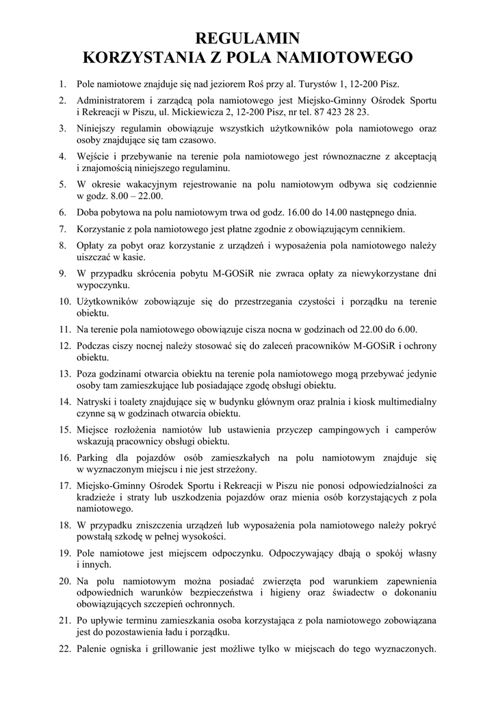 REGULAMIN KORZYSTANIA Z POLA NAMIOTOWEGO 1. Pole namiotowe znajduje się nad jeziorem Roś przy al. Turystów 1, 12-200 Pisz. 2. Administratorem i zarządcą pola namiotowego jest Miejsko-Gminny Ośrodek Sportu i Rekreacji w Piszu, ul. Mickiewicza 2, 12-200 Pisz, nr tel. 87 423 28 23. 3. Niniejszy regulamin obowiązuje wszystkich użytkowników pola namiotowego oraz osoby znajdujące się tam czasowo. 4. Wejście i przebywanie na terenie pola namiotowego jest równoznaczne z akceptacją i znajomością niniejszego regulaminu. 5. W okresie wakacyjnym rejestrowanie na polu namiotowym odbywa się codziennie w godz. 8.00 – 22.00. 6. Doba pobytowa na polu namiotowym trwa od godz. 16.00 do 14.00 następnego dnia. 7. Korzystanie z pola namiotowego jest płatne zgodnie z obowiązującym cennikiem. 8. Opłaty za pobyt oraz korzystanie z urządzeń i wyposażenia pola namiotowego należy uiszczać w kasie. 9. W przypadku skrócenia pobytu M-GOSiR nie zwraca opłaty za niewykorzystane dni wypoczynku. 10. Użytkowników zobowiązuje się do przestrzegania czystości i porządku na terenie obiektu. 11. Na terenie pola namiotowego obowiązuje cisza nocna w godzinach od 22.00 do 6.00. 12. Podczas ciszy nocnej należy stosować się do zaleceń pracowników M-GOSiR i ochrony obiektu. 13. Poza godzinami otwarcia obiektu na terenie pola namiotowego mogą przebywać jedynie osoby tam zamieszkujące lub posiadające zgodę obsługi obiektu. 14. Natryski i toalety znajdujące się w budynku głównym oraz pralnia i kiosk multimedialny czynne są w godzinach otwarcia obiektu. 15. Miejsce rozłożenia namiotów lub ustawienia przyczep campingowych i camperów wskazują pracownicy obsługi obiektu. 16. Parking dla pojazdów osób zamieszkałych na polu namiotowym znajduje się w wyznaczonym miejscu i nie jest strzeżony. 17. Miejsko-Gminny Ośrodek Sportu i Rekreacji w Piszu nie ponosi odpowiedzialności za kradzieże i straty lub uszkodzenia pojazdów oraz mienia osób korzystających z pola namiotowego. 18. W przypadku zniszczenia urządzeń lub wyposażenia pola namiotowego należy pokryć powstałą szkodę w pełnej wysokości. 19. Pole namiotowe jest miejscem odpoczynku. Odpoczywający dbają o spokój własny i innych. 20. Na polu namiotowym można posiadać zwierzęta pod warunkiem zapewnienia odpowiednich warunków bezpieczeństwa i higieny oraz świadectw o dokonaniu obowiązujących szczepień ochronnych. 21. Po upływie terminu zamieszkania osoba korzystająca z pola namiotowego zobowiązana jest do pozostawienia ładu i porządku. 22. Palenie ogniska i grillowanie jest możliwe tylko w miejscach do tego wyznaczonych. 23. Na terenie pola namiotowego zabrania się: 1) zaśmiecania terenu pola namiotowego, 2) zakłócania porządku na polu namiotowym, 3) przebywania dzieci do lat 7 bez opieki rodziców lub opiekunów, 4) ingerowania w jakikolwiek sposób w okoliczną zieleń, 5) dewastowania infrastruktury pola namiotowego i przyległych obiektów, 6) mycia samochodów i innych pojazdów, 7) używania butli gazowych i używania otwartego ognia w namiotach, 8) poruszania się z prędkością większą niż 6 km/h. 24. Sposób powiadamiania o wypadkach: 1) telefonicznie - M-GOSiR w Piszu – 87 423 28 23 2) telefonicznie pod numery alarmowe: pogotowie ratunkowe – 999 straż pożarna – 998 policja – 997 Centrum Powiadamiania Ratunkowego – 112 Dyrektor M-GOSiR w Piszu