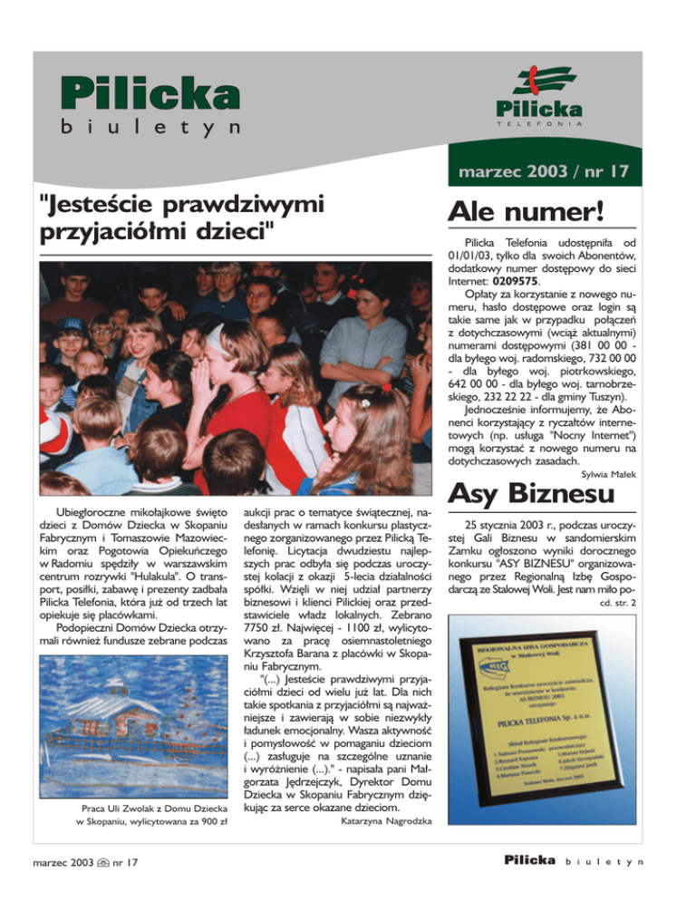 marzec 2003 / nr 17 "Jesteście prawdziwymi przyjaciółmi dzieci" Ale numer! Pilicka Telefonia udostępniła od 01/01/03, tylko dla swoich Abonentów, dodatkowy numer dostępowy do sieci Internet: 0209575. Opłaty za korzystanie z nowego numeru, hasło dostępowe oraz login są takie same jak w przypadku połączeń z dotychczasowymi (wciąż aktualnymi) numerami dostępowymi (381 00 00 dla byłego woj. radomskiego, 732 00 00 - dla byłego woj. piotrkowskiego, 642 00 00 - dla byłego woj. tarnobrzeskiego, 232 22 22 - dla gminy Tuszyn). Jednocześnie informujemy, że Abonenci korzystający z ryczałtów internetowych (np. usługa "Nocny Internet") mogą korzystać z nowego numeru na dotychczasowych zasadach. Sylwia Małek Ubiegłoroczne mikołajkowe święto dzieci z Domów Dziecka w Skopaniu Fabrycznym i Tomaszowie Mazowieckim oraz Pogotowia Opiekuńczego w Radomiu spędziły w warszawskim centrum rozrywki "Hulakula". O transport, posiłki, zabawę i prezenty zadbała Pilicka Telefonia, która już od trzech lat opiekuje się placówkami. Podopieczni Domów Dziecka otrzymali również fundusze zebrane podczas Praca Uli Zwolak z Domu Dziecka w Skopaniu, wylicytowana za 900 zł marzec 2003 nr 17 aukcji prac o tematyce świątecznej, nadesłanych w ramach konkursu plastycznego zorganizowanego przez Pilicką Telefonię. Licytacja dwudziestu najlepszych prac odbyła się podczas uroczystej kolacji z okazji 5-lecia działalności spółki. Wzięli w niej udział partnerzy biznesowi i klienci Pilickiej oraz przedstawiciele władz lokalnych. Zebrano 7750 zł. Najwięcej - 1100 zł, wylicytowano za pracę osiemnastoletniego Krzysztofa Barana z placówki w Skopaniu Fabrycznym. "(...) Jesteście prawdziwymi przyjaciółmi dzieci od wielu już lat. Dla nich takie spotkania z przyjaciółmi są najważniejsze i zawierają w sobie niezwykły ładunek emocjonalny. Wasza aktywność i pomysłowość w pomaganiu dzieciom (...) zasługuje na szczególne uznanie i wyróżnienie (...)." - napisała pani Małgorzata Jędrzejczyk, Dyrektor Domu Dziecka w Skopaniu Fabrycznym dziękując za serce okazane dzieciom. Katarzyna Nagrodzka Asy Biznesu 25 stycznia 2003 r., podczas uroczystej Gali Biznesu w sandomierskim Zamku ogłoszono wyniki dorocznego konkursu "ASY BIZNESU" organizowanego przez Regionalną Izbę Gospodarczą ze Stalowej Woli. Jest nam miło pocd. str. 2 2 Bliżej Klienta Zapraszamy wszystkich Radomian na stoisko promocyjne Pilickiej Telefonii do Centrum Handlowego M1. Nasi konsultanci udzielą informacji na temat aktualnie obowiązujących promocji oraz wszelkich usług dostępnych w sieci Pilickiej. Do Państwa dyspozycji przygotowaliśmy dwa stanowiska komputerowe, z których mogą Państwo za darmo skorzystać z Internetu. Bezpłatnie można również wykonać rozmowę telefoniczną na numery lokalne oraz wysłać faks. Na stoisku znajduje się specjalny aparat telefoniczny, z którego można dzwonić za granicę po wyjątkowo atrakcyjnych cenach (np. minuta rozmowy z USA kosztuje 2 zł). Serdecznie zapraszamy w godzinach otwarcia Centrum Handlowego. Agnieszka Komosa Rachunki ,,zapłacą się same” Polecenie zapłaty jest formą rozliczeń bezgotówkowych. Po uruchomieniu tej usługi z rachunku bankowego Abonenta automatycznie pobierana jest należność za rachunek telefoniczny. Faktura wysyłana jest do Abonenta, aby mógł kontrolować operacje na rachunku. Korzyści są obopólne - Abonenci nie muszą wychodzić z domu i pilnować terminów płatności, a Pilicka otrzymuje należności w wyznaczonym czasie i może efektywniej gospodarować środkami pieniężnymi. Zachęcam Państwa do uruchomienia tej usługi, tym bardziej, że wśród osób, które zdecydują się na tę formę rozliczeń w okresie od 1 marca do 1 kwietnia, zostanie rozlosowanych 10 aparatów telefonicznych. Regulamin jest do wglądu w siedzibie Pilickiej Telefonii przy ul. Potkanowskiej 54a w Radomiu oraz w Biurach Obsługi Klienta. Więcej informacji można uzyskać pod numerem (048) 384 06 16 lub na www.pilicka.com.pl Beata Staniszewska Asy Biznesu cd. ze str 1 Laureaci konkursu "5 lat Pilickiej Telefonii" informować, że Pilicka Telefonia znalazła się w gronie firm wyróżnionych w tym konkursie. Nagroda ta jest dla nas dowodem, że Pilicka jest postrzegana jako ważny i nieodłączny element stalowowolskiego krajobrazu gospodarczego, a nasze inwestycje w infrastrukturę telekomunikacyjną przyczyniają się do rozwoju całego regionu. Wśród nagrodzonych i wyróżnionych znalazły się ponadto tak znaczące stalowowolskie firmy jak Elektrownia "Stalowa Wola", Bank Spółdzielczy, firmy COSSO, HALMAR i NOWEX oraz Bank PKO BP S.A., AUTORUD, Stolarnia ADAM i Przedsiębiorstwo "Auto-Service". Wszystkim firmom - laureatom ASÓW BIZNESU - składamy serdeczne gratulacje i życzenia wielu rynkowych sukcesów. Regionalna Izba Gospodarcza w Stalowej Woli jest instytucją samorządu gospodarczego zrzeszającą przedsiębiorstwa ze Stalowej Woli i okolic. Wysiłek wkładany przez Izbę w promocję i integrację stalowowolskiego środowiska przedsiębiorców stanowi niezwykłą zasługę tej obchodzącej w tym roku pięciolecie działalności instytucji. Dobiegł końca konkurs urodzinowy Pilickiej Telefonii. Najwięcej punktów zdobył Pan Janusz Stachura, który tym samym wygrał główną nagrodę - wycieczkę do Egiptu, ufundowaną przez Biuro Podróży Alfa-Star z Radomia. Dwa drugie miejsca zajęły Panie Ewa Szewczyk i Janina Laskowska, którym Pilicka ufundowała wycieczki o wartości 1 000 zł każda. Trzecie nagrody - zestawy audio, wygrali Panowie Piotr Domagała, Sławomir Wąsik i Zbigniew Mierzwa. A oto lista pozostałych nagrodzonych osób: Andrzej Jagiełło, Ewa Kozicka, Elżbieta Jakubowska, Małgorzata Bartosiewicz, Marcin Piotrowski, Kinga Piotrowska, Ewa Zwolińska, Mirosław Hernik, Janina Pawłowska, Andrzej Głogowski, Zygmunt Pawlik, Izabela Czechowska, Rafał Strzelczyk, Grażyna Sobiło, Henryk Mo