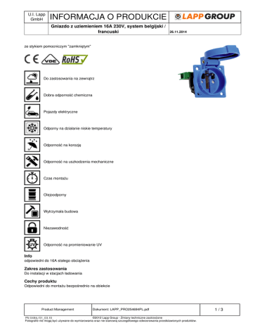 U.I. Lapp GmbH INFORMACJA O PRODUKCIE Gniazdo z uziemieniem 16A 230V, system belgijski / francuski 26.11.2014 ze stykiem pomocniczym "zamkniętym" Do zastosowania na zewnątrz Dobra odporność chemiczna Pojazdy elektryczne Odporny na działanie niskie temperatury Odporność na korozję Odporność na uszkodzenia mechaniczne Czas montażu Olejoodporny Wytrzymała budowa Niezawodność Odporność na promieniowanie UV Info odpowiedni do 16A stałego obciążenia Zakres zastosowania Do instalacji w stacjach ładowania Cechy produktu Odpowiedni do montażu bezpośrednio na obiekcie Product Management Dokument: LAPP_PRO254694PL.pdf ©2012 Lapp Group - Zmiany techniczne zastrzeżone PN 0486/01_03.10 Fotografie nie mogą być używane do wymiarowania oraz nie stanowią szczegółowego odwzorowania przedstawionych produktów. 1/3 U.I. Lapp GmbH INFORMACJA O PRODUKCIE Gniazdo z uziemieniem 16A 230V, system belgijski / francuski 26.11.2014 Wskazówka Wszystkie podane wartości dotyczące produktów są wartościami nominalnymi (o ile nie wskazano inaczej). Inne wartości, takie jak np. tolerancje mogą być przedstawione na zamówienie (jeżeli są dostępne i przeznaczone do publikacji). Fotografie nie mogą być używane do wymiarowania oraz nie stanowią szczegółowego odwzorowania przedstawionych produktów. Dane techniczne Napięcie nominalne: 250V Stopień ochrony: IP 54 Zakres temperatury: -30°C do +50°C Product Management Dokument: LAPP_PRO254694PL.pdf ©2012 Lapp Group - Zmiany techniczne zastrzeżone PN 0486/01_03.10 Fotografie nie mogą być używane do wymiarowania oraz nie stanowią szczegółowego odwzorowania przedstawionych produktów. 2/3 Powered by TCPDF (www.tcpdf.org) Jednostka dostawy (PU) 74880240 Gniazdo kolor czarny 1 74880239 Gniazdo kolor niebieski 1 INFORMACJA O PRODUKCIE Dokument: LAPP_PRO254694PL.pdf Gniazdo z uziemieniem 16A 230V, system belgijski / francuski Product Management U.I. Lapp GmbH Oznaczenie wyrobu 26.11.2014 ©2012 Lapp Group - Zmiany techniczne zastrzeżone PN 0486/01_03.10 Fotografie nie mogą być używane do wymiarowania oraz nie stanowią szczegółowego odwzorowania przedstawionych produktów. 3/3 Powered by TCPDF (www.tcpdf.org) Numer artykułu