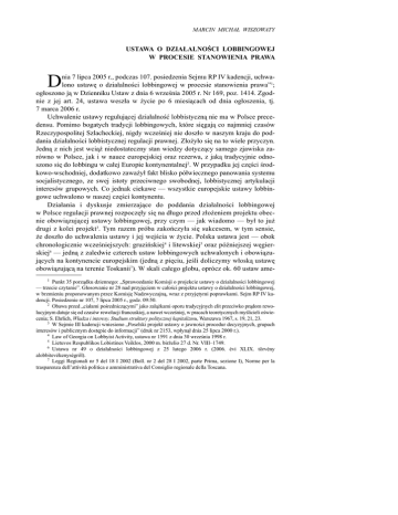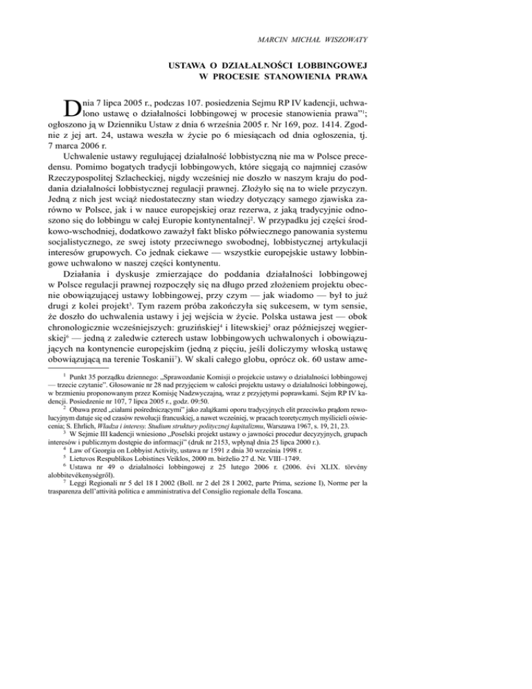 MARCIN MICHAŁ WISZOWATY USTAWA O DZIAŁALNOŚCI LOBBINGOWEJ W PROCESIE STANOWIENIA PRAWA D nia 7 lipca 2005 r., podczas 107. posiedzenia Sejmu RP IV kadencji, uchwalono ustawę o działalności lobbingowej w procesie stanowienia prawa”1; ogłoszono ją w Dzienniku Ustaw z dnia 6 września 2005 r. Nr 169, poz. 1414. Zgodnie z jej art. 24, ustawa weszła w życie po 6 miesiącach od dnia ogłoszenia, tj. 7 marca 2006 r. Uchwalenie ustawy regulującej działalność lobbistyczną nie ma w Polsce precedensu. Pomimo bogatych tradycji lobbingowych, które sięgają co najmniej czasów Rzeczypospolitej Szlacheckiej, nigdy wcześniej nie doszło w naszym kraju do poddania działalności lobbistycznej regulacji prawnej. Złożyło się na to wiele przyczyn. Jedną z nich jest wciąż niedostateczny stan wiedzy dotyczący samego zjawiska zarówno w Polsce, jak i w nauce europejskiej oraz rezerwa, z jaką tradycyjnie odnoszono się do lobbingu w całej Europie kontynentalnej2. W przypadku jej części środkowo-wschodniej, dodatkowo zaważył fakt blisko półwiecznego panowania systemu socjalistycznego, ze swej istoty przeciwnego swobodnej, lobbistycznej artykulacji interesów grupowych. Co jednak ciekawe — wszystkie europejskie ustawy lobbingowe uchwalono w naszej części kontynentu. Działania i dyskusje zmierzające do poddania działalności lobbingowej w Polsce regulacji prawnej rozpoczęły się na długo przed złożeniem projektu obecnie obowiązującej ustawy lobbingowej, przy czym — jak wiadomo — był to już drugi z kolei projekt3. Tym razem próba zakończyła się sukcesem, w tym sensie, że doszło do uchwalenia ustawy i jej wejścia w życie. Polska ustawa jest — obok chronologicznie wcześniejszych: gruzińskiej4 i litewskiej5 oraz późniejszej węgierskiej6 — jedną z zaledwie czterech ustaw lobbingowych uchwalonych i obowiązujących na kontynencie europejskim (jedną z pięciu, jeśli doliczymy włoską ustawę obowiązującą na terenie Toskanii7). W skali całego globu, oprócz ok. 60 ustaw ame1 Punkt 35 porządku dziennego: „Sprawozdanie Komisji o projekcie ustawy o działalności lobbingowej — trzecie czytanie”. Głosowanie nr 28 nad przyjęciem w całości projektu ustawy o działalności lobbingowej, w brzmieniu proponowanym przez Komisję Nadzwyczajną, wraz z przyjętymi poprawkami. Sejm RP IV kadencji. Posiedzenie nr 107, 7 lipca 2005 r., godz. 09:50. 2 Obawa przed „ciałami pośredniczącymi” jako zalążkami oporu tradycyjnych elit przeciwko prądom rewolucyjnym datuje się od czasów rewolucji francuskiej, a nawet wcześniej, w pracach teoretycznych myślicieli oświecenia; S. Ehrlich, Władza i interesy. Studium struktury politycznej kapitalizmu, Warszawa 1967, s. 19, 21, 23. 3 W Sejmie III kadencji wniesiono „Poselski projekt ustawy o jawności procedur decyzyjnych, grupach interesów i publicznym dostępie do informacji” (druk nr 2153, wpłynął dnia 25 lipca 2000 r.). 4 Law of Georgia on Lobbyist Activity, ustawa nr 1591 z dnia 30 września 1998 r. 5 Lietuvos Respublikos Lobistines Veiklos, 2000 m. birželio 27 d. Nr. VIII–1749. 6 Ustawa nr 49 o działalności lobbingowej z 25 lutego 2006 r. (2006. évi XLIX. törvény alobbitevékenységről). 7 Leggi Regionali nr 5 del 18 I 2002 (Boll. nr 2 del 28 I 2002, parte Prima, sezione I), Norme per la trasparenza dell’attività politica e amministrativa del Consiglio regionale della Toscana. 42 Przegląd Sejmowy 5(76)/2006 Studia i Materiały rykańskich i kanadyjskich — federalnych i stanowych (prowincjonalnych) — regulacje lobbingowe rangi ustawowej posiadają jedynie Filipiny8 i Peru9. Ta skromna statystyka nie uwzględnia kolejnych projektów regulacji lobbingu na poziomie ustawowym i regulaminowym, zgłaszanych co roku w różnych częściach demokratycznego świata. Niniejsze opracowanie ma na celu ukazanie genezy polskiej regulacji działalności lobbistycznej na tle długiej historii samego zjawiska, a przede wszystkim krytyczną analizę pierwszej polskiej ustawy lobbingowej. Pomimo niewątpliwie pionierskiego charakteru ustawy — nie tylko na tle polskiej historii, ale w skali Europy, a nawet świata — zasługuje ona na bardzo krytyczną ocenę, która znacznie obniża jej rangę. Opracowanie ma z konieczności charakter sygnalizacyjny i skupia się na najważniejszych faktach chronologicznych oraz najistotniejszych spośród bardzo licznych zarzutów dotyczących kształtu i treści ustawy. Od pewnego czasu zauważamy stopniowy wzrost zainteresowania zagadnieniem lobbingu, który dotyczy obu części Europy. Popularny pogląd łączący to zjawisko z ustrojem amerykańskim, czy szerzej: z anglosaskim kręgiem prawnoustrojowym, podlega istotnej korekcie na podstawie coraz bogatszego dorobku badawczego. Początki wielowiekowej historii lobbingu coraz częściej odnajduje się nie w kuluarach XVIII-wiecznego Kongresu USA czy waszyngtońskiego Hotelu Willard z czasów prezydentury Ulyssesa S. Granta10 i Abrahama Lincolna11, ale na forum ateńskiego zgromadzenia ludowego, gdzie ścierały się interesy reprezentowane przez demagogów i retorów — pierwszych europejskich lobbistów par excellence. W zamian za odpowiednie honorarium starożytni rzecznicy interesów podejmowali się reprezentowania każdego wpływowego zleceniodawcy12. W dziejach lobbingu znajduje się również polski rozdział. Oprócz uniwersalnych dla całej Europy przejawów tego zjawiska, jak: działalność duchowieństwa chrześcijańskiego i kościoła katolickiego, średniowiecznych cechów rzemieślniczych, gildii kupieckich, hanz czy uniwersytetów, odnajdujemy przykłady charakterystyczne dla historii Polski. Należy tu wymienić „ablegatów”, czyli stałych przedstawicieli parlamentarnych działających na polecenie miast pozbawionych reprezentacji politycznej, na podstawie przywileju królewskiego13, oraz „rezydentów”, czyli przedstawi8 An Act to regulate lobbying in the Congress of t