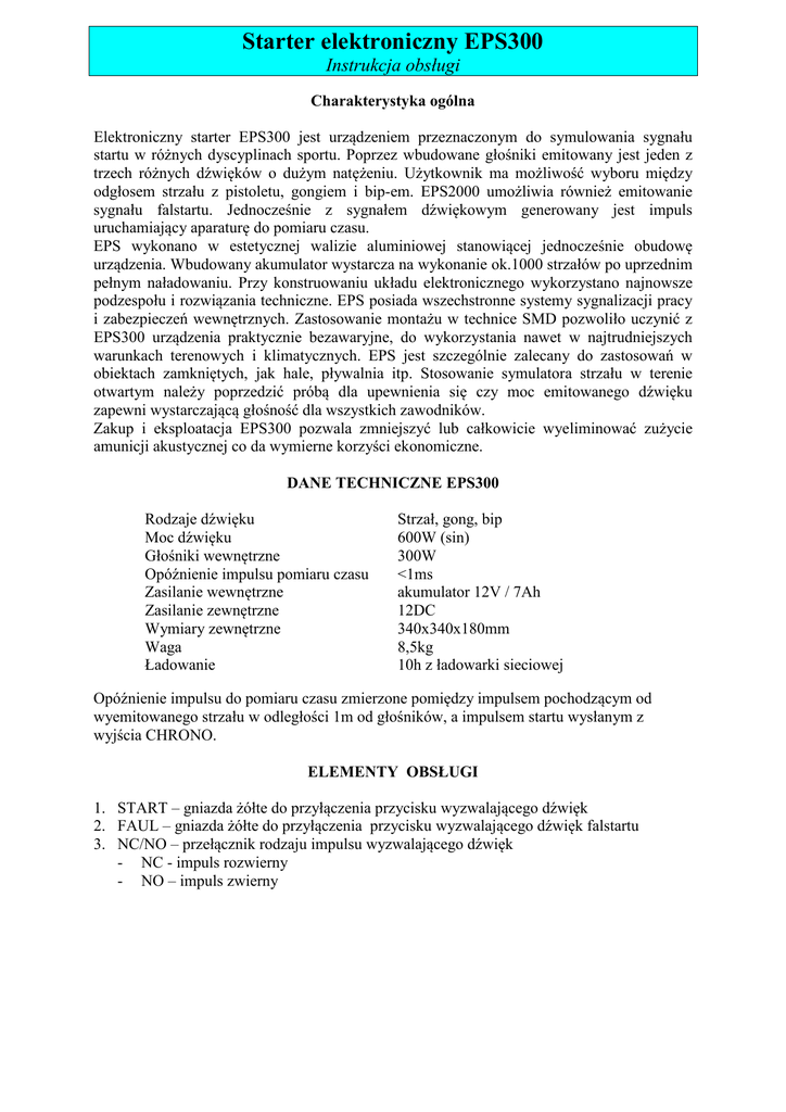 Starter elektroniczny EPS300 Instrukcja obsługi Charakterystyka ogólna Elektroniczny starter EPS300 jest urządzeniem przeznaczonym do symulowania sygnału startu w różnych dyscyplinach sportu. Poprzez wbudowane głośniki emitowany jest jeden z trzech różnych dźwięków o dużym natężeniu. Użytkownik ma możliwość wyboru między odgłosem strzału z pistoletu, gongiem i bip-em. EPS2000 umożliwia również emitowanie sygnału falstartu. Jednocześnie z sygnałem dźwiękowym generowany jest impuls uruchamiający aparaturę do pomiaru czasu. EPS wykonano w estetycznej walizie aluminiowej stanowiącej jednocześnie obudowę urządzenia. Wbudowany akumulator wystarcza na wykonanie ok.1000 strzałów po uprzednim pełnym naładowaniu. Przy konstruowaniu układu elektronicznego wykorzystano najnowsze podzespołu i rozwiązania techniczne. EPS posiada wszechstronne systemy sygnalizacji pracy i zabezpieczeń wewnętrznych. Zastosowanie montażu w technice SMD pozwoliło uczynić z EPS300 urządzenia praktycznie bezawaryjne, do wykorzystania nawet w najtrudniejszych warunkach terenowych i klimatycznych. EPS jest szczególnie zalecany do zastosowań w obiektach zamkniętych, jak hale, pływalnia itp. Stosowanie symulatora strzału w terenie otwartym należy poprzedzić próbą dla upewnienia się czy moc emitowanego dźwięku zapewni wystarczającą głośność dla wszystkich zawodników. Zakup i eksploatacja EPS300 pozwala zmniejszyć lub całkowicie wyeliminować zużycie amunicji akustycznej co da wymierne korzyści ekonomiczne. DANE TECHNICZNE EPS300 Rodzaje dźwięku Moc dźwięku Głośniki wewnętrzne Opóźnienie impulsu pomiaru czasu Zasilanie wewnętrzne Zasilanie zewnętrzne Wymiary zewnętrzne Waga Ładowanie Strzał, gong, bip 600W (sin) 300W <1ms akumulator 12V / 7Ah 12DC 340x340x180mm 8,5kg 10h z ładowarki sieciowej Opóźnienie impulsu do pomiaru czasu zmierzone pomiędzy impulsem pochodzącym od wyemitowanego strzału w odległości 1m od głośników, a impulsem startu wysłanym z wyjścia CHRONO. ELEMENTY OBSŁUGI 1. START – gniazda żółte do przyłączenia przycisku wyzwalającego dźwięk 2. FAUL – gniazda żółte do przyłączenia przycisku wyzwalającego dźwięk falstartu 3. NC/NO – przełącznik rodzaju impulsu wyzwalającego dźwięk - NC - impuls rozwierny - NO – impuls zwierny WIDOK ŚCIANKI EPS300 4. CHRONO – gniazda białe i czarne do przyłączenia linii startowej aparatury do elektronicznego pomiaru czasu. 5. NO/NC – przełącznik rodzaju impulsu do wyzwalania chronometru - NC – impuls rozwierny - NO – impuls zwierny 6. TEL.- gniazda niebieskie i czarne do przyłączenia telefonu wykorzystującego linię kablową startu (przez kondensator izolujący lub bezpośrednio). 7. LAMP – gniazda czerwone do przyłączenia styków wyzwalających lampę błyskową 8. AUDIO – gniazdo do przyłączenia wzmacniacza zewnętrznego 9. SPEAKER – gniazdo do przyłączenia dodatkowych głośników 10. GUN/GONG – przełącznik rodzaju dźwięku 11. ON/OFF – wyłącznik zasilania EPS300 12. READY – dioda sygnalizacyjna gotowość do generowania dźwięku 13. LOBAT – dioda sygnalizująca rozładowanie akumulatora wewnętrznego 14. DC12V IN – gniazdo DIN do przyłączenia zasilania zewnętrznego – ładowarki akumulatora wewnętrznego OPIS UŻYTKOWANIA 1. Ustawić EPS300 głośnikami w kierunku startujących zachowując możliwie równe odległości od wszystkich zawodników. 2. Do gniazd START koloru żółtego dołączyć: - przewód z przyciskiem będący na wyposażeniu lub - lampę błyskową typ LBS2000 lub - tradycyjny pistolet startowy nie naładowany 3. przełącznikiem NC/NO wybrać odpowiedni rodzaj impulsu wyzwalającego Przycisk będący na wyposażeniu jest normalnie rozwarty i wymaga ustawienia przełącznika (3) w pozycji NO. 4. Do gniazd CHRONO (4) białego i czarnego podłączyć linię kablową od gniazd startowych urządzenia mierzącego czas. 5. Przełącznikiem NC/NO (5) wybrać odpowiedni rodzaj impulsu wyzwalającego chronometr – chronometry ST1000 i ST2000D wymagają ustawienia w pozycji NO. 6. Przełącznikiem GUN/GONG wybrać odpowiedni rodzaj generowanego dźwięku. W pozycji górnej jest to odgłos strzału. W pozycji środkowej krótki i wysoki dźwięk – bip. W pozycji dolnej – gong. 7. Włączyć zasilanie przełącznikiem ON/OFF (11). Spowoduje to zapalenie się lampki podświetlającej przełącznik, a po upływie ok. 5 sekund lampki READY (12) co oznacza gotowość do pracy. 8. Wyzwalać wybrany sygnał startowy przyciskiem startowym przyłączonym zgodnie z pkt.2. 9. Po zakończeniu pracy przełącznik ON/OFF (11) ustawić w pozycji OFF. 10. Przed każdym dniem pracy EPS300 ładować przez okres 10 godzin za pomocą będącej w wyposażeniu ładowarki sieciowej, którą należy podłączyć do gniazda typu DIN oznaczonego - DC12V IN(14). 11. W przypadku dużej ilości oddanych strzałów bez możliwości ładowania akumulatora wewnętrznego i zaświecenia się lampki sygnalizującej LOBAT (13), EPS2000 można zasilić z dowolnego źródła napięcia stałego 12V (np. akumulator samochodowy) wykorzystując kabel zasilania zewnętrznego będący na wyposażeniu EPS300. Przy podłączaniu należy pamiętać o zachowaniu zgodności biegunowości zacisków. 12. Do gniazd LAMP (7) koloru czerwonego można podłączyć styki lampy błyskowej dowolnego typu. Błysk lampy w momencie startu jest sygnałem do uruchomienia stoperów ręcznych przez sędziów mierzących czas na mecie. Oferowany obecnie model lampy błyskowej LBS2000 jest podłączany do drugiej pary styków przycisku wyzwalającego starter krótkim przewodem.. 13. Do gniazd TEL (6) koloru niebieskiego i czarnego można podłączyć telefon wykorzystujący przewód łączący EPS300 z chronometrem do utrzymywania łączności między obsługą sędziowską na starcie i na mecie. Para gniazd górnych niebieskie i czarne jest przeznaczona dla te