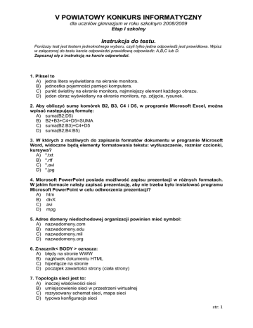V POWIATOWY KONKURS INFORMATYCZNY dla uczniów gimnazjum w roku szkolnym 2008/2009 Etap I szkolny Instrukcja do testu. Poniższy test jest testem jednokrotnego wyboru, czyli tylko jedna odpowiedź jest prawidłowa. Wpisz w załączonej do testu karcie odpowiedzi prawidłową odpowiedź: A,B,C lub D. Zapoznaj się z instrukcją na karcie odpowiedzi. 1. Piksel to A) jedna litera wyświetlana na ekranie monitora. B) jednostka pojemności pamięci komputera. C) punkt świetlny na ekranie monitora, najmniejszy element każdego obrazu. D) jeden obraz wyświetlany na ekranie monitora, np. zdjęcie, rysunek. 2. Aby obliczyć sumę komórek B2, B3, C4 i D5, w programie Microsoft Excel, można wpisać następującą formułę: A) suma(B2;D5) B) B2+B3+C4+D5=SUMA C) suma(B2:B3)+C4+D5 D) suma(B2;B4:B5) 3. W których z możliwych do zapisania formatów dokumentu w programie Microsoft Word, widoczne będą elementy formatowania tekstu: wytłuszczenie, rozmiar czcionki, kursywa? A) *.txt B) *.rtf C) *.avi D) *.jpg 4. Microsoft PowerPoint posiada możliwość zapisu prezentacji w różnych formatach. W jakim formacie należy zapisać prezentację, aby nie trzeba było instalować programu Microsoft PowerPoint w celu odtworzenia prezentacji? A) htm B) divX C) avi D) mpg 5. Adres domeny niedochodowej organizacji powinien mieć symbol: A) nazwadomeny.com B) nazwadomeny.edu C) nazwadomeny.mil D) nazwadomeny.org 6. Znacznik< BODY > oznacza: A) błędy na stronie WWW B) nagłówek dokumentu HTML C) hiperłącze na stronie D) początek zawartości strony (ciała strony) 7. Topologia sieci jest to: A) inaczej właściwości sieci B) umiejscowienie sieci w przestrzeni wirtualnej C) rozrysowany schemat sieci, mapa sieci D) typowa konfiguracja sieci str. 1 8. Defragmentator dysków to program, który: A) zapisuje fragmentację dysku na nośnikach zewnętrznych B) poszczególne pliki zapisuje w obszarze ciągłym na dysku C) naprawia logiczne błędy dyskowe D) usuwa niepotrzebne pliki dyskowe 9. Liczba 13 w postaci dwójkowej to: A) 1101 B) 1001 C) 1010 D) 1110 10. Ile wartości może przyjąć jeden bit? A) 8 B) 1 C) 2 D) 256 11. Co to jest schowek i do czego służy? A) jest to wolne miejsce na dyskietce B) jest to miejsce w pamięci komputera C) służy do przechowywania systemu operacyjnego D) służy do archiwizowania dokumentów 12. Która z nazw nie oznacza oprogramowania: A) Shareware B) Freeware C) Hardware D) Software 13. Liczba 11111110 w systemie dwójkowym odpowiada: A) 25 w systemie oktalnym (ósemkowym) B) FE w systemie heksadecymalnym (szesnastkowym) C) 110 w systemie dziesiętnym D) -13 w systemie dziesiętnym 14. Napęd taśmowy do archiwizacji danych to: A) modem B) ploter C) streamer D) nagrywarka CD-RW 15. Ile bajtów może pomieścić dysk twardy o pojemności 4GB: A) 4000000 B) 4x1024x1024x1024 C) 4x1024x1024 D) 4x1000x1000x1000 16. Co to jest toner ? A) typ skanera B) proszek barwiący do drukowania w drukarkach laserowych C) rodzaj obudowy komputera D) substancja służąca do zabezpieczania dyskietek E) Techniczny Obserwator Nadzoru Elektrostatycznego Ramu str. 2 17. Wskaż element aktywny sieci komputerowej A) hub B) okablowanie C) skrętka D) szafka krosująca 18. Do czego służy koncentrator? A) Do zwiększania liczby drukarek (koncentrowania) B) Do wysyłania skoncentrowanych listów elektronicznych C) Do łączenia komputerów w sieć D) W celach archiwizacyjnych 19. W sieciach przewodowych do łączenia komputerów nie wykorzystujemy: A) fal radiowych B) skrętki C) kabla koncentrycznego D) światłowodów 20. Zapytanie TR??L.TX* w Windows odnajdzie plik: A) TREFLE.TXT B) TREFL.TLX C) TR123L.TXT D) TRRRL.TXX 21. Rozszerzenie nazw plików A) zwiększa rozmiar pliku B) koduje zawartość pliku C) umożliwia kojarzenie plików z aplikacjami do ich tworzenia i edycji D) rozszerza możliwości zapisywania danych w plikach 22. Scandisk to program, który: A) powoduje tzw. formatowanie wskazanego dysku B) tworzy kopię zapasową plików, folderów czy całych dysków C) usuwa tymczasowe pliki internetowe D) naprawia logiczne błędy dyskowe 23. Nazwa pojedynczego pliku w Windows nie może zawierać znaku: A) Tyldy B) Nawiasów C) Znaku zapytania D) Znaku wykrzyknika 24. Do czego służy w MS Excel funkcja oznaczona symbolem ? A) do wyliczenia średniej arytmetycznej B) do obliczenia sumy wartości zaznaczonych w kolumnie lub wierszu C) do obliczeń wysokości rat w jakich należy spłacać kredyt D) do obliczenia wysokości odsetek kredytu 25. W Każdym arkuszu kalkulacyjnym można w formułach używać funkcji. Między innymi występują funkcje matematyczne: SQR, której wartością jest kwadrat argumentu i SQRT, której wartością jest pierwiastek kwadratowy argumentu. Do komórki C5 wpisano formułę SQRT(SQR(C1)+SQR(C2)). Jaka wartość pojawi się w komórce C3, jeśli do C1 wpisano 3, a do C2 wpisano 4? A) 7 B) 25 C) nie można obliczyć D) 5 str. 3 26. Automatyczne numerowanie stron dokumentu programu MS Word można uzyskać wstawiając numer strony do: A) stopki strony B) dowolnego akapitu C) przypisu na stronie D) szablonu dokumentu 27. Jaką wartość wyznaczy formuła = JEŻELI(A2 > A1; A1-A2; A2^2), jeśli w komórce A1 znajduje się liczba 12, a w A2 wartość 7 A) 14 B) 7 C) 5 D) 49 28. Rekord w bazie danych: A) składa się z ustalonej liczby pól B) to jedna kolumna w tabeli C) to jedno pole (komórka) tabeli D) może zawierać wyłącznie dane tekstowe 29. Co wykonuje algorytm, którego fragment schematu blokowego przedstawiono na rysunku A) Sprawdza, czy a jest równe zero. B) Umożliwia wprowadzenie do programu tylko liczb dodatnich. C) Wylicza kwadrat liczby a. D) Wylicza a do potęgi a. 30. Korzyści wynikające z łączenie komputerów w sieć to: A) możliwość przenoszenia danych na dyskietkach B) współdzielenie zasobów sprzętowych C) eliminuje konieczność zatrudniania osoby w roli administratora D) zmniejszenie rozprzestrzeniania się wirusów str. 4