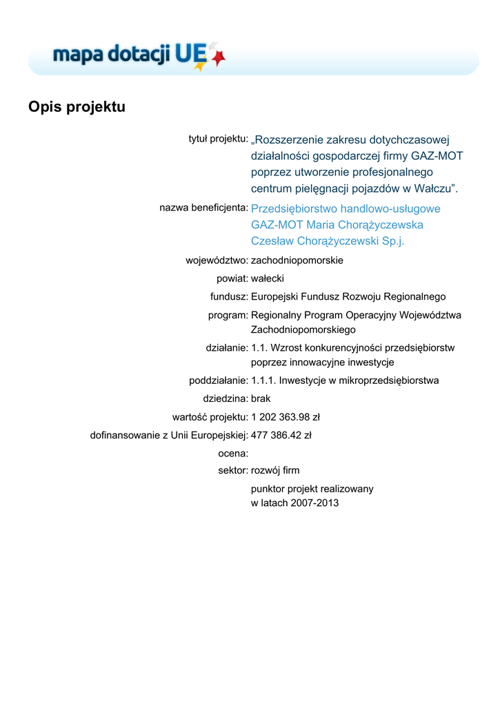 Opis projektu tytuł projektu: „Rozszerzenie zakresu dotychczasowej działalności gospodarczej firmy GAZ-MOT poprzez utworzenie profesjonalnego centrum pielęgnacji pojazdów w Wałczu”. nazwa beneficjenta: Przedsiębiorstwo handlowo-usługowe GAZ-MOT Maria Chorążyczewska Czesław Chorążyczewski Sp.j. województwo: zachodniopomorskie powiat: wałecki fundusz: Europejski Fundusz Rozwoju Regionalnego program: Regionalny Program Operacyjny Województwa Zachodniopomorskiego działanie: 1.1. Wzrost konkurencyjności przedsiębiorstw poprzez innowacyjne inwestycje poddziałanie: 1.1.1. Inwestycje w mikroprzedsiębiorstwa dziedzina: brak wartość projektu: 1 202 363.98 zł dofinansowanie z Unii Europejskiej: 477 386.42 zł ocena: sektor: rozwój firm punktor projekt realizowany w latach 2007-2013