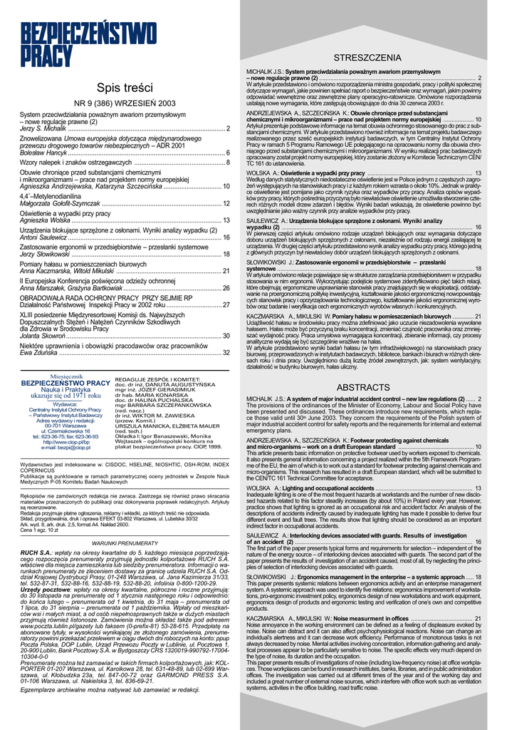 BEZPIECZEÑSTWO PRACY 9/2003 STRESZCZENIA Spis treci NR 9 (386) WRZESIEÑ 2003 System przeciwdzia³ania powa¿nym awariom przemys³owym nowe regulacje prawne (2) Jerzy S. Michalik ........................................................................................ 2 Znowelizowana Umowa europejska dotycz¹ca miêdzynarodowego przewozu drogowego towarów niebezpiecznych ADR 2001 Boles³aw Hancyk ........................................................................................ 6 Wzory nalepek i znaków ostrzegawczych ................................................... 8 Obuwie chroni¹ce przed substancjami chemicznymi i mikroorganizmami prace nad projektem normy europejskiej Agnieszka Andrzejewska, Katarzyna Szczeciñska ................................. 10 , 4,4 Metylenodianilina Ma³gorzata Go³ofit-Szymczak ................................................................... 12 Owietlenie a wypadki przy pracy Agnieszka Wolska .................................................................................... 13 Urz¹dzenia blokuj¹ce sprzê¿one z os³onami. Wyniki analizy wypadku (2) Antoni Saulewicz ...................................................................................... 16 Zastosowanie ergonomii w przedsiêbiorstwie przes³anki systemowe Jerzy S³owikowski .................................................................................... 18 Pomiary ha³asu w pomieszczeniach biurowych Anna Kaczmarska, Witold Mikulski ........................................................... 21 II Europejska Konferencja powiêcona odzie¿y ochronnej Anna Marsza³ek, Gra¿yna Bartkowiak ....................................................... 26 OBRADOWA£A RADA OCHRONY PRACY PRZY SEJMIE RP Dzia³alnoæ Pañstwowej Inspekcji Pracy w 2002 roku ............................... 27 XLIII posiedzenie Miêdzyresortowej Komisji ds. Najwy¿szych Dopuszczalnych Stê¿eñ i Natê¿eñ Czynników Szkodliwych dla Zdrowia w rodowisku Pracy Jolanta Skowroñ ....................................................................................... 30 Niektóre uprawnienia i obowi¹zki pracodawców oraz pracowników Ewa Zduñska ........................................................................................... 32 Miesiêcznik BEZPIECZEÑSTWO PRACY Nauka i Praktyka ukazuje siê od 1971 roku Wydawca: Centralny Instytut Ochrony Pracy Pañstwowy Instytut Badawczy Adres wydawcy i redakcji: 00-701 Warszawa ul. Czerniakowska 16 tel.: 623-36-75; fax: 623-36-93 http://www.ciop.pl/bp e-mail: [email protected] REDAGUJE ZESPÓ£ I KOMITET: doc. dr in¿. DANUTA AUGUSTYÑSKA mgr in¿. JÓZEF GIERASIMIUK dr hab. MARIA KONARSKA doc. dr HALINA PUCHALSKA mgr BARBARA SZCZEPANKOWSKA (red. nacz.) dr in¿. WIKTOR M. ZAWIESKA (przew. Komit.) URSZULA MANICKA, EL¯BIETA MAUER (red. tech.) Ok³adka I: Igor Banaszewski, Monika Wojtaszek ogólnopolski konkurs na plakat bezpieczeñstwa pracy. CIOP, 1999. Wydawnictwo jest indeksowane w: CISDOC, HSELINE, NIOSHTIC, OSH-ROM, INDEX COPERNICUS Publikacje s¹ punktowane w ramach parametrycznej oceny jednostek w Zespole Nauk Medycznych P-05 Komitetu Badañ Naukowych Rêkopisów nie zamówionych redakcja nie zwraca. Zastrzega siê równie¿ prawo skracania materia³ów przeznaczonych do publikacji oraz dokonywania poprawek redakcyjnych. Artyku³y s¹ recenzowane. Redakcja przyjmuje p³atne og³oszenia, reklamy i wk³adki, za których treæ nie odpowiada. Sk³ad, przygotowalnia, druk i oprawa EFEKT 03-802 Warszawa, ul. Lubelska 30/32 Ark. wyd. 8, ark. druk. 2,5, format A4. Nak³ad 2600. Cena 1 egz. 10 z³ WARUNKI PRENUMERATY RUCH S.A.: wp³aty na okresy kwartalne do 5. ka¿dego miesi¹ca poprzedzaj¹cego rozpoczêcia prenumeraty przyjmuj¹ jednostki kolporta¿owe RUCH S.A. w³aciwe dla miejsca zamieszkania lub siedziby prenumeratora. Informacji o warunkach prenumeraty ze zleceniem dostawy za granicê udziela RUCH S.A. Oddzia³ Krajowej Dystrybucji Prasy, 01-248 Warszawa, ul. Jana Kazimierza 31/33, tel. 532-87-31, 532-88-16, 532-88-19, 532-88-20, infolinia 0-800-1200-29. Urzêdy pocztowe: wp³aty na okresy kwartalne, pó³roczne i roczne przyjmuj¹: do 30 listopada na prenumeratê od 1 stycznia nastêpnego roku i odpowiednio: do koñca lutego prenumerata od 1 kwietnia, do 31 maja prenumerata od 1 lipca, do 31 sierpnia prenumerata od 1 padziernika. Wp³aty od mieszkañców wsi i ma³ych miast, a od osób niepe³nosprawnych tak¿e w du¿ych miastach przyjmuj¹ równie¿ listonosze. Zamówienia mo¿na sk³adaæ tak¿e pod adresem www.poczta.lublin.pl/gazety lub faksem (0-prefix-81) 53-28-615. Przedp³atê na abonowane tytu³y, w wysokoci wynikaj¹cej ze z³o¿onego zamówienia, prenumeratorzy powinni przekazaæ przelewem w ci¹gu dwóch dni roboczych na konto: ppup Poczta Polska, DOP Lublin, Urz¹d Przewozu Poczty w Lublinie, ul. Pocztowa 1, 20-900 Lublin, Bank Pocztowy S.A. w Bydgoszczy CRS 1320019-990792-1700410304-0-0 Prenumeratê mo¿na te¿ zamawiaæ w takich firmach kolporta¿owych, jak: KOLPORTER 01207 Warszawa, ul. Karolkowa 28, tel. 631-48-89, lub 02-699 Warszawa, ul. K³obudzka 23a, tel. 847-00-72 oraz GARMOND PRESS S.A. 01-106 Warszawa, ul. Nakielska 3, tel. 836-69-21. Egzemplarze archiwalne mo¿na nabywaæ lub zamawiaæ w redakcji. MICHALIK J.S.: System przeciwdzia³ania powa¿nym awariom przemys³owym nowe regulacje prawne (2) ................................................................................................. 2 W artykule przedstawiono i omówiono rozporz¹dzenia ministra gospodarki, pracy i polityki spo³ecznej dotycz¹ce wymagañ, jakie powinien spe³niaæ raport o bezpieczeñstwie oraz wymagañ, jakim powinny odpowiadaæ wewnêtrzne oraz zewnêtrzne plany operacyjno-ratownicze. Omówione rozporz¹dzenia ustalaj¹ nowe wymagania, które zastêpuj¹ obowi¹zuj¹ce do dnia 30 czerwca 2003 r. ANDRZEJEWSKA A., SZCZECIÑSKA K.: Obuwie chroni¹ce przed substancjami chemicznymi i mikroorganizmami prace nad projektem normy europejskiej ................... 10 