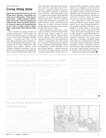 Agata Rzepczyk Coraz bliżej złota Badmintoniści AZS AGH właśnie wrócili z kolejnego meczu ligowego, rozegranego trzeciego marca w Białymstoku. W tym sezonie idą jak burza – najpierw pokonali wielokrotnego mistrza kraju i trzecią drużynę Europy, zespół Suwałk, potem utytułowane Głubczyce, a teraz po rozgromieniu Hubala Białystok są już o krok od złotego medalu w ekstraklasie i zaszczytnego tytułu Mistrzów Polski 2006. Mecz z Hubalem od samego początku był otoczony kontrowersjami. Dla obu drużyn gra toczyła się o najwyższą stawkę – dla AZS-u był to mecz o złoty medal w ekstraklasie, dla Białegostoku – o utrzymanie się w lidze, a co się z tym wiąże o pieniądze i prestiż. Nerwowo zrobiło się na kilka tygodni przed spotkaniem, kiedy to okazało się, że zespół z Białegostoku „przygotowuje” się, by wygrać z AZS-em – szuka w klubach europejskich zawodniczki, która będzie wzmocnieniem podczas planowanego spotkania. Przepisy Polskiego Związku Badmintona takich posunięć nie zabraniają. Zakup zawodnika na jeden mecz, posunięcie mocno kontrowersyjne w niepisanym kodeksie sportowym, jest jednak legalne. Możliwość ta wprowadza dużo zamieszania – każdy zespół bowiem mógłby w połowie sezonu zapłacić jakiejś gwieździe badmintona i za jej pomocą wygrać rozgrywki. Dobrze by było jednak, żeby to nie zasobność klubowej kasy decydowała o zwycięstwie, lecz poziom sportowy drużyny. Smutna prawda jest niestety taka, że często o końcowym sukcesie decyduje jednak ten pierwszy czynnik. Na szczęście tym razem tak się nie stało. Martina Beneszova, utalentowana, mocna, czeska wicemistrzyni wzmocniła zespół Hubala. AZS, jak zwykle, wystąpił w stałym, nie „egzotycznym” składzie (Pławecki, Pączek, Pogoń, Kulanty, Rzepczyk, Wójcik). AZS AGH odniósł zwycięstwo w stosunku 3:2, ale nie obyło się bez nerwów. Po 4 pojedynkach stan meczu wynosił 2:2 i o wszystkim zadecydowała gra mieszana, w której zobaczyliśmy Barbarę Kulanty i Damiana Pławeckiego w barwach AZS AGH, a w zespole Hubala Białystok – Martinę Beneszovą oraz Roberta Kowalczyka. Na głosy pochwały zasługuje postawa Barbary Kulanty, która roze- prof. dr hab. inż. Janusza Łuksza Podwójne dyplomy dla studentów AGH Wydziałów: Inżynierii Materiałowej i Informatyki Przemysłowej AGH i Fakultät für Werkstoffwissenschaft und Werkstofftechnologie TU Bergakademie we Freibergu. W ramach porozumienia z dnia 14.09.2001 r. o wspólnym nadawaniu dyplomów, zawartego pomiędzy Wydziałem Metalurgii i Inżynierii Materiałowej, obecnie Wydziałem Inżynierii Materiałowej i Informatyki Przemysłowej i Fakultät für Werkstoffwissenschaft und Werkstofftechnologie TU Bergakademie Freiberg, studiowały we Freibergu cztery osoby w okresie od 1.10.2004 do 30.09.2005 roku. Studenci zakończyły swoje studia 20 stycznia 2006 roku obroną pracy dyplomowej przed wspólną Komisją Egzaminacyjną. Niżej wymienione osoby naszego Wydziału o specjalnościach: Przetwórstwo Stopów i Materiałów Specjalnych i Przeróbka Plastyczna Metali uzyskały tytuły mgr. inż. i Dipl.-Ing.: – – – – Dorota Burdzy, Wojciech Kasperski, Rafał Rososiński, Michał Kamoń. Osoby te przebywały w TU BA Freiberg przez dwa semestry w ramach programu Sokrates-Erasmus: studiowały na IX semestrze, który zaliczyły i uzyskały absolutorium, a na X semestrze i później realizowały swoje prace dyplomowe. Przed rozpoczęciem studiów w Niemczech odbyły sześciotygodniowe praktyki przemysłowe w niemieckich zakładach hutniczych oraz brały udział w czterotygodniowym kursie języka niemieckiego, który zakończony był eg- Nowa Rada Miasteczka Studenckiego grała fenomenalny pojedynek. W mikście, gdzie kobieta ma do odegrania trudną rolę, jest bowiem narażona na ataki mężczyzny z przeciwnej pary, Barbara Kulanty nie miała sobie równych, odbierając nawet najtrudniejsze zagrywki, i co więcej, kontratakując skutecznie. Na trybunach słychać było zdumienie i podziw. W rezultacie grę mieszaną (i cały mecz) wygrał AZS. Sam występ Martiny można określić jako dyskusyjny. Miała ona pomóc drużynie z Białegostoku, ale czy tylko jej? Według kalkulacji innych zespołów, zwycięstwo nad AZS-em nic by Hubalowi nie dawało. Mając na koncie cztery porażki w pięciu rundach, Hubal był bez szans na utrzymanie się lidze. Dlaczego więc na ostatni mecz „zakupiona” została Martina Beneszova? Domniemania wskazują na to, że występ Czeszki był inspirowany przez drużynę z Suwałk, która, w przypadku zwycięstwa Hubala, przesunęłaby się na pozycję lidera w lidze. Byłby to jedyny sposób na zniwelowanie listopadowej porażki z AZS-em i odzyskanie szansy na tytuł mistrzowski. Takie posunięcie, choć dalekie od fair play, mogło Suwałkom bardzo pomóc. Na szczęście to AZS AGH Kraków zwyciężył. Jednak czasem wygrywa sprawiedliwość. zaminem DSH, uprawniającym do studiowania na uczelniach niemieckich. Prace dyplomowe naszych studentów realizowane były w przemyśle podczas 6 miesięcznych pobytów w Stahlwerke Bremen, Mittal Steel Hamburg i Salzgitter Flachstahl. W trakcie realizacji prac dyplomowych studenci posiadali stypendia tych zakładów. Absolwenci ci pracują w zakładach, w których odbyli praktyki dyplomowe oraz w Volkswagen Poznań. Obecnie w TU BA Freiberg przebywają dalsze dwie osoby z AGH. Bardzo owocna współpraca w zakresie kształcenia studentów, jak również wspólnych badań naukowych, jest możliwa dzięki ogromnemu zaangażowaniu w to przedsięwzięcie Prof. Dr.-Ing. Rudolfa Kawalli – dyrektora Instyt u t f ü r M e t a l l f o r m u n g T U B A Fr e i b e r g i prof. dr. hab. inż. Stefana Szczepanika z Wydziału Inżynierii Metali i Informatyki Przemysłowej AGH w Krakowie. ła – URSS AGH, Dominik Kondek – Rady Mieszkańców MS, Tomasz Trojanowski – Rady Mieszkańców MS. (ZS) BIP 151 – marzec 2006 r. 