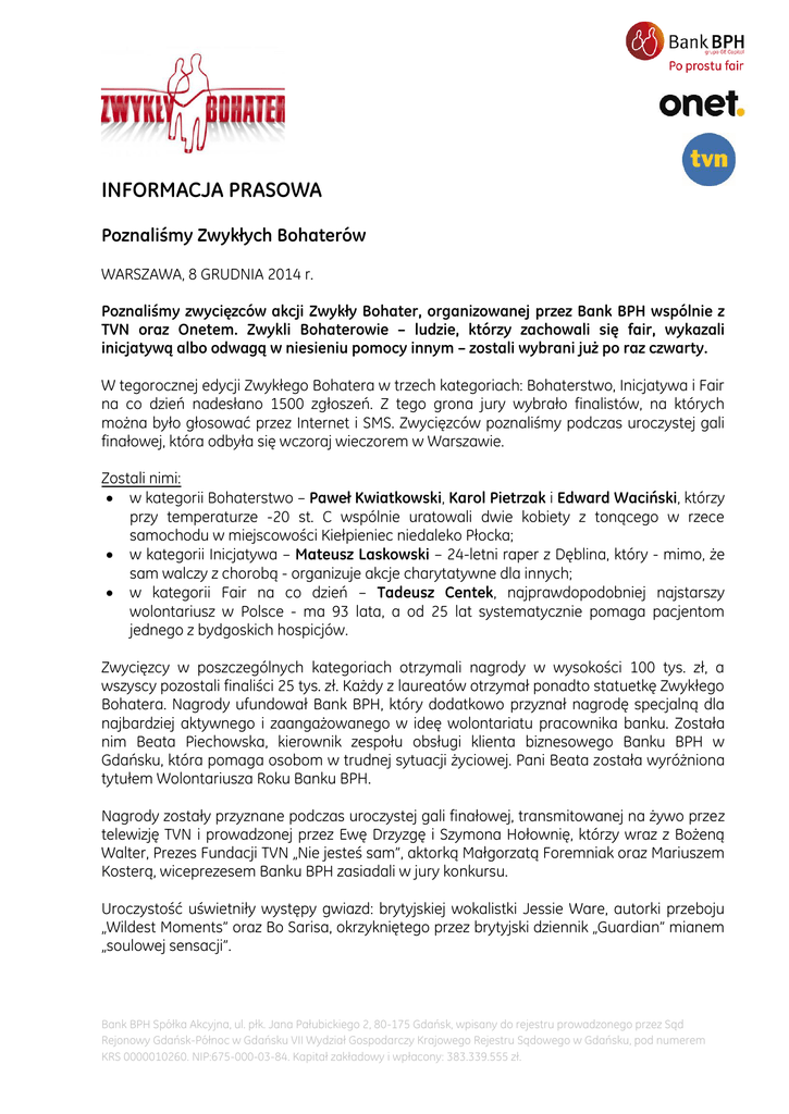 INFORMACJA PRASOWA Poznaliśmy Zwykłych Bohaterów WARSZAWA, 8 GRUDNIA 2014 r. Poznaliśmy zwycięzców akcji Zwykły Bohater, organizowanej przez Bank BPH wspólnie z TVN oraz Onetem. Zwykli Bohaterowie – ludzie, którzy zachowali się fair, wykazali inicjatywą albo odwagą w niesieniu pomocy innym – zostali wybrani już po raz czwarty. W tegorocznej edycji Zwykłego Bohatera w trzech kategoriach: Bohaterstwo, Inicjatywa i Fair na co dzień nadesłano 1500 zgłoszeń. Z tego grona jury wybrało finalistów, na których można było głosować przez Internet i SMS. Zwycięzców poznaliśmy podczas uroczystej gali finałowej, która odbyła się wczoraj wieczorem w Warszawie. Zostali nimi: w kategorii Bohaterstwo – Paweł Kwiatkowski, Karol Pietrzak i Edward Waciński, którzy przy temperaturze -20 st. C wspólnie uratowali dwie kobiety z tonącego w rzece samochodu w miejscowości Kiełpieniec niedaleko Płocka; w kategorii Inicjatywa – Mateusz Laskowski – 24-letni raper z Dęblina, który - mimo, że sam walczy z chorobą - organizuje akcje charytatywne dla innych; w kategorii Fair na co dzień – Tadeusz Centek, najprawdopodobniej najstarszy wolontariusz w Polsce - ma 93 lata, a od 25 lat systematycznie pomaga pacjentom jednego z bydgoskich hospicjów. Zwycięzcy w poszczególnych kategoriach otrzymali nagrody w wysokości 100 tys. zł, a wszyscy pozostali finaliści 25 tys. zł. Każdy z laureatów otrzymał ponadto statuetkę Zwykłego Bohatera. Nagrody ufundował Bank BPH, który dodatkowo przyznał nagrodę specjalną dla najbardziej aktywnego i zaangażowanego w ideę wolontariatu pracownika banku. Została nim Beata Piechowska, kierownik zespołu obsługi klienta biznesowego Banku BPH w Gdańsku, która pomaga osobom w trudnej sytuacji życiowej. Pani Beata została wyróżniona tytułem Wolontariusza Roku Banku BPH. Nagrody zostały przyznane podczas uroczystej gali finałowej, transmitowanej na żywo przez telewizję TVN i prowadzonej przez Ewę Drzyzgę i Szymona Hołownię, którzy wraz z Bożeną Walter, Prezes Fundacji TVN „Nie jesteś sam”, aktorką Małgorzatą Foremniak oraz Mariuszem Kosterą, wiceprezesem Banku BPH zasiadali w jury konkursu. Uroczystość uświetniły występy gwiazd: brytyjskiej wokalistki Jessie Ware, autorki przeboju „Wildest Moments” oraz Bo Sarisa, okrzykniętego przez brytyjski dziennik „Guardian” mianem „soulowej sensacji”. Bank BPH Spółka Akcyjna, ul. płk. Jana Pałubickiego 2, 80-175 Gdańsk, wpisany do rejestru prowadzonego przez Sąd Rejonowy Gdańsk-Północ w Gdańsku VII Wydział Gospodarczy Krajowego Rejestru Sądowego w Gdańsku, pod numerem KRS 0000010260. NIP:675-000-03-84. Kapitał zakładowy i wpłacony: 383.339.555 zł. Więcej informacji o akcji Zwykły Bohater na stronie www.zwyklybohater.pl. *** Bank BPH oferuje swoje produkty i usługi klientom indywidualnym, małym i średnim przedsiębiorstwom oraz klientom korporacyjnym. Oferta banku zawiera m. in.: kredyty, w tym gotówkowe i hipoteczne, konta osobiste, rachunki oszczędnościowe i lokaty oraz karty kredytowe. Klienci Banku mogą korzystać z sieci ponad 400 oddziałów i placówek partnerskich, a także agencji uniwersalnych, jak również z bankowości internetowej, telefonicznej oraz mobilnej. Bank BPH jest obecny na polskim rynku od ponad 20 lat. Jest spółką publiczną notowaną na Giełdzie Papierów Wartościowych w Warszawie i wchodzi w skład indeksu Respect. Siedzibą prawną Banku BPH jest Gdańsk, biuro centrali znajduje się w Warszawie, a główne centra operacyjne w Krakowie i Gdańsku. Bank BPH wchodzi w skład grupy kapitałowej GE, jednej z największych korporacji na świecie. Grupa Onet.pl, założona w 1996 r., to jedna z najbardziej rozpoznawalnych firm medialnych i wiodący wydawca online. Pionier Internetu w Polsce. Od 18 lat wiarygodna marka o silnym i pozytywnym wizerunku, koncentrująca się na zaspokajaniu potrzeb użytkowników z zakresu informacji, rozrywki, a także komunikacji. Do Grupy Onet.pl należą wiodące produkty internetowe m.in. Onet.pl - nieprzerwanie lider w rankingach polskich mediów internetowych (najbardziej znana marka wśród polskich mediów internetowych - TGI SMG/KRC, polskie medium online o największym zasięgu - GfK Media Efficency Panel 1Q2014); Sympatia.pl - od 12 lat największy serwis randkowy; Zumi.pl - największy serwis lokalizacyjny biznesu, VoD.pl - najpopularniejszy w Polsce serwis z bogatą ofertą - 4000 godzin wideo filmów, programów telewizyjnych, seriali, dokumentów, bajek od największych producentów i dystrybutorów; Plejada.pl - serwis informacyjno-rozrywkowy poświęcony gwiazdom show-biznesu; VUmag.pl - unikalny na polskim rynku magazyn internetowy, tworzony przy współpracy z gwiazdami show-biznesu; pclab.pl - największy i najpopularniejszy polski serwis o tematyce komputerowej, który wyróżniają bardzo wnikliwe i rzetelne artykuły tworzone przez dziennikarzy komputerowych czy medonet.pl - aktualne wiadomości dotyczące medycyny w kraju i na świecie. Grupa Onet.pl wraz z serwisami RASP dociera do ponad 15 milionów użytkowników miesięcznie, co stanowi ponad 70 procent wszystkich osób korzystających z internetu w Polsce. Od samego początku istnienia firmie towarzyszy najnowocześniejsza technologia, dzięki której m.in. zajmuje pozycję lidera ruchu mobilnego czy treści wideo. TVN jest wiodącym nadawcą telewizyjnym w Polsce. W ofercie TVN znajduje się jedenaście kanałów telewizyjnych: TVN, TVN 7, TTV, TVN24, TVN Meteo, TVN Style, TVN Turbo, iTVN, TVN24 Biznes i Świat, Telezakupy Mango i NTL Radomsko. W 2014 roku TVN został uznany przez miesięcznik „Media i Marketing Polska” za Nadawcę 20-lecia, a kanał główny TVN i stacja informacyjna TVN24 uzyskały pozycję najbardziej opiniotwórczych stacji telewizyjnych w Polsce w okresie ostatniej dekady wg raportu Instytutu Monitorowania Mediów. Oferta programowa TVN jest skierowana przed