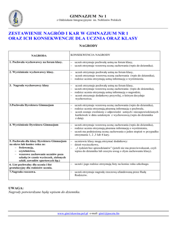 GIMNAZJUM Nr 1 z Oddziałami Integracyjnymi im. Noblistów Polskich ZESTAWIENIE NAGRÓD I KAR W GIMNAZJUM NR 1 ORAZ ICH KONSEKWENCJE DLA UCZNIA ORAZ KLASY NAGRODY KONSEKWENCJA NAGRODY NAGRODA 1. Pochwała wychowawcy na forum klasy. uczeń otrzymuje pochwałę ustną na forum klasy, uczeń otrzymuje wzorową ocenę zachowania (wpis do dziennika). 2. Wyróżnienie wychowawcy klasy. uczeń otrzymuje pochwałę ustną na forum klasy, uczeń otrzymuje wzorową ocenę zachowania (wpis do dziennika), rodzice ucznia otrzymują ustną informację o wyróżnieniu. 3. Nagroda wychowawcy klasy uczeń otrzymuje pochwałę ustną na forum klasy, uczeń otrzymuje wzorową ocenę zachowania (wpis do dziennika), rodzice ucznia otrzymują ustną informację o nagrodzie, uczeń otrzymuje dodatkowy przywilej, o którym decyduje wychowawca. 3.Pochwała Dyrektora Gimnazjum uczeń otrzymuje wzorową ocenę zachowania (wpis do dziennika), rodzice ucznia otrzymują pisemną informację o pochwale, uczeń zostaje zwolniony z odpowiedzi ustnych i niezapowiedzianych kartkówek w dniu ustalonym z wychowawcą (wpis do dziennika z datą). 4. Wyróżnienie Dyrektora Gimnazjum uczeń otrzymuje wzorową ocenę zachowania (wpis do dziennika), rodzice ucznia otrzymują pisemna informację o wyróżnieniu, uczeń ma podniesioną ocenę zachowania o jeden stopień w przypadku otrzymania 1, 2 ,3 lub 4 kary. 5. Pochwała dla klasy Dyrektora Gimnazjum na okres lub koniec roku za: frekwencję, czytelnictwo, wzorowe zachowanie uczniów poza szkołą (w czasie wycieczek, zielonych szkół, zawodów sportowych itp.) uczniowie klasy mogą otrzymać dodatkowy: dzień wycieczkowy, „1 tydzień bez sprawdzianów” (jeżeli nie ma przeciwwskazań, czyli wpisu do dziennika lub zeszytu uwag o złym zachowaniu klasy). 6. List pochwalny dla ucznia i list gratulacyjny dla rodziców ucznia. 7.Nagroda rzeczowa. uczeń i jego rodzice otrzymują listy na koniec roku szkolnego. uczeń otrzymuje nagrodę rzeczową ufundowaną przez Radę Rodziców. UWAGA: Nagrody potwierdzane będą wpisem do dziennika. www.gim1skawina.pol.pl e-mail: [email protected] GIMNAZJUM Nr 1 z Oddziałami Integracyjnymi im. Noblistów Polskich - PRZYWILEJE UCZNIA możliwość zgłoszenia nie przygotowania do lekcji, możliwość zgłoszenia braku zadania domowego, szczęśliwy numerek, udział ucznia w imprezach kulturalnych, sportowych, dyskotekach, wycieczkach. KARY KARA 1. 2. 3. 4. 5. KONSEKWENCJA Upomnienie wychowawcy na forum klasy uczeń otrzymuje naganną ocenę zachowania (wpis do dziennika), uczniowi zostają odebrane wszystkie przywileje na okres 1 tygodnia, uczeń nie może mieć oceny wzorowej na okres lub koniec roku. Nagana wychowawcy klasy uczeń otrzymuje naganną ocenę zachowania (wpis do dziennika), uczniowi zostają odebrane wszystkie przywileje na okres 1 miesiąca, uczeń może otrzymać na okres lub koniec roku co najwyżej ocenę dobrą (ocena może ulec zmianie dzięki otrzymaniu nagrody 4). Upomnienie Dyrektora Gimnazjum uczeń otrzymuje naganną ocenę zachowania (wpis do dziennika), uczniowi zostają odebrane wszystkie przywileje na okres 3 miesięcy, uczeń otrzymuje na okres lub koniec roku ocenę nieodpowiednią (ocena może ulec zmianie dzięki otrzymaniu nagrody 4). Nagana Dyrektora Gimnazjum Przeniesienie do równoległej klasy uczeń otrzymuje naganną ocenę zachowania (wpis do dziennika), uczniowi zostają odebrane wszystkie przywileje na okres 4 miesięcy, uczeń musi wykonać pracę na rzecz szkoły, uczeń otrzymuje na okres lub koniec roku ocenę naganną (ocena może ulec zmianie dzięki otrzymaniu nagrody 4). uczeń zostaje przeniesiony na stałe do równoległej klasy, uczeń otrzymuje naganną ocenę zachowania (wpis do dziennika), uczniowi zostają odebrane wszystkie przywileje na okres 6 miesięcy, uczeń otrzymuje na okres lub koniec roku ocenę naganną, uczeń musi wykonać pracę na rzecz szkoły. UWAGA: Kary muszą być odnotowane w dzienniku lekcyjnym i przyjęte do wiadomości przez rodziców ucznia i potwierdzone własnoręcznym podpisem w zeszycie korespondencji. www.gim1skawina.pol.pl e-mail: [email protected] GIMNAZJUM Nr 1 z Oddziałami Integracyjnymi im. Noblistów Polskich USTALENIA KOŃCOWE: 1. Każda ocena zachowania może zostać podwyższona o 1 stopień na wniosek wychowawcy, nauczyciela przedmiotu, dyrektora szkoły za: szczególne osiągnięcia naukowe (konkursy, olimpiady) na szczeblu rejonowym, wojewódzkim, ogólnopolskim, szczególne osiągnięcia sportowe na szczeblu rejonowym, wojewódzkim, ogólnopolskim, zarówno w konkurencjach indywidualnych jak i drużynowych, powołanie do kadry województwa lub kraju, za wysokiej klasy promocję szkoły zgodnie ze swoimi zainteresowaniami. 2. W szczególnych przypadkach – po konsultacji z Dyrektorem Gimnazjum, mogą zostać pominięte kolejne stopnie nagród i kar. Stan na 15.09.2015 www.gim1skawina.pol.pl e-mail: [email protected]