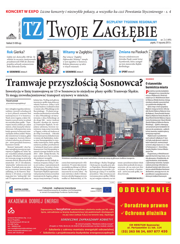 ISSN 2081-7983 KONCERT W EXPO Liczne koncerty i niezwykłe pokazy, a wszystko ku czci Powstania Styczniowego - s. 4 nr 2 (149) piątek, 11 stycznia 2013 r. Nakład 35 000 egz. Rok Gierka? Witamy w Zagłębiu Zmiana na Piaskach Gdyby żył, skończyłby 100 lat. To właśnie ta rocznica zmotywowała przedstawicieli FMS do złożenia projektu uchwały ustanowienia Roku Edwarda Gierka. Pięć witaczy "Zagłębie Dąbrowskie Witamy!" stanęło w tym tygodniu w Sosnowcu. Kolejne planowane są także w innych miastach. Nowym szkoleniowcem Górnika Piaski został Artur Szymkowski, który zastąpił na tym stanowisku Rafała Berlińskiego. n SOSNOWIEC strona 4 n SOSNOWIEC strona 4 n SPORT strona 8 Tramwaje przyszłością Sosnowca? Paweł Leśniak [email protected] Już w ubiegłym tygodniu informowaliśmy o powoli wchodzących w życie planach remontu linii tramwajowej nr 15 w Sosnowcu. Tunel, nowe wagony, a także 4 kilometry nowych torów to jednak nie wszystkie plany spółki. - Tramwajem można jeździć po całym mieście, a linie muszą być zhierarchizowane. Jeśli poprawimy szyny, każdy sprawny technicznie tramwaj będzie dobrze jeździł. Ważne, aby remontować te miejsca, gdzie jest najgorzej, bowiem klienci w końcu odwrócą się od tramwajów - mówi prezydent Sosnowca, Kazimierz Górski. Remont "piętnastki", choć będzie największą inwestycją tramwajową w Zagłębiu od "nastu" lat, nie wszystkim jednak przypada do gustu. Mieszkańcy bardzo często zwracają uwagę na potrzebę remontu dwóch, kluczowych dla miasta linii - 26 i 27. Ich zdaniem, "piętnastka" niekoniecznie jest istotna. To jednak może się zmienić po remoncie, bowiem plany zakładają, że do Katowic dojedziemy w 20 minut, a tramwaje mają mieć tzw. "zieloną falę". Jednak TŚ zaprezentowały plany na REKLAMA kolejne lata. Według nich główne inwestycje spółki mają dotyczyć właśnie Sosnowca. Jedną z nich ma być budowa i rozbudowa linii w rejonie ulicy Piłsudskiego aż do Baczyńskiego. - W planie jest generalna modernizacja torowiska w ulicy Piłsudskiego od skrzyżowania z ulicą Sobieskiego aż do drogi S86 - mówi Andrzej Bywalec, dyrektor ds. inwestycji Tramwajów Śląskich. To niejedyne założenia, bowiem wymienione mają zostać torowiska w Pogoni, a także od Andersa aż do Orląt Lwowskich. - Odcinki linii tramwajowej zlokalizowane w rejonie ulic Będzińskiej, Andersa oraz Staropogońskiej to torowiska tramwajowe, które spółka zamierza poddać przebudowie w kolejnych latach przy udziale finansowym Unii Europejskiej w ramach nowego budżetu na lata 2014 – 2020 - dodaje Bywalec. Na razie jednak jest zbyt wcześnie, aby podawać szczegóły. Największa ma być jednak inwestycja związana z linią 27, która jest jedną z najważniejszych dla Sosnowca. Na jednej z komisji Rady Miejskiej przedstawiciele Tramwajów Śląskich zaprezentowali pomysł powstania nowej linii tramwajowej do Zagórza, połączenia jej z trasą tramwaju 27 oraz łą- FOTO: PL Inwestycja w linię tramwajową nr 15 w Sosnowcu to niejedyne plany spółki Tramwaje Śląskie. Te mogą zrewolucjonizować transport szynowy w mieście. Wieloletnie zaniedbania mają zostać nadrobione, a tramwaje staną się głównym środkiem transportu. czenia linii tramwajowych w Klimontowie. W sumie taka inwestycja miałaby pochłonąć aż 180 milionów złotych, z czego 80 przeznaczono by na nowy tabor. - Na razie mówimy o około 4-kilometrowym odcinku biegnącym m.in. wzdłuż ul. Białostockiej, al. Pa- derewskiego i Rydza Śmigłego i kończącym się pętlą przy placu Papieskim. Kwestia dalszego poprowadzenia torowiska i połączenia go z linią 27 to melodia przyszłości. Taka inwestycja jest rozważana przez spółkę. Odbyły się już wstępne rozmowy na ten 13_02147_1 temat z przedstawicielami władz miasta, które podeszły do niej pozytywnie, ale na razie jest zbyt wcześnie, by mówić o konkretach – mówi rzecznik spółki, Andrzej Zowada. n DOKOŃCZENIE NA STR. 2 REKLAMA WOJKOWICE O stanowisko burmistrza miasta P oznaliśmy nazwiska kandydatów ubiegających się o stanowisko burmistrza w Wojkowicach. Wśród nich znalazł się m.in. Witold Kwiecień (Komitet Wyborczy Witolda Kwietnia), którego mieszkańcy odwołali z powyższej funkcji w październiku ubiegłego roku. Oprócz niego o miano gospodarza Wojkowic starają się również: Zofia Gajdzik (Komitet Wyborczy Wyborców Serca dla Wojkowic), Dorota Kowalik (Komitet Wyborczy Wyborców Doroty Kowalik), Tadeusz Wtorek (Komitet Wyborczy Sojuszu Lewicy Demokratycznej) i Marcin Wroński (Komitet Wyborczy Wyborców Marcina Wrońskiego). - Zgodnie z obowiązującymi przepisami grono kandydatów nie może już ulec powiększeniu - podkreśliła Anna Jaworecka, urzędnik wyborczy tamtejszego magistratu. Wojkowiczanie w przedterminowych wyborach (odbędą się 27 stycznia) będą mogli głosować w pięciu lokalach wyborczych, rozmieszczonych na terenie całego miasta m.in. w: Szkole Podstawowej nr 1, Domu Kultury, Urzędzie Miejskim i Centrum Młodzieżowym Tlen. Przypominamy, że Witold Kwiecień poprzedni burmistrz tego miasta, w wyniku głosowania z 28 października, decyzją mieszkańców, został odwołany z zajmowanego stanowiska. O przeprowadzaniu jesiennego referendum zadecydowali tamtejsi radni, którzy wcześniej nie udzielili Witoldowi Kwietniowi absolutorium, zarzucając mu m.in. nieprawidłowości w gospodarowaniu budżetowymi środkami finansowymi. ŁD 13_02265_1 PIĄTEK, 11 STYCZNIA 2013 | NR 2 (149) » SOSNOWIEC 11-13.01 Expo Silesia. 6. edycja Międzynarodowych Targów Gołębi Pocztowych EXPOGołębie 2013. Start w piątek o 13. Sb i nd od 7.00. Wstęp 20 zł. 11.01 - Teatr Zagłębia. Spektakl Remigiusza Brzyka, Korzeniec. Start o 19. Bilety od 20 zł. 13.01 - CH Plejada. Wielka Orkiestra Świątecznej Pomocy. Start od 10.30. W programie liczne koncerty. 13.01 - Zespół Szkół Architektoniczno-Budowlanych. WOŚP. W programie konkursy i licy