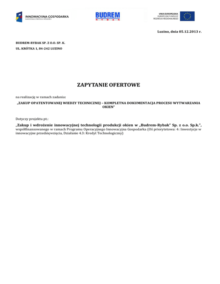 Luzino, dnia 05.12.2013 r. BUDREM-RYBAK SP. Z O.O. SP. K. UL. KRÓTKA 1, 84-242 LUZINO ZAPYTANIE OFERTOWE na realizację w ramach zadania: „ZAKUP OPATENTOWANEJ WIEDZY TECHNICZNEJ – KOMPLETNA DOKUMENTACJA PROCESU WYTWARZANIA OKIEN” Dotyczy projektu pt.: „Zakup i wdrożenie innowacyjnej technologii produkcji okien w „Budrem-Rybak” Sp. z o.o. Sp.k.”, współfinansowanego w ramach Programu Operacyjnego Innowacyjna Gospodarka (Oś priorytetowa: 4: Inwestycje w innowacyjne przedsięwzięcia, Działanie 4.3: Kredyt Technologiczny) 1. CEL Celem niniejszego zapytania ofertowego jest uzyskanie ofert na realizację zadania wskazanego w preambule. Niniejszy dokument zawiera specyfikację przedmiotu zapytania ofertowego, opis oczekiwanego formatu oferty oraz warunki jej złożenia. 2. WARUNKI FORMALNE POSTĘPOWANIA OFERTOWEGO BUDREM-RYBAK Sp. z o.o. Sp. k. dokona wyboru Dostawcy na podstawie ofert złożonych zgodnie z wymaganiami określonymi w niniejszym zapytaniu ofertowym. Wszelkie zmiany, dodatkowe informacje lub poprawki będą dokonywane w formie pisemnej. Przez formę pisemną BUDREM-RYBAK Sp. z o.o. Sp. k. rozumie również zadanie pytania na adres email wskazany do kontaktu w sprawach zapytania ofertowego. Informacje zawarte w niniejszym dokumencie są poufnymi danymi BUDREM-RYBAK Sp. z o.o. Sp. k. i zostały podane wyłącznie w celu uzyskania odpowiedzi na zapytanie ofertowe. Dokument oraz wszystkie jego kopie są własnością BUDREM-RYBAK Sp. z o.o. Sp. k.. Zawartość dokumentu ma charakter poufny i nie może być ujawniona osobom trzecim bez wcześniejszej zgody BUDREM-RYBAK Sp. z o.o. Sp. k.. BUDREM-RYBAK Sp. z o.o. Sp. k. zastrzega sobie prawo do rezygnacji z procesu postępowania ofertowego, dowolnego wyboru podmiotu/podmiotów, z którymi będą prowadzone negocjacje w odniesieniu do części lub całości zakresu złożonych ofert oraz do zawarcia umowy z więcej, niż jednym dostawcą wyłonionym w drodze negocjacji, przy czym zakres umowy może obejmować całość lub część zakresu złożonej odpowiedzi na zapytanie ofertowe. Wszelkie koszty przygotowania i dostarczenia oferty ponosi Oferent. Każdy z Oferentów otrzyma informację o rozstrzygnięciu, wstrzymaniu lub odstąpieniu od postępowania ofertowego. 3. FORMAT OFERTY Oferta powinna zawierać wycenę poszczególnych komponentów. Wycena powinna być dokonana w cenach netto i brutto w złotych polskich. Oferta może zostać sporządzona na wypełnionym i podpisanym formularzu ofertowym stanowiącym Załącznik nr 1 do niniejszego zapytania. Oferta powinna być kompletna i zawierać wycenę wszystkich maszyn / urządzeń, oprogramowania, usług, elementów opcjonalnych, prowadzenia projektu, wizji lokalnych oraz audytu konfiguracji (w zależności od przedmiotu zapytania ofertowego). Oferty powinny potwierdzać, że Oferent będzie wystawiał faktury z uwzględnieniem 30-dniowego terminu płatności licząc od dnia otrzymania faktury przez BUDREM-RYBAK Sp. z o.o. Sp. k., chyba że uzgodniono inaczej. W ofercie należy wskazać termin ważności oferty (minimum 30 dni) i dane osoby kontaktowej. 4. MIEJSCE I TERMIN SKŁADANIA OFERT Oferty prosimy składać email’em lub opcjonalnie w jednym papierowym egzemplarzu do dnia 20.12.2013 roku na adres: BUDREM-RYBAK SP. Z O.O. SP. K. UL. KRÓTKA 1, 84-242 LUZINO Nazwa Postępowania Ofertowego: „ZAKUP OPATENTOWANEJ WIEDZY TECHNICZNEJ – KOMPLETNA DOKUMENTACJA PROCESU WYTWARZANIA OKIEN” Dodatkowych wyjaśnień w sprawie oferty udzielać będą: Informacje techniczne: Arkadiusz Rybak tel. 58/678-14-30 mail: [email protected] Informacje handlowe: Jolanta Szczepanowska, kom. 695-350-036 mail: [email protected] 5. KRYTERIA WYBORU OFERT CENA: 100% 6. PRZEDMIOT ZAPYTANIA OFERTOWEGO WRAZ Z PODSTAWOWĄ SPECYFIKACJĄ Przedmiotem zapytania ofertowego jest zakup opatentowanej wiedzy technicznej - kompletnej dokumentacji procesu wytwarzania okien w nowy sposób produkcji okien z tworzywa sztucznego, którego wdrożenie prowadzi do uzyskania okien o wyższej energooszczędności, dźwiękoszczelności i estetyce do wyrobów wytwarzanych tradycyjnymi metodami. 7. WARUNKI REALIZACJI USŁUGI/DOSTAWY Cena powinna obejmować: - koszt nabycia opatentowanej wiedzy technicznej – kompletnej dokumentacji procesu wytwarzania okien.