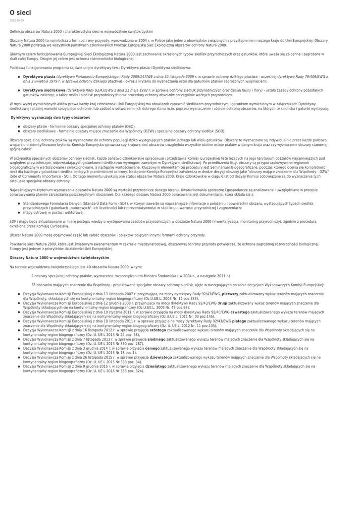 O sieci 2013-10-29 Definicja obszarów Natura 2000 i charakterystyka sieci w województwie świętokrzyskim Obszary Natura 2000 to najmłodsza z form ochrony przyrody, wprowadzona w 2004 r. w Polsce jako jeden z obowiązków związanych z przystąpieniem naszego kraju do Unii Europejskiej. Obszary Natura 2000 powstają we wszystkich państwach członkowskich tworząc Europejską Sieć Ekologiczną obszarów ochrony Natura 2000. Głównym celem funkcjonowania Europejskiej Sieci Ekologicznej Natura 2000 jest zachowanie określonych typów siedlisk przyrodniczych oraz gatunków, które uważa się za cenne i zagrożone w skali całej Europy. Drugim jej celem jest ochrona różnorodności biologicznej. Podstawą funkcjonowania programu są dwie unijne dyrektywy tzw.: Dyrektywa ptasia i Dyrektywa siedliskowa: Dyrektywa ptasia (dyrektywa Parlamentu Europejskiego i Rady 2009/147/WE z dnia 30 listopada 2009 r. w sprawie ochrony dzikiego ptactwa - wcześniej dyrektywa Rady 79/409/EWG z dnia 2 kwietnia 1979 r. w sprawie ochrony dzikiego ptactwa) - określa kryteria do wyznaczania ostoi dla gatunków ptaków zagrożonych wyginięciem; Dyrektywa siedliskowa (dyrektywa Rady 92/43/EWG z dnia 21 maja 1992 r. w sprawie ochrony siedlisk przyrodniczych oraz dzikiej fauny i flory) - ustala zasady ochrony pozostałych gatunków zwierząt, a także roślin i siedlisk przyrodniczych oraz procedury ochrony obszarów szczególnie ważnych przyrodniczo. W myśl wyżej wymienionych aktów prawa każdy kraj członkowski Unii Europejskiej ma obowiązek zapewnić siedliskom przyrodniczym i gatunkom wymienionym w załącznikach Dyrektywy siedliskowej i ptasiej warunki sprzyjające ochronie, lub zadbać o odtworzenie ich dobrego stanu m.in. poprzez wyznaczenie i objęcie ochroną obszarów, na których te siedliska i gatunki występują. Dyrektywy wyznaczają dwa typy obszarów: obszary ptasie - formalnie obszary specjalnej ochrony ptaków (OSO), obszary siedliskowe - formalnie obszary mające znaczenie dla Wspólnoty (OZW) / specjalne obszary ochrony siedlisk (SOO). Obszary specjalnej ochrony ptaków są wyznaczane do ochrony populacji dziko występujących ptaków jednego lub wielu gatunków. Obszary te wyznaczane są indywidualnie przez każde państwo, w oparciu o zidentyfikowane kryteria. Komisja Europejska sprawdza czy krajowa sieć obszarów uwzględnia wszystkie istotne ostoje ptaków w danym kraju oraz czy wyznaczone obszary stanowią spójną całość. W przypadku specjalnych obszarów ochrony siedlisk, każde państwo członkowskie opracowuje i przedstawia Komisji Europejskiej listę leżących na jego terytorium obszarów najcenniejszych pod względem przyrodniczym, odpowiadających gatunkowo i siedliskowo wymogom zawartym w Dyrektywie siedliskowej. Po przedłożeniu listy, obszary są przyporządkowywane regionom biogeograficznym wartościowane i selekcjonowane, a następnie wartościowane. Kluczowym elementem tej procedury jest Seminarium Biogeograficzne, podczas którego ocenia się kompletność sieci dla każdego z gatunków i siedlisk będących przedmiotami ochrony. Następnie Komisja Europejska zatwierdza w drodze decyzji obszary jako "obszary mające znaczenie dla Wspólnoty - OZW" (Site of Community Importance - SCI). Od tego momentu uzyskują one status obszarów Natura 2000. Kraje członkowskie w ciągu 6 lat od decyzji Komisji zobowiązane są do wyznaczenia tych ostoi jako specjalne obszary ochrony. Najważniejszym kryterium wyznaczania obszarów Natura 2000 są wartości przyrodnicze danego terenu. Uwarunkowania społeczne i gospodarcze są analizowane i uwzględniane w procesie opracowywania planów zarządzania poszczególnymi obszarami. Dla każdego obszaru Natura 2000 opracowana jest dokumentacja, która składa się z: Standardowego Formularza Danych (Standard Data Form - SDF), w którym zawarte są najważniejsze informacje o położeniu i powierzchni obszaru, występujących typach siedlisk przyrodniczych i gatunkach „naturowych", ich liczebności lub reprezentatywności w skali kraju, wartości przyrodniczej i zagrożeniach; mapy cyfrowej w postaci wektorowej. SDF i mapy będą aktualizowane w miarę postępu wiedzy o występowaniu zasobów przyrodniczych w obszarze Natura 2000 (inwentaryzacja, monitoring przyrodniczy), zgodnie z procedurą określoną przez Komisję Europejską. Obszar Natura 2000 może obejmować część lub całość obszarów i obiektów objętych innymi formami ochrony przyrody. Powstanie sieci Natura 2000, która jest światowym ewenementem w zakresie międzynarodowej, obszarowej ochrony przyrody potwierdza, że ochrona zagrożonej różnorodności biologicznej Europy jest jednym z priorytetów działalności Unii Europejskiej. Obszary Natura 2000 w województwie świętokrzyskim Na terenie województwa świętokrzyskiego jest 40 obszarów Natura 2000, w tym: 2 obszary specjalnej ochrony ptaków, wyznaczone rozporządzeniem Ministra Środowiska ( w 2004 r., a następnie 2011 r.) 38 obszarów mających znaczenie dla Wspólnoty - projektowane specjalne obszary ochrony siedlisk, ujęte w następujących po sobie decyzjach Wykonawczych Komisji Europejskiej: Decyzja Wykonawcza Komisji Europejskiej z dnia 13 listopada 2007 r. przyjmująca, na mocy dyrektywy Rady 92/43/EWG, pierwszy zaktualizowany wykaz terenów mających znaczenie dla Wspólnoty, składających się na kontynentalny region biogeograficzny (Dz.U.UE.L. 2008 Nr. 12 poz.383), Decyzja Wykonawcza Komisji Europejskiej z dnia 12 grudnia 2008 r. przyjmująca na mocy dyrektywy Rady 92/43/EWG drugi zaktualizowany wykaz terenów mających znaczenie dla Wspólnoty składających się na kontynentalny region biogeograficzny (Dz.U.UE.L. 2009 Nr. 43 poz.63), Decyzja Wykonawcza Komisji Europejskiej z dnia 10 stycznia 2011 r. w sprawie przyjęcia na mocy dyrektywy Rady 92/43/EWG czwartego zaktualizowanego wykazu terenów mających znaczenie dla Wspólnoty składających się na kontynentalny region biogeograficzny