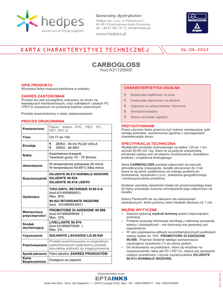 Generalny dystrybutor: Hedpes Sp. z o.o. ul. Folwarczna 1, 62-081 Przeźmierowo (koło Poznania), tel. +48 61 663 79 15, [email protected] KARTA CHARAKTERYSTYKI TECHNICZNEJ 06.08.2013 CARBOGLOSS Kod A31126000 OPIS PRODUKTU Winylowa farba rozpuszczalnikowa w połysku. CHARAKTERYSTYKA OGÓLNA ZAKRES ZASTOSOWAŃ · Doskonała stabilność na sicie Produkt ten jest szczególnie wskazany do druku na klawiaturach membranowych, oraz naklejkach i płytach PC i PET-G używanych do produkcji kasków rowerowych · Doskonała odporność na alkohol · Odporna na sztancowanie i tłoczenie · Termoformowalna · Wolna od metali cięzkich Produkt wszechstronny o wielu zastosowaniach. PROCES DRUKOWANIA Powierzchnie Papier, karton, PVC, PES, PC, PET, PET-G T/cm Od 77 do 140 Emulsja · · Rakla Kwadratowa krawędź. Twardość gumy 70 - 75 Shores Utwardzanie W temperaturze pokojowej 20 minut. W temperaturze 50-60°C kilka minut. SPECYFIKACJA TECHNICZNA ZERO - IN SV PLUS VIOLA ZERO - IN SRV Wydajność produktu drukowanego na siatce 120 wł. / cm, wynosi 50-60 m2 / kg. Dane te są jedynie wskazówką, ponieważ zależą one od stopnia rozcieńczenia, charakteru podłoża i urządzenia drukującego. DILUENTE 90.913 NORMALE INODORE Rozcieńczalnik DILUENTE 90.924 DILUENTE 90.918 LENTO TIXO-VINYL RETARDER 8159-V-9 (kod A31490888001) Max. 30% Opóźniacz PRZYGOTOWANIE Przed użyciem farba powinna być dobrze wymieszana, jeśli istnieje potrzeba, rozcieńczona zgodnie z wymaganiami charakterystyki druku. . 90.923 RITARDANTE INODORE (kod A31890923001) Wzmacniacz przyczepności PROMOTORE DI ADESIONE 90.908 (kod A31890908000 ) Max. 10% Środek wyrównujący LIVELLANTE 90.970 (kod A31890970000 ) Max. 2% Czyszczenie SOLVENTE LAVAGGIO LQ 90.920 Seria CARBOGLOSS posiada odporność na warunki atmosferyczne (niepogoda, światło słoneczne) do 3 lat. Dane te są silnie uzależnione od rodzaju podłoża do drukowania, wysokości n.p.m., położenia geograficznego i zanieczyszczenia powietrza. Dodanie wysokiej zawartości białej lub przezroczystego bazy do farby powoduje znaczne zmniejszenie jego odporności na światło. Kolory Pantone® nie są zalecane dla zastosowań zewnętrznych, które powinny mieć trwałość dłuższą niż 1 rok. WAŻNE WYTYCZNE ź ź ź Produkt przechowywany w oryginalnym Przechowywanie zaplombowanym opakowaniu posiada dwu-letnią zdatność do magazynowania. ź Sposób pakowania Patrz tabelka ZAKRES PRODUKTÓW Karta Dostępna na żądanie Bezpieczeństwa Zawsze wykonaj wydruk testowy przed rozpoczęciem produkcji. Podanie powyżej informacje wynikają z zebranej wcześniej wiedzy i doświadczeń - nie stanowią one gwarancji ani zapewnienia. W celu poprawenia adhezji na problematycznych podłożach należy dodać do 10% PROMOTORE DI ADESIONE 90.908. Poprzez dodanie takiego wzmacniacza uzyskujemy żywotność (?) do ośmiu godzin. Do drukowania na podłożach, które są wrażliwe na rozpuszczalniki, takie jak PC i PET-G, zaleca się osuszanie ciepłym powietrzem i użycia rozcieńczalnika DILUENTE 90.913 NORMALE INODORE. Epta Inks SpA - Via A. De Gasperim, 1 - 22070 Luisago (CO), Italy - Tel. +390319090111 - Fax +3903192005 strona 1/3 Wyprodukowano przez: Generalny dystrybutor: Hedpes Sp. z o.o. ul. Folwarczna 1, 62-081 Przeźmierowo (koło Poznania), tel. +48 61 663 79 15, [email protected] KARTA CHARAKTERYSTYKI TECHNICZNEJ 06.08.2013 CARBOGLOSS Kod A31126000 ASORTYMENT CZERNIE i BIELE SYSTEM CZTEROKOLOROWY KOD PRODUKT OPAKOWANIE KOD PRODUKT OPAKOWANIE A31126100001 WHITE TOYS 1 kg A31126297001 YELLOW EUROPE TOYS 1 kg A3112610100- OPAQUE WHITE TOYS 1 kg i 5 kg A31126397001 MAGENTA EUROPE TOYS 1 kg A3112610200- BACKGR. WHITE TOYS 1 kg i 5 kg A31126497001 CYAN EUROPE TOYS 1 kg A31126700001 BLACK TOYS 1 kg A31126797001 BLACK EUROPE TOYS 1 kg A31126701001 OPAQUE BLACK TOYS 1 kg A31126880001 THIXOTROPIC GEL TOYS 1 kg KOLORY NIEPRZEZORCZYSTE KOLORY TRANSPARENTNE KOD PRODUKT OPAKOWANIE KOD PRODUKT OPAKOWANIE A31126200001 PRIMEROSE YELL. TOYS 1 kg A31126227001 YELLOW TRANSP. TOYS 1 kg A31126202001 CHROME YELLOW TOYS 1 kg A31126321001 ORANGE TRANSP. TOYS 1 kg A31126301001 ORANGE TOYS 1 kg A31126326001 RED TRANSP. TOYS 1 kg A31126302001 SCARLET TOYS 1 kg A31126327001 MAGENTA TRANSP. TOYS 1 kg A31126303NF001 RED TOYS 1 kg A31126332001 SCARLET TRANSP. TOYS 1 kg A31126304001 RUBY RED TOYS 1 kg A31126426001 BRILL. BLUE TRANS. TOYS 1 kg A31126343001 PINK TOYS 1 kg A31126427001 ULTR. BLUE TRANS. TOYS 1 kg A31126401001 COBALT BLUE TOYS 1 kg A31126527001 GREEN TRANSP. TOYS 1 kg A31126403001 ULTRAMARINE BLUE TOYS 1 kg A31126404001 BRILLIANT BLUE TOYS 1 kg A31126440001 VIOLET TOYS 1 kg A31126541001 GREEN TOYS 1 kg INNE PRODUKTY BAZY AMC KOD PRODUKT OPAKOWANIE A31126P200001 AMC PRIMEROSE YELLOW 1 kg A31126P202001 AMC CHROME YELLOW TOYS 1 kg A31126P301001 AMC ORANGE TOYS 1 kg A31126P303001 AMC RED TOYS 1 kg A31126P305001 AMC CARMINE RED TOYS 1 kg A31126P342001 AMC PINK TOYS 1 kg A31126P404001 AMC BRILLIANT BLUE TOYS 1 kg A31126P440001 AMC VIOLET TOYS 1 kg A31126P500001 AMC LEAF GREEN TOYS 1 kg KOD PRODUKT OPAKOWANIE A31126800001 TRANSPARENT BASE TOYS 1 kg A31126850001 BRONZE BINDER TOYS 1 kg A31126125001 SILVER NO LEAFING 1 kg W celu uzyskania kolorów metalicznych lub fluoroscencyjnych, należy dodać pigmentów (kod A31196000) do CARBOGLOSS BRONZE BINDER TOYS A31126850001 według następujących wytycznych procentowych: ź ź ź 10-15% proszek srebrny 20-25% proszek złoty 20-30% pigment fluoroscencyjny Epta Inks SpA - Via A. De Gasperim, 1 - 22070 Luisago (CO), Italy - Tel. +390319090111 - Fax +3903192005 strona 2/3 Wyprodukowano przez: Generalny dystrybutor: Hedpes Sp. z o.o. ul. Folwarczna 1, 62-081 Przeźmierowo (koło Poznania), tel. +48 61 663 79 15, [email protected] KARTA CHARAKTERYSTYKI TECHNICZNEJ 06.08.2013 CARBOGLOSS Kod A31126000 UWAGA! Informacje podane w niniejszej Karcie Charakterystyki Technicznej nie są kompletne, a każda osoba, używająca produktu do celów innych niż zalecane w tej Karci