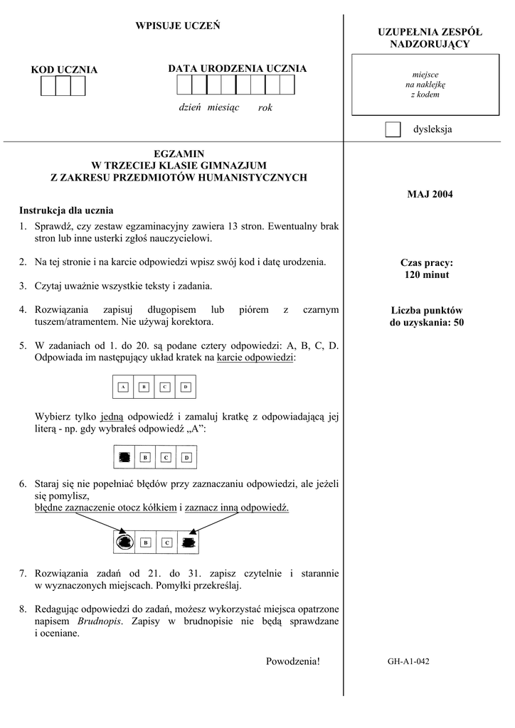 WPISUJE UCZEŃ UZUPEŁNIA ZESPÓŁ NADZORUJĄCY DATA URODZENIA UCZNIA KOD UCZNIA dzień miesiąc miejsce na naklejkę z kodem rok dysleksja EGZAMIN W TRZECIEJ KLASIE GIMNAZJUM Z ZAKRESU PRZEDMIOTÓW HUMANISTYCZNYCH MAJ 2004 Instrukcja dla ucznia 1. Sprawdź, czy zestaw egzaminacyjny zawiera 13 stron. Ewentualny brak stron lub inne usterki zgłoś nauczycielowi. 2. Na tej stronie i na karcie odpowiedzi wpisz swój kod i datę urodzenia. 3. Czytaj uważnie wszystkie teksty i zadania. 4. Rozwiązania zapisuj długopisem lub tuszem/atramentem. Nie używaj korektora. piórem z czarnym Czas pracy: 120 minut Liczba punktów do uzyskania: 50 5. W zadaniach od 1. do 20. są podane cztery odpowiedzi: A, B, C, D. Odpowiada im następujący układ kratek na karcie odpowiedzi: A B C D Wybierz tylko jedną odpowiedź i zamaluj kratkę z odpowiadającą jej literą - np. gdy wybrałeś odpowiedź „A”: 6. Staraj się nie popełniać błędów przy zaznaczaniu odpowiedzi, ale jeżeli się pomylisz, błędne zaznaczenie otocz kółkiem i zaznacz inną odpowiedź. 7. Rozwiązania zadań od 21. do 31. zapisz czytelnie i starannie w wyznaczonych miejscach. Pomyłki przekreślaj. 8. Redagując odpowiedzi do zadań, możesz wykorzystać miejsca opatrzone napisem Brudnopis. Zapisy w brudnopisie nie będą sprawdzane i oceniane. Powodzenia! GH-A1-042 Moda ma swoją historię Tekst I Oceniając modę wyłącznie jako kaprys na użytek pań i panów, upraszczamy to pojęcie. Moda z reguły nie wyrasta z niczego. Zawsze jest uwarunkowana jakimiś nowymi zjawiskami w stosunkach społecznych, w polityce, psychologii, a nawet filozofii, na przykład przejawiającą się w modzie retro i folk tęsknotą za dawnymi czasami. Źródłem mody są także nowe prądy w sztuce. Wspomnijmy owe sukienki letnie w stylu op-artowym1 z tkanin deseniowanych albo szczególnie silny wpływ sztuki pop na upodobanie do tanich, efekciarskich ozdób, do zwielokrotnionych łańcuchów na szyi, bransolet, pierścionków. Nie jest zjawiskiem rzadkim w historii, że jakaś moda zyskuje charakter manifestacji politycznej. W okresie Sejmu Czteroletniego wybuchła nawet zażarta walka między obrońcami sarmatyzmu, dla których wąsy stanowiły narodowy symbol, a zwolennikami nowego ducha oświecenia, którzy dumnie eksponowali gładkie lica. Z kolei w okresie manifestacji patriotycznych na początku lat 60. XIX wieku, a także po upadku powstania styczniowego w 1864 roku Ogród Saski w Warszawie wypełniał w godzinach spacerów tłum kobiet i mężczyzn ubranych w czerń. Także współczesność dostarcza nam dowodów na wyrastanie mody z ruchów społecznych czy politycznych. Za czasów okupacji hitlerowskiej wysokie buty z cholewami oznaczały sympatyzowanie z podziemnymi organizacjami, długie włosy u mężczyzn w latach pięćdziesiątych były wyznacznikiem niechęci do poczynań władzy ludowej, kolorowe pończochy u dziewcząt – nieco później – wyrazem buntu przeciw zetempowskiej2 szarości. A dżinsy to już nie tylko część garderoby, ale symbol. U początków swej szalonej kariery stały się wizytówką postawy wobec świata, wyzwaniem rzuconym dotychczasowej hierarchii wartości społecznie pożądanych. Bo dziś przez swoją totalną popularyzację zatraciły już ideologiczne znaczenie. Stały się w efekcie zwykłym objawem mody. A więcej nawet – terrorem. Wobec fanatyzmu dżinsowego można podziwiać odwagę tych, którzy noszą jeszcze innego typu spodnie i spódnice. Zawsze ubiór był sumą znaków. Dzięki ubiorowi różnice były widoczne na pierwszy rzut oka. Tym bardziej, że niektóre ubiory stawały się zastrzeżone dla pewnych klas. Na przykład w 1613 roku ustanowiono, że plebejuszom i mieszczanom nie wolno nosić kosztownych futer ani też szat z jedwabiów. W późniejszych wiekach już co prawda nie formułowano zakazów, ale próby przeskoczenia barier stanowych bywały obiektem szyderstw. Współcześnie jesteśmy zewnętrznie w pełni zdemokratyzowani. Jednak nadal „suknia chce coś wyrazić” – nie pozycję społeczną czy sytuację finansową, ale ogólny poziom kultury, rodzaj upodobań, wyobraźnię, nawet stan ducha. Dlatego tak słuszne wydaje mi się stwierdzenie Jeana-Paula Fargue’a, że „kto przechodzi obok mody, przechodzi obok życia”. Na podstawie: Teresa Kuczyńska, Moda w rytmie epoki, Warszawa 1979. 1 2 op-art – styl w sztuce XX wieku zetempowski – przymiotnik odnoszący się do nazwy organizacji młodzieżowej istniejącej w latach 1948-1957 Strona 2 z 13 Do rozwiązania zadań od 1. do 12. wykorzystaj tekst I. Zadanie 1. (0-1) Głównym tematem tekstu I są rozważania o A. B. C. D. historii. modzie. polityce. biżuterii. Zadanie 2. (0-1) Na upodobanie do efekciarskich ozdób wyjątkowo mocno wpłynął styl A. B. C. D. pop. folk. retro. op-art. Zadanie 3. (0-1) Związek przyczynowo-skutkowy jest przedstawiony w szeregu: A. moda na wąsy rozwój sarmatyzmu B. tęsknota za przeszłością C. moda na czarne stroje D. niechęć do rządów komunistycznych moda retro klęska powstania styczniowego moda na wysokie buty z cholewami Zadanie 4. (0-1) Pierwsi zwolennicy dżinsowej mody wyrażali swoim ubiorem przede wszystkim A. B. C. D. tęsknotę za utraconą przeszłością. sprzeciw wobec zastanej rzeczywistości. potrzebę podkreślenia swojej zamożności. akceptację panujących stosunków społecznych. Zadanie 5. (0-1) Fanatyzm, np. dżinsowy, przejawia się w A. B. C. D. narzucaniu innym własnych upodobań. tolerancji wobec innych przekonań. akceptacji ludzi o odmiennych poglądach. krytycznym odnoszeniu się do własnych gustów. Strona 3 z 13 Zadanie 6. (0-1) W XVIII i XIX wieku ubieranie się niezgodnie z modą typową dla określonej warstwy społecznej często wywoływało A. B. C. D. drwinę. zawiść. obawę. zazdrość. Zadanie 7. (0-1) Stwierdzenie: Współcześnie jesteśmy zewnętrznie w pełni zdemokratyzowani w kontekście akapitu oznacza, że A.