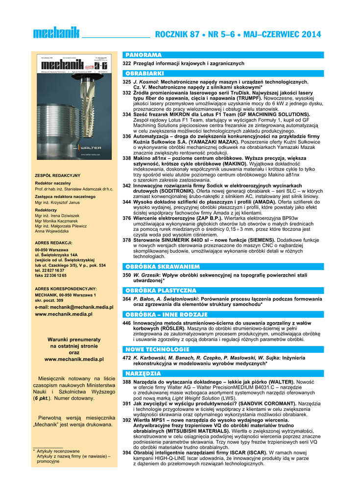 ROCZNIK 87 • NR 5–6 • MAJ–CZERWIEC 2014 PANORAMA 322 Przegląd informacji krajowych i zagranicznych OBRABIARKI ZESPÓŁ REDAKCYJNY Redaktor naczelny Prof. dr hab. inż. Stanisław Adamczak dr h.c. Zastępca redaktora naczelnego Mgr inż. Krzysztof Janus Redaktorzy Mgr inż. Irena Dziwiszek Mgr Monika Kaczmarek Mgr inż. Małgorzata Pilewicz Anna Wojewódzka ADRES REDAKCJI: 00-050 Warszawa ul. Świętokrzyska 14A (wejście od ul. Świętokrzyskiej lub ul. Czackiego 3/5), V p., pok. 534 tel. 22 827 16 37 faks 22 336 12 65 ADRES KORESPONDENCYJNY: MECHANIK, 00-950 Warszawa 1 skr. poczt. 309 e-mail: [email protected] www.mechanik.media.pl Warunki prenumeraty na ostatniej stronie oraz www.mechanik.media.pl 325 J. Kosmol: Mechatroniczne napędy maszyn i urządzeń technologicznych. Cz. V. Mechatroniczne napędy z silnikami skokowymi* 332 Źródła promieniowania laserowego serii TruDisk. Najwyższej jakości lasery typu fiber do spawania, cięcia i napawania (TRUMPF). Nowoczesne, wysokiej jakości lasery przemysłowe umożliwiające uzyskanie mocy do 6 kW z jednego dysku, przeznaczone do pracy wielozmianowej i obsługi wielu stanowisk. 334 Sześć frezarek MIKRON dla Lotus F1 Team (GF MACHINING SOLUTIONS). Zespół rajdowy Lotus F1 Team, startujący w wyścigach Formuły 1, kupił od GF Machining Solutions pięcioosiowe centra frezarskie ze zintegrowaną automatyzacją w celu zwiększenia możliwości technologicznych zakładu produkcyjnego. 336 Automatyzacja – droga do zwiększenia konkurencyjności na przykładzie firmy Kuźnia Sułkowice S.A. (YAMAZAKI MAZAK). Poszerzenie oferty Kuźni Sułkowice o wykonywanie obróbki mechanicznej odkuwek na obrabiarkach Yamazaki Mazak znacznie zwiększyło rentowność produkcji. 338 Makino a81nx – poziome centrum obróbkowe. Wyższa precyzja, większa sztywność, krótsze cykle obróbkowe (MAKINO). Wyjątkowa dokładność indeksowania, doskonały współczynnik usuwania materiału i krótsze cykle to tylko trzy spośród wielu atutów poziomego centrum obróbkowego Makino a81nx o szerokim zakresie zastosowania. 342 Innowacyjne rozwiązania firmy Sodick w elektroerozyjnych wycinarkach drutowych (SODITRONIK). Oferta nowej generacji obrabiarek – serii SLC – w których zamiast konwencjonalnej śrubo-nakrętki z silnikiem AC, instalowany jest silnik liniowy. 344 Wysoko dokładne szlifierki do płaszczyzn i profili (AMADA). Oferta szlifierek do wysoko wydajnej, precyzyjnej obróbki płaszczyzn i profili, które powstały jako efekt ścisłej współpracy fachowców firmy Amada z jej klientami. 376 Wiercenie elektroerozyjne (ZAP B.P.). Wiertarka elektroerozyjna BP93w umożliwiająca wykonywanie głębokich otworów lub otworów o małych średnicach za pomocą rurek miedzianych o średnicy 0,15 ÷ 3 mm, przez które tłoczona jest czysta woda pod wysokim ciśnieniem. 378 Sterowanie SINUMERIK 840D sl – nowe funkcje (SIEMENS). Dodatkowe funkcje w nowych wersjach sterowania przeznaczone do maszyn CNC o najbardziej skomplikowanej budowie, umożliwiające wykonanie obróbki detali w różnych technologiach. OBRÓBKA SKRAWANIEM 350 W. Grzesik: Wpływ obróbki sekwencyjnej na topografię powierzchni stali utwardzonej* OBRÓBKA PLASTYCZNA 364 P. Bałon, A. Świątoniowski: Porównanie procesu łączenia podczas formowania oraz zgrzewania dla elementów struktury samochodu* OBRÓBKA – INNE RODZAJE 446 Innowacyjna metoda strumieniowo-ścierna do usuwania zgorzeliny z wałów korbowych (RÖSLER). Maszyna do obróbki strumieniowo-ściernej w pełni zintegrowana ze zautomatyzowanym procesem produkcyjnym, umożliwiająca obróbkę i usuwanie zgorzeliny z opcją dobrania i regulacji różnych parametrów obróbki. NOWE TECHNOLOGIE 472 K. Karbowski, M. Banach, R. Czepko, P. Masłowski, W. Sujka: Inżynieria rekonstrukcyjna w modelowaniu wyrobów medycznych* NARZĘDZIA Miesięcznik notowany na liście czasopism naukowych Ministerstwa Nauki i Szkolnictwa Wyższego (6 pkt.). Numer dotowany. Pierwotną wersją miesięcznika „Mechanik” jest wersja drukowana. * Artykuły recenzowane Artykuły z nazwą firmy (w nawiasie) – promocyjne 388 Narzędzia do wytaczania dokładnego – lekkie jak piórko (WALTER). Nowość w ofercie firmy Walter AG – Walter PrecisionMEDIUM B4031.C – narzędzie o zredukowanej masie wzbogaca asortyment systemowych narzędzi oferowanych pod nową marką Light Weight Solution (LWS). 391 Jak zwyciężyć w wyścigu produktywności? (SANDVIK COROMANT). Narzędzia i technologie przygotowane w ścisłej współpracy z klientami w celu zwiększenia wydajności skrawania oraz optymalnego wykorzystania możliwości obrabiarek. 392 Wiertła MPS1 – nowe narzędzia do wysoko wydajnego wiercenia. Antywibracyjne frezy trzpieniowe VQ do obróbki materiałów trudno obrabialnych (MITSUBISHI MATERIALS). Wiertła o zwiększonej wytrzymałości, skonstruowane w celu osiągnięcia podwójnej wydajności wiercenia poprzez znaczne podniesienie parametrów skrawania. Trzy nowe typy frezów trzpieniowych serii VQ do obróbki materiałów trudno obrabialnych. 394 Obrabiaj inteligentnie narzędziami firmy ISCAR (ISCAR). W ramach nowej kampanii HIGH-Q-LINE Iscar udowadnia, że innowacyjne produkty idą w parze z dążeniem do przełomowych rozwiązań technologicznych. 320 KOLEGIUM REDAKCYJNE Prof. dr hab. inż. Piotr Cichosz – narzędzia Prof. dr hab. inż. Marek Dobosz – redaktor statystyczny Prof. dr hab. inż. Wit Grzesik – obróbka skrawaniem Dr hab. inż. Maciej Heneczkowski – przetwórstwo tworzyw sztucznych Prof. dr hab. inż. Jerzy Honczarenko – automatyka i robotyka Prof. dr hab. inż. Jan Kosmol – obrabiarki Prof. dr hab. inż. Edward Lisowski – CAD/CAM, MES, informatyka Prof. dr hab. inż. Maciej Pietrzyk – obróbka plastyczna Prof. dr inż. Eugeniusz Ratajczyk – metrologia techniczna Prof. dr hab. inż. Adam Ruszaj – niekonwencjonalne metody obróbki Prof. dr hab. inż. Jan Sieniawski – inżynieria materiałowa Prof. dr