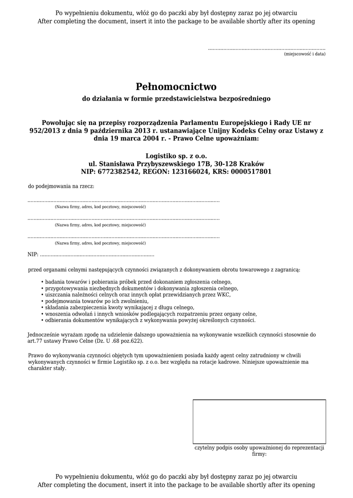 Po wypełnieniu dokumentu, włóż go do paczki aby był dostępny zaraz po jej otwarciu After completing the document, insert it into the package to be available shortly after its opening ............................................................................. (miejscowość i data) Pełnomocnictwo do działania w formie przedstawicielstwa bezpośredniego Powołując się na przepisy rozporządzenia Parlamentu Europejskiego i Rady UE nr 952/2013 z dnia 9 października 2013 r. ustanawiające Unijny Kodeks Celny oraz Ustawy z dnia 19 marca 2004 r. - Prawo Celne upoważniam: Logistiko sp. z o.o. ul. Stanisława Przybyszewskiego 17B, 30-128 Kraków NIP: 6772382542, REGON: 123166024, KRS: 0000517801 do podejmowania na rzecz: .............................................................................................................................. (Nazwa firmy, adres, kod pocztowy, miejscowość) .............................................................................................................................. (Nazwa firmy, adres, kod pocztowy, miejscowość) .............................................................................................................................. (Nazwa firmy, adres, kod pocztowy, miejscowość) NIP: ........................................................................... przed organami celnymi następujących czynności związanych z dokonywaniem obrotu towarowego z zagranicą: • badania towarów i pobierania próbek przed dokonaniem zgłoszenia celnego, • przygotowywania niezbędnych dokumentów i dokonywania zgłoszenia celnego, • uiszczania należności celnych oraz innych opłat przewidzianych przez WKC, • podejmowania towarów po ich zwolnieniu, • składania zabezpieczenia kwoty wynikającej z długu celnego, • wnoszenia odwołań i innych wniosków podlegających rozpatrzeniu przez organy celne, • odbierania dokumentów wynikających z wykonywania powyżej określonych czynności. Jednocześnie wyrażam zgodę na udzielenie dalszego upoważnienia na wykonywanie wszelkich czynności stosownie do art.77 ustawy Prawo Celne (Dz. U .68 poz.622). Prawo do wykonywania czynności objętych tym upoważnieniem posiada każdy agent celny zatrudniony w chwili wykonywanych czynności w firmie Logistiko sp. z o.o. bez względu na rotacje kadrowe. Niniejsze upoważnienie ma charakter stały. czytelny podpis osoby upoważnionej do reprezentacji firmy: Po wypełnieniu dokumentu, włóż go do paczki aby był dostępny zaraz po jej otwarciu After completing the document, insert it into the package to be available shortly after its opening