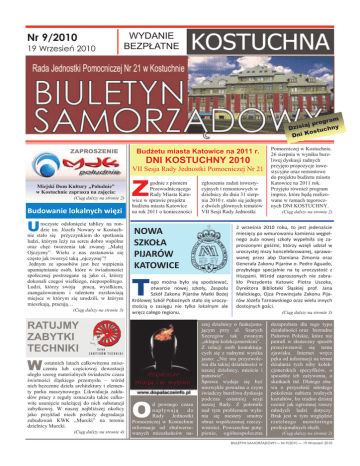 Nr 9/2010 19 Wrzesień 2010 WYDANIE BEZPŁATNE m rogra p j a i Dzis chny ostu K i n D ZAPROSZENIE Budżetu miasta Katowice na 2011 r. DNI KOSTUCHNY 2010 VII Sesja Rady Jednostki Pomocniczej Nr 21 Miejski Dom Kultury „Południe” w Kostuchnie zaprasza na zajęcia: (Ciąg dalszy na stronie 2) Budowanie lokalnych więzi U roczyste odsłonięcie tablicy na rondzie im. Józefa Nowary w Kostuchnie stało się przyczynkiem do spotkania ludzi, którym leży na sercu dobro wspólne oraz chęć tworzenia tak zwanej „Małej Ojczyzny”. Wielu z nas zastanawia się często jak tworzyć taką „ojczyznę”? Jednym ze sposobów jest bez wątpienia upamiętnianie osób, które w świadomości społecznej postrzegane są jako ci, którzy dokonali czegoś wielkiego, niepospolitego. Ludzi, którzy swoją pracą, wysiłkiem, zaangażowaniem i talentem rozsławiają miejsce w którym się urodzili, w którym mieszkają, pracują… (Ciąg dalszy na stronie 3) Z godnie z pismem Przewodniczącego Rady Miasta Katowice w sprawie projektu budżetu miasta Katowice na rok 2011 o konieczności NOWA SZKOŁA PIJARÓW KATOWICE T ego można było się spodziewad, otwarcie nowej szkoły, Zespołu Szkół Zakonu Pijarów Matki Bożej Królowej Szkół Pobożnych stało się uroczystością o zasięgu nie tylko lokalnym ale wręcz całego regionu. RATUJMY ZABYTKI TECHNIKI W ostatnich latach całkowitemu zniszczeniu lub częściowej dewastacji uległo szereg materialnych świadectw czasu świetności śląskiego przemysłu – wśród nich bezcenne dzieła architektury i elementy parku maszynowego. Likwidacja zakładów pracy z reguły oznaczała także całkowite usunięcie należącej do nich substancji zabytkowej. W naszej najbliższej okolicy jako przykład niech posłuży degradacja zabudowań KWK „Murcki” na terenie dzielnicy Murcki. (Ciąg dalszy na stronie 4) zgłoszenia zadań inwestycyjnych i remontowych w dzielnicy do dnia 31 sierpnia 2010 r. stało się jednym z dwóch głównych tematów VII Sesji Rady Jednostki O d pewnego czasu napływają do Rady Jednostki Pomocniczej w Kostuchnie informacje od zbulwersowanych mieszkańców na- Pomocniczej w Kostuchnie. 26 sierpnia w wyniku burzliwej dyskusji radnych przyjęto propozycje inwestycyjne oraz remontowe do projektu budżetu miasta Katowice na 2011 rok. Przyjęto również program imprez, które będą realizowane w ramach tegorocznych DNI KOSTUCHNY. (Ciąg dalszy na stronie 2) 2 września 2010 roku, to jest jedenaście miesięcy po wmurowaniu kamienia węgielnego aula nowej szkoły wypełniła się zaproszonymi gośdmi, którzy wzięli udział w uroczystej mszy koncelebrowanej, sprawowanej przez abp Damiana Zimonia oraz Generała Zakonu Pijarów o. Pedro Aguado, przybyłego specjalnie na tę uroczystośd z Hiszpanii. Wśród zaproszonych nie zabrakło Prezydenta Katowic Piotra Uszoka, Dyrektora Biblioteki Śląskiej prof. Jana Malickiego, Ojca Prowincjała Zakonu Pijarów Józefa Tarnawskiego oraz wielu innych dostojnych gości. (Ciąg dalszy na stronie 3) szej dzielnicy o funkcjonującym przy ul. Szarych Szeregów tak zwanym „sklepie kolekcjonerskim”. Z relacji osób kontaktujących się z radnymi wynika jasno: „Nie ma przyzwolenia dla takiej działalności w naszej dzielnicy, mieście i państwie”. Sprawa wydaje się być niezwykle poważna o czym świadczy burzliwa dyskusja podczas ostatniej sesji naszej Rady. Z polemiki nad tym problemem wyłania się niestety smutny obraz współczesnej rzeczywistości. Powszechne potępienie, ogólnospołeczna dezaprobata dla tego typu działalności oraz bezradne Państwo Polskie, które nie potrafi w skuteczny sposób przeciwstawić się temu zjawisku. Internet wręcz pęka od informacji na temat działania tych niby kolekcjonerskich specyfików, o sposobie ich zażywania, o skutkach itd. Dlatego obawa o przyszłość młodego pokolenia nabiera realnych kształtów, bo trudno dzisiaj ocenić jak ogromnej rzeszy młodych ludzi dotyczy. Brak jest w tym względzie rzetelnego monitoringu profesjonalnych służb. (Ciąg dalszy na stronie 2) BIULETYN SAMORZĄDOWY— Nr 9/2010 — 19 Wrzesień 2010 Strona 2 Budżetu miasta Katowice na 2011 r. DNI KOSTUCHNY 2010 VII Sesja Rady Jednostki Pomocniczej Nr 21 (Ciąg dalszy ze strony 1) Poniżej przedstawiamy wykaz inwestycji i remontów, który został przesłany do Rady Miasta Katowice jako propozycje do uwzględnienia w budżecie miasta na przyszły rok. Propozycje inwestycyjne dla dzielnicy Kostuchna: 1. Skanalizowanie ulic: Stabika z przyległymi (od ul. Słonecznikowej do ul. Armii Krajowej), ul. Hierowskiego, Zawilców oraz Szałwiowej. 2. Budowa miejsc parkingowych przy Ogródkach Działkowych „Kwiat Wrzosu” 3. Budowa placu zabaw i kompleksu boisk w rejonie ulicy Migdałowców pomiędzy skwerem bł. Kubisty a ul. Żarnowcową. 4. Budowa placu zabaw za budynkiem Filii Biblioteki Miejskiej Nr 27 przy ul. Smugowej. 5. Budowa hali sportowej w rejonie ul. Wantuły. 6. Budowa drogi ewakuacyjnej z Placu Filaka pomiędzy budynkiem przy ul. Boya-Żeleńskiego 75 i przejazdem kolejowym. 7. Budowa ronda na skrzyżowaniu ulic: Armii Krajowej, Szarych Szeregów i Stabika. 8. Adaptacja boiska przy Gimnazjum nr 18. Wykonanie boiska do siatkówki plażowej. 9. Wymiana wodociągów przy ul. Kałuży oraz przy ul. Truskawkowej. Propozycje remontów w dzielnicy Kostuchna: 1. Modernizacja zamkniętego odcinka cieku wodnego Matownik od ul. Boya-Żeleńskiego do nasypu kolejowego (rejon przejazdu kolejowego). 2. Modernizacja kanalizacji w obrębie budynku przy Placu Filaka 10. 3. Remont drogi osiedlowej za budynkami przy ul. BoyaŻeleńskiego 87-91. 4. Modernizacja istniejącego placu zabaw za budynkiem ul. Boya-Żeleńskiego 85. Poinformowano również Radnych o przesłaniu pisma do MZUiM Katowice w sprawie wadliwych pokryw studzienek kanalizacyjnych i burzowych na ulicy Boya-Żeleńskiego. Zaproponowano ponadto zaproszenie przedstawicieli Miejskiego Zarządu Ulic i Mostów 