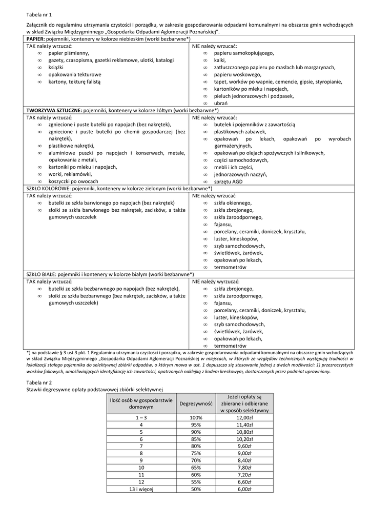 Tabela nr 1 Załącznik do regulaminu utrzymania czystości i porządku, w zakresie gospodarowania odpadami komunalnymi na obszarze gmin wchodzących w skład Związku Międzygminnego „Gospodarka Odpadami Aglomeracji Poznańskiej”. PAPIER: pojemniki, kontenery w kolorze niebieskim (worki bezbarwne*) TAK należy wrzucać: NIE należy wrzucać: • papier piśmienny, • papieru samokopiującego, • gazety, czasopisma, gazetki reklamowe, ulotki, katalogi • kalki, • książki • zatłuszczonego papieru po masłach lub margarynach, • opakowania tekturowe • papieru woskowego, • kartony, tekturę falistą • tapet, worków po wapnie, cemencie, gipsie, styropianie, • kartoników po mleku i napojach, • pieluch jednorazowych i podpasek, • ubrań TWORZYWA SZTUCZNE: pojemniki, kontenery w kolorze żółtym (worki bezbarwne*) TAK należy wrzucać: NIE należy wrzucać: • zgniecione i puste butelki po napojach (bez nakrętek), • butelek i pojemników z zawartością • zgniecione i puste butelki po chemii gospodarczej (bez • plastikowych zabawek, nakrętek), • opakowań po lekach, opakowań po wyrobach • plastikowe nakrętki, garmażeryjnych, • aluminiowe puszki po napojach i konserwach, metale, • opakowań po olejach spożywczych i silnikowych, opakowania z metali, • części samochodowych, • kartoniki po mleku i napojach, • mebli i ich części, • worki, reklamówki, • jednorazowych naczyń, • koszyczki po owocach • sprzętu AGD SZKŁO KOLOROWE: pojemniki, kontenery w kolorze zielonym (worki bezbarwne*) TAK należy wrzucać: NIE należy wrzucać • butelki ze szkła barwionego po napojach (bez nakrętek) • szkła okiennego, • słoiki ze szkła barwionego bez nakrętek, zacisków, a także • szkła zbrojonego, gumowych uszczelek • szkła żaroodpornego, • fajansu, • porcelany, ceramiki, doniczek, kryształu, • luster, kineskopów, • szyb samochodowych, • świetlówek, żarówek, • opakowań po lekach, • termometrów SZKŁO BIAŁE: pojemniki i kontenery w kolorze białym (worki bezbarwne*) TAK należy wrzucać: NIE należy wyrzucać: • butelki ze szkła bezbarwnego po napojach (bez nakrętek), • szkła zbrojonego, • słoiki ze szkła bezbarwnego (bez nakrętek, zacisków, a także • szkła żaroodpornego, gumowych uszczelek) • fajansu, • porcelany, ceramiki, doniczek, kryształu, • luster, kineskopów, • szyb samochodowych, • świetlówek, żarówek, • opakowań po lekach, • termometrów *) na podstawie § 3 ust.3 pkt. 1 Regulaminu utrzymania czystości i porządku, w zakresie gospodarowania odpadami komunalnymi na obszarze gmin wchodzących w skład Związku Międzygminnego „Gospodarka Odpadami Aglomeracji Poznańskiej w miejscach, w których ze względów technicznych występują trudności w lokalizacji stałego pojemnika do selektywnej zbiórki odpadów, o którym mowa w ust. 1 dopuszcza się stosowanie jednej z dwóch możliwości: 1) przezroczystych worków foliowych, umożliwiających identyfikację ich zawartości, opatrzonych naklejką z kodem kreskowym, dostarczonych przez podmiot uprawniony. Tabela nr 2 Stawki degresywne opłaty podstawowej zbiórki selektywnej Ilość osób w gospodarstwie domowym Degresywność 1–3 4 5 6 7 8 9 10 11 12 13 i więcej 100% 95% 90% 85% 80% 75% 70% 65% 60% 55% 50% Jeżeli opłaty są zbierane i odbierane w sposób selektywny 12,00zł 11,40zł 10,80zł 10,20zł 9,60zł 9,00zł 8,40zł 7,80zł 7,20zł 6,60zł 6,00zł