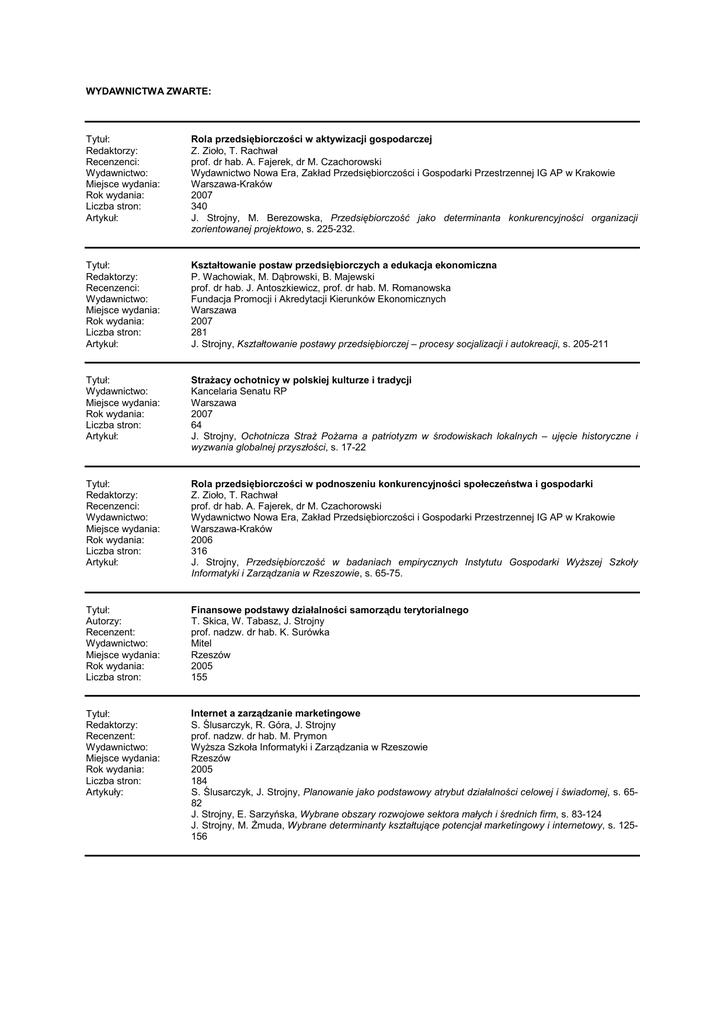 WYDAWNICTWA ZWARTE: Tytuł: Redaktorzy: Recenzenci: Wydawnictwo: Miejsce wydania: Rok wydania: Liczba stron: Artykuł: Rola przedsiębiorczości w aktywizacji gospodarczej Z. Zioło, T. Rachwał prof. dr hab. A. Fajerek, dr M. Czachorowski Wydawnictwo Nowa Era, Zakład Przedsiębiorczości i Gospodarki Przestrzennej IG AP w Krakowie Warszawa-Kraków 2007 340 J. Strojny, M. Berezowska, Przedsiębiorczość jako determinanta konkurencyjności organizacji zorientowanej projektowo, s. 225-232. Tytuł: Redaktorzy: Recenzenci: Wydawnictwo: Miejsce wydania: Rok wydania: Liczba stron: Artykuł: Kształtowanie postaw przedsiębiorczych a edukacja ekonomiczna P. Wachowiak, M. Dąbrowski, B. Majewski prof. dr hab. J. Antoszkiewicz, prof. dr hab. M. Romanowska Fundacja Promocji i Akredytacji Kierunków Ekonomicznych Warszawa 2007 281 J. Strojny, Kształtowanie postawy przedsiębiorczej – procesy socjalizacji i autokreacji, s. 205-211 Tytuł: Wydawnictwo: Miejsce wydania: Rok wydania: Liczba stron: Artykuł: StraŜacy ochotnicy w polskiej kulturze i tradycji Kancelaria Senatu RP Warszawa 2007 64 J. Strojny, Ochotnicza StraŜ PoŜarna a patriotyzm w środowiskach lokalnych – ujęcie historyczne i wyzwania globalnej przyszłości, s. 17-22 Tytuł: Redaktorzy: Recenzenci: Wydawnictwo: Miejsce wydania: Rok wydania: Liczba stron: Artykuł: Rola przedsiębiorczości w podnoszeniu konkurencyjności społeczeństwa i gospodarki Z. Zioło, T. Rachwał prof. dr hab. A. Fajerek, dr M. Czachorowski Wydawnictwo Nowa Era, Zakład Przedsiębiorczości i Gospodarki Przestrzennej IG AP w Krakowie Warszawa-Kraków 2006 316 J. Strojny, Przedsiębiorczość w badaniach empirycznych Instytutu Gospodarki WyŜszej Szkoły Informatyki i Zarządzania w Rzeszowie, s. 65-75. Tytuł: Autorzy: Recenzent: Wydawnictwo: Miejsce wydania: Rok wydania: Liczba stron: Finansowe podstawy działalności samorządu terytorialnego T. Skica, W. Tabasz, J. Strojny prof. nadzw. dr hab. K. Surówka Mitel Rzeszów 2005 155 Tytuł: Redaktorzy: Recenzent: Wydawnictwo: Miejsce wydania: Rok wydania: Liczba stron: Artykuły: Internet a zarządzanie marketingowe S. Ślusarczyk, R. Góra, J. Strojny prof. nadzw. dr hab. M. Prymon WyŜsza Szkoła Informatyki i Zarządzania w Rzeszowie Rzeszów 2005 184 S. Ślusarczyk, J. Strojny, Planowanie jako podstawowy atrybut działalności celowej i świadomej, s. 6582 J. Strojny, E. Sarzyńska, Wybrane obszary rozwojowe sektora małych i średnich firm, s. 83-124 J. Strojny, M. śmuda, Wybrane determinanty kształtujące potencjał marketingowy i internetowy, s. 125156 Tytuł: Redaktor: Recenzent: Wydawnictwo: Miejsce wydania: Rok wydania: Liczba stron: Artykuły: Uwarunkowania rozwoju i konkurencyjności regionów Z. Zioło prof. nadzw. dr hab. E. Rydz Instytut Gospodarki WyŜszej Szkoły Informatyki i Zarządzania w Rzeszowie Warszawa-Kraków 2005 355 J. Strojny, Potencjał rozwojowy gmin podkarpackich, s. 177-196 T. Skica, J. Strojny, Polityka finansowa samorządu gminnego jako wyznacznik lokalnego potencjału rozwojowego, s. 197-210 Tytuł: Redaktorzy: Recenzent: Wydawnictwo: Miejsce wydania: Rok wydania: Liczba stron: Artykuły: Rozwój lokalny. Wybrane zagadnienia społeczne A. Grzesik, W. Tabasz prof. dr hab. M. Malikowski Mitel Rzeszów 2005 121 J. Strojny, Wybrane obszary dylematów decyzyjnych a koncepcja zarządzania przedsiębiorczego jednostką samorządu terytorialnego, s. 7-26 J. Strojny, T. Skica, Problematyka rozwoju terenów wiejskich a koncepcja społeczeństwa przedsiębiorczego, s. 107-112 J. Strojny, A. Grzesik, Zarządzanie procesem uczenia się a problem kształtowania przedsiębiorczych zasobów ludzkich na poziomie samorządu lokalnego, s. 113-121 Tytuł: Redaktorzy: Recenzent: Wydawnictwo: Miejsce wydania: Rok wydania: Liczba stron: Artykuły: Ekologia i ochrona środowiska a wybrane aspekty rozwoju społeczno-gospodarczego J. Krupa, J. Strojny, W. Tabasz prof. dr hab. L. Woźniak Mitel Rzeszów 2005 183 J. Strojny, Globalizacja, kultura, ekologia jako wymiary rozwoju społeczno-gospodarczego, s. 21-30 T. Skica, J. Strojny, Wydatki inwestycyjne samorządów powiatowych Podkarpacia w obszarze ochrony środowiska na przestrzeni lat 1999-2003 Tytuł: Redaktor: Wydawnictwo: Miejsce wydania: Rok wydania: Liczba stron: Artykuł: Nagawczyna. Szkoła i środowisko B. Wasiewicz Mitel Nagawczyna 2005 94 J. Strojny, RozwaŜania o przedsiębiorczości – nad czym powinien zastanowić się młody przedsiębiorca?, s. 87-90 Tytuł: Redaktorzy: Recenzent: Wydawnictwo: Miejsce wydania: Rok wydania: Liczba stron: Artykuł: Przedsiębiorczość a współczesne wyzwania cywilizacyjne Z. Zioło, T. Rachwał prof. dr hab. A. Fajferek Zakład Przedsiębiorczości i Gospodarki Przestrzennej IG AP w Krakowie Kraków 2005 306 J. Strojny, Zarządzanie przedsiębiorcze w dobie globalizacji – perspektywa kulturowa, s. 27-32 Tytuł: Redaktorzy: Recenzent: Wydawnictwo: Miejsce wydania: Rok wydania: Liczba stron: Artykuły: BudŜet samorządu powiatowego i gminnego jako instrument rzeczywistości T. Skica, J. Strojny prof. nadzw. dr hab. K. Surówka Mitel Ropczyce 2004 212 T. Skica, J. Strojny, Struktura dochodowa budŜetu powiatowego, s. 109-119 T. Skica, J. Strojny, Struktura wydatkowa budŜetu powiatowego, s. 120-137 T. Skica, J. Strojny, Saldo budŜetu powiatowego, s. 138-145 T. Skica, J. Strojny, Struktura dochodowa budŜetów gminnych, s. 146-161 T. Skica, J. Strojny, Struktura wydatkowa budŜetów gminnych, s. 162-183 T. Skica, J. Strojny, Saldo budŜetów gminnych, s. 184-189 J. Strojny, Zakończenie, s. 190-198 kształtowania lokalnej Tytuł: Redaktor: Recenzenci Wydawnictwo: Miejsce wydania: Rok wydania: Liczba stron: Artykuły: Studia przypadków z zakresu zarządzania A. Kozina prof. dr hb. E. Jantoń-Drozdowska, prof. dr hab. A. Nalepka WyŜsza Szkoła Informatyki i Zarządzania w Rzeszowie Rzeszów 2004 232 M. Jabłoński, J. Strojny, Świątynia Salomona – zrządzanie wiedzą w szkole wyŜszej