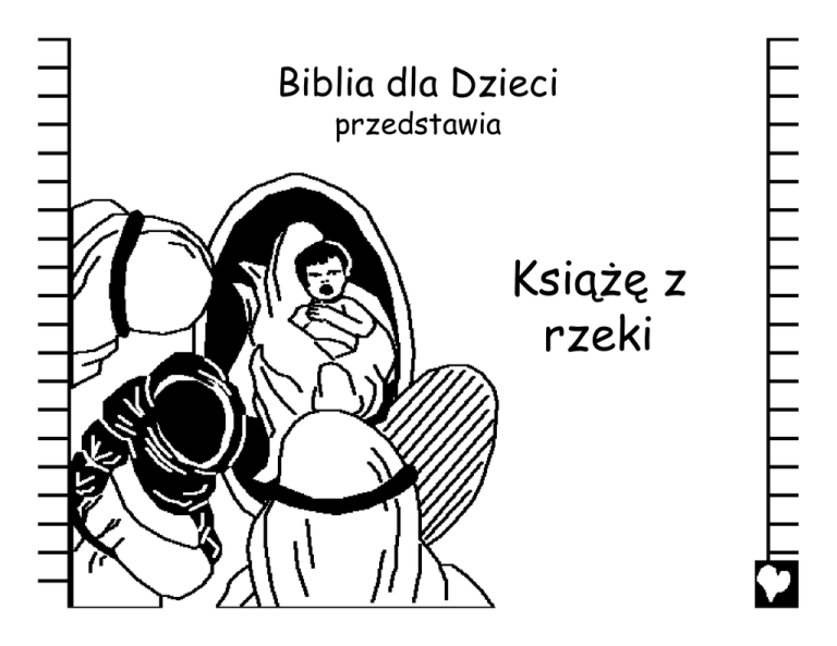 Biblia dla Dzieci przedstawia Książę z rzeki Autor: Edward Hughes Ilustracje: M. Maillot; Lazarus Redakcja: M. Maillot; Sarah S. Tłumaczenie: Katarzyna Gablewska Druk i oprawa: Bible for Children www.M1914.org BFC PO Box 3 Winnipeg, MB R3C 2G1 Canada ©2011 Bible for Children, Inc. Kopiowanie, wypożyczanie, drukowanie tej opowieści jest dozwolone za wyjątkiem wykorzystania jej w celach zarobkowych. Premier Egiptu Józef zmarł! Cały Egipt łączył się w smutku z rodziną Józefa. Bóg użył Józefa Hebrajczyka, aby uratować kraj w czasie głodu. Był on mądrym i miłowanym przywódcą. Lecz teraz już odszedł. Minęło trzysta długich lat, a w Egipcie przybywało coraz więcej Hebrajczyków z ludu Józefa. Martwiło to nowego faraona. Obawiał się, że mogą zwrócić się przeciwko niemu, dlatego uczynił ich wszystkich niewolnikami. Faraon okrutnie traktował Hebrajczyków i nakazywał im pracę przy budowie wspaniałych egipskich miast. Jednak bez względu na to jak bardzo ich wykorzystywał, liczba Hebrajskich niewolników wciąż wzrastała. Pewnego dnia faraon był tak zdeterminowany, żeby zmniejszyć liczbę Hebrajczyków w Egipcie, że wydał przerażający rozkaz „Wszystkich nowonarodzonych chłopców należy wrzucać do rzeki Nil.” Okrutny faraon gotów był zabijać nawet niewinne dzieci. „Co my teraz zrobimy?” zapewne zastanawiała się pewna rodzina. Podjęli decyzję, że wrzucą ich małe dziecko do Nilu, ale wsadzili go najpierw do przytulnego i pasującego jak ulał kosza, który nie przepuszczał wody. Z tak oto cennym ładunkiem mały kosz płynął pomiędzy trzcinami. Ale czy małemu chłopcu uda się przeżyć? Siostra chłopczyka obserwowała dryfujący kosz z daleka. Płynął on spokojnie, delikatnie zatrzymał się w trzcinie. Nagle na brzegu rzeki pojawił się orszak córki faraona, która przyszła wykąpać się w rzece. Było za późno, aby ukryć kosz. Może przejdą i go nie zauważą? „O! Spójrzcie tam! Czy to jest kosz? O tam, w trzcinie, ciekawe co jest w środku!” Córka Faraona nakazała sługom wyłowić kosz. Kiedy go otworzyła, chłopiec zaczął płakać. „To Hebrajskie niemowlę” krzyknęła księżniczka. „Biedny maluszek! Jaki ty jesteś śliczny!” powiedziała córka faraona. Zapewne córka Faraona mówiła do chłopca tak jak robią to dorośli. Być może nawet pieściła się i mówiła „A kuku, koci koci łapki”, ale oczywiście w języku egipskim. Bóg musiał dać wyjątkową mądrość siostrze małego chłopczyka. Pobiegła ona do córki faraona i zapytała ją „Wasza wysokość, czy poszukać Hebrajskiej kobiety, która dla ciebie zaopiekowałaby się dzieckiem?” „Tak, idź i poszukaj” odpowiedziała księżniczka. Jak myślisz, kogo przyprowadziła dziewczynka? „Mamo! Chodź szybko! Pośpiesz się proszę!” Zapewne dziewczynka nie miała nawet czasu, żeby to wszystko wytłumaczyć. Obie pobiegły nad rzekę. Kiedy przybyły nad rzekę, księżniczka przekazała im dziecko i powiedziała „Opiekuj się nim dla mnie, zapłacę ci za to. Daj mu na imię Mojżesz”. Imię Mojżesz w języku egipskim mogło znaczyć syn wody. Tak oto malutki Mojżesz znów był ze swą rodziną. Rodzice nauczyli go miłości do Boga i narodu Hebrajskiego. Wkrótce zamieszka on wraz z córką faraona w pałacu. Bóg, który ocalił mu życie zaplanował dla niego świetlaną przyszłość. Książę z rzeki Opowieść z Bożego Słowa, Biblii na podstawie Księga Wyjścia 2 „Wykład słów Twoich oświeca.” Psalm 119:30 Koniec 9 60 Ta biblijna historia mówi o naszym cudownym Bogu. On nas stworzył i pragnie, abyśmy Go poznawali. Bóg wie, że robimy złe rzeczy i nazywa je grzechem. Karą za grzech jest śmierć, ale Bóg ukochał nas tak bardzo, że posłał Swojego Syna, Jezusa, na śmierć na krzyżu, żeby został ukarany za nasze grzechy. Potem Jezus powrócił do życia i wrócił do domu do Nieba! Jeśli uwierzysz w Jezusa i poprosisz Go o przebaczenie twoich grzechów, On to zrobi! Przyjdzie i zamieszka w tobie teraz, a ty będziesz żył z Nim na zawsze. Jeżeli chcesz odwrócić się od swoich grzechów, powiedz Bogu tak: Drogi Boże, wierzę, że Jezus umarł za mnie, a teraz znowu żyje. Proszę, przyjdź do mojego życia, przebacz mi moje grzechy, tak żebym mógł mieć teraz nowe życie, i żebym pewnego dnia mógł iść do Ciebie i być z Tobą na zawsze. Pomóż mi żyć dla Ciebie jako Twoje dziecko. Amen. Codziennie czytaj Biblię i rozmawiaj z Bogiem! Jan 3:16