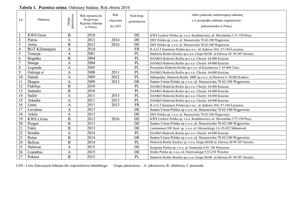 Lp. 1 2 3 4 5 6 7 8 9 10 11 12 13 14 15 16 17 18 19 20 21 22 23 24 25 26 27 Odmiana KWS Ozon Patras Artist RGT Kilimanjaro Tonacja Bogatka Smuga Legenda Ostroga o/ Natula Skagen Fidelius Jantarka Sailor Arkadia Linus Lavantus Arktis KWS Livius Pengar Fakir Hondia Rotax Belissa Delawar Leandrus Pokusa Grupa jakościowa Tabela 1. Pszenica ozima. Odmiany badane. Rok zbioru 2016 B A B A A B A A A A A B B A A A A A B B B A B B A A B Rok wpisania do Krajowego Rejestru Odmian w Polsce 2010 2012 2013 2014 2001 2004 2004 2005 2008 2009 2009 2010 2010 2011 2011 2011 2013 2013 2013 2013 2013 2014 2014 2014 2015 2015 2015 LZO - Lista Zalecanych Odmian dla województwa lubelskiego Rok Kod kraju Adres jednostki zachowującej odmianę włączenia pochodzenia a w przypadku odmiany zagranicznej - do LZO 2014 2016 2011 2012 2012 2013 2013 2013 2016 pełnomocnika w Polsce . DE DE DE FR PL PL PL PL PL PL DE PL PL PL PL FR DE DE DE DE DE PL DE PL DE DE PL KWS Lochow Polska sp. z o.o. Kondratowice, ul. Słowiańska 5 57-150 Prusy DSV Polska sp. z o.o. ul. Straszewska 70 62-100 Wągrowiec DSV Polska sp. z o.o. ul. Straszewska 70 62-100 Wągrowiec R.A.G.T.Semences Polska sp.z o.o. ul. Sadowa 10A 87-148 Łysomice Hodowla Roślin Strzelce sp.z o.o. Grupa IHAR ul.Główna 20 99-307 Strzelce DANKO Hodowla Roślin sp.z o.o. Choryń 64-000 Kościan DANKO Hodowla Roślin sp.z o.o. Choryń 64-000 Kościan Poznańska Hodowla Roślin sp.z o.o. ul.Kasztanowa 5 63-004 Tulce DANKO Hodowla Roślin sp.z o.o. Choryń 64-000 Kościan Małopolska Hodowla Roślin HBP sp.z o.o. ul.Zbożowa 4 30-002 Kraków Saaten Union Polska sp z o.o. ul. Straszewska 70 62-100 Wągrowiec DANKO Hodowla Roślin sp.z o.o. Choryń 64-000 Kościan DANKO Hodowla Roślin sp.z o.o. Choryń 64-000 Kościan DANKO Hodowla Roślin sp.z o.o. Choryń 64-000 Kościan DANKO Hodowla Roślin sp.z o.o. Choryń 64-000 Kościan R.A.G.T.Semences Polska sp.z o.o. ul. Sadowa 10A 87-148 Łysomice Saaten Union Polska sp z o.o. ul. Straszewska 70 62-100 Wągrowiec DSV Polska sp. z o.o. ul. Straszewska 70 62-100 Wągrowiec KWS Lochow Polska sp. z o.o. Kondratowice, ul. Słowiańska 5 57-150 Prusy Saaten Union Polska sp z o.o. ul. Straszewska 70 62-100 Wągrowiec Lantmannen SW Seed sp. z o.o. ul. Głowackiego 1A, 05-822 Milanówek DANKO Hodowla Roślin sp.z o.o. Choryń 64-000 Kościan Saaten Union Polska sp z o.o. ul. Straszewska 70 62-100 Wągrowiec Hodowla Roślin Smolice sp. z o.o. Grupa IHAR ul. Głowna 20 99-307 Strzelce Syngenta Polska sp. z o.o. ul. Szamocka 8 01-748 Warszawa Strube Polska sp. z o.o. ul. Ostrowskiego 9 53-238 Wrocław Hodowla Roślin Strzelce sp.z o.o. Grupa IHAR ul.Główna 20 99-307 Strzelce Grupa jakościowa – A- jakościowa, B- chlebowa, C pozostałe Tabela 4. Pszenica ozima. Plon ziarna odmian w miejscowościach ( % wzorca ). Rok zbioru 2016 Poziom a2 Pożóg Cicibór Bezek Czesławice Uhnin Palikije 78,6 72,3 45,4 81,6 110,0 87,4 66,4 85,8 77,7 50,8 92,8 123,4 97,6 KWS Ozon Patras Artist RGT Kilimanjaro Tonacja Bogatka Smuga Legenda Ostroga o/ Natula Skagen Fidelius Jantarka Sailor Arkadia Linus Lavantus Arktis KWS Livius Pengar Fakir Hondia Rotax Belissa Delawar Leandrus Pokusa 94 92 114 112 95 112 85 89 97 102 93 105 102 89 107 99 94 97 95 83 103 104 120 102 99 115 102 105 110 109 103 107 109 108 108 98 105 105 103 107 82 111 108 109 90 85 64 93 103 103 88 93 97 96 90 95 88 101 98 116 118 98 94 111 90 108 117 103 122 95 98 103 93 70 97 93 113 115 97 97 80 110 99 104 115 104 99 104 88 110 106 114 59 90 101 114 110 93 115 100 102 97 83 118 103 103 67 92 100 106 105 100 88 101 95 93 100 106 95 98 105 103 100 109 101 92 91 96 106 98 112 102 103 92 102 93 108 108 107 96 116 91 98 94 98 101 103 100 99 113 97 89 94 104 79 101 102 102 104 92 99 110 94 81 106 109 98 87 107 108 105 103 103 94 109 101 106 99 81 100 93 85 106 108 108 110 108 94 97 98 89 109 105 101 105 92 91 100 108 98 102 108 90 108 106 92 94 92 78 107 104 115 103 103 105 95 109 113 112 107 106 109 108 114 108 104 103 108 109 77 113 104 104 94 76 29 98 106 105 99 91 99 95 89 94 93 95 102 116 113 103 94 108 89 102 113 106 118 94 102 107 96 74 94 93 109 116 105 95 79 113 83 98 102 109 110 109 113 106 103 105 68 91 101 103 115 103 105 97 107 105 74 126 98 102 60 91 101 103 105 103 89 105 102 107 96 100 97 102 102 97 109 99 97 90 89 102 103 99 106 104 102 87 101 97 100 111 100 92 108 107 101 97 102 101 109 98 93 109 106 88 84 97 87 104 96 98 110 100 104 101 100 81 107 108 101 96 110 107 99 104 100 103 103 101 113 102 78 97 95 84 101 102 103 111 106 91 94 Wzorzec – średnia ze wszystkich badanych odmian Pożóg Palikije 57,5 Ulhówek Uhnin Wzorzec, dt z ha Odmiana Ulhówek Czesławice 1 2 3 4 5 6 7 8 9 10 11 12 13 14 15 16 17 18 19 20 21 22 23 24 25 26 27 Bezek Lp. Cicibór Poziom a1 Tabela 5 Lp Odmiana . Mrozo odporność Pszenica ozima. Plon ziarna odmian (% wzorca). Lata zbioru: 2016, 2015, 2014. Wzorzec dt z ha 1 2 3 4 5 6 7 8 9 10 11 12 13 14 15 16 17 18 19 20 21 22 23 24 25 26 27 KWS Ozon Patras Artist RGT Kilimanjaro Tonacja Bogatka Smuga Legenda Ostroga o/ Natula Skagen Fidelius Jantarka Sailor Arkadia Linus Lavantus Arktis KWS Livius Pengar Fakir Hondia Rotax Belissa Delawar Leandrus Pokusa 4,0 4,0 4,0 4,0 5,5 5,5 6,0 6,0 6,0 5,0 5,0 4,5 5,5 4,5 6,0 4,0 3,0 4,5 3,0 2,0 4,5 5,5 5,0 5,0 4,0 3,0 3,0 Poziom a1 Poziom a2 2016 2015 2014 20152016 20142016 2016 2015 2014 20152016 20142016 76,1 94,0 77,9 85,1 82,7 84,9 108,1 93,7 96,5 95,6 97 100 105 106 98 106 101 98 99 104 100 98 105 97 110 102 95 97 95 81 101 100 110 103 99 96 98 99 101 105 103 96 101 97 94 95 101 102 100 100 99 105 103 98 99 99 93 101 100 110 104 101 105 105 100 96 106 103 99 107 106 105 100 104 99 101 104 95 111 103 94 94 92 79 102 98 107 107 101 94 95 102 103 102 97 97 100 97 96 92 99 100 102 99 102 102 107 102 97 100 102 101 100 106 105 100 104 104 101 100 104 100 98 104 102 101 96 102 100 102 102 99 107 106 98 96 96 91 102 99 107 106 101 101 104 12 21 101 102 106 100 94 95 93 90 91 98 103 102 95 101 100 104 101 1