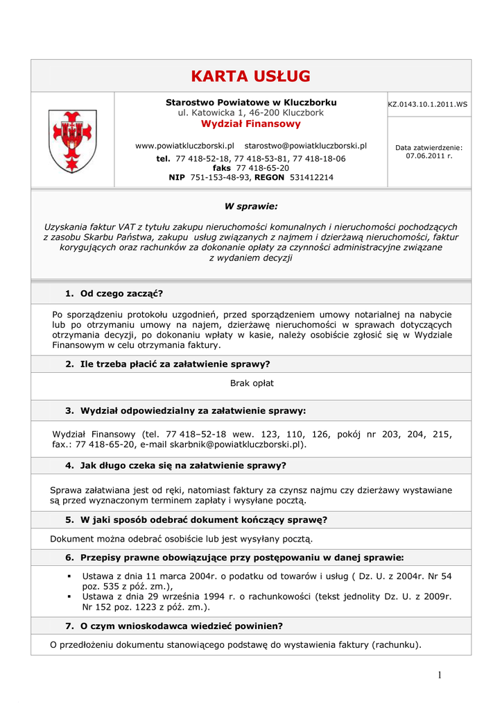 KARTA USŁUG Starostwo Powiatowe w Kluczborku ul. Katowicka 1, 46-200 Kluczbork KZ.0143.10.1.2011.WS Wydział Finansowy www.powiatkluczborski.pl [email protected] tel. 77 418-52-18, 77 418-53-81, 77 418-18-06 faks 77 418-65-20 NIP 751-153-48-93, REGON 531412214 Data zatwierdzenie: 07.06.2011 r. W sprawie: Uzyskania faktur VAT z tytułu zakupu nieruchomości komunalnych i nieruchomości pochodzących z zasobu Skarbu Państwa, zakupu usług związanych z najmem i dzierżawą nieruchomości, faktur korygujących oraz rachunków za dokonanie opłaty za czynności administracyjne związane z wydaniem decyzji 1. Od czego zacząć? Po sporządzeniu protokołu uzgodnień, przed sporządzeniem umowy notarialnej na nabycie lub po otrzymaniu umowy na najem, dzierżawę nieruchomości w sprawach dotyczących otrzymania decyzji, po dokonaniu wpłaty w kasie, należy osobiście zgłosić się w Wydziale Finansowym w celu otrzymania faktury. 2. Ile trzeba płacić za załatwienie sprawy? Brak opłat 3. Wydział odpowiedzialny za załatwienie sprawy: Wydział Finansowy (tel. 77 418–52-18 wew. 123, 110, 126, pokój nr 203, 204, 215, fax.: 77 418-65-20, e-mail [email protected]). 4. Jak długo czeka się na załatwienie sprawy? Sprawa załatwiana jest od ręki, natomiast faktury za czynsz najmu czy dzierżawy wystawiane są przed wyznaczonym terminem zapłaty i wysyłane pocztą. 5. W jaki sposób odebrać dokument kończący sprawę? Dokument można odebrać osobiście lub jest wysyłany pocztą. 6. Przepisy prawne obowiązujące przy postępowaniu w danej sprawie: § § Ustawa z dnia 11 marca 2004r. o podatku od towarów i usług ( Dz. U. z 2004r. Nr 54 poz. 535 z póź. zm.), Ustawa z dnia 29 września 1994 r. o rachunkowości (tekst jednolity Dz. U. z 2009r. Nr 152 poz. 1223 z póź. zm.). 7. O czym wnioskodawca wiedzieć powinien? O przedłożeniu dokumentu stanowiącego podstawę do wystawienia faktury (rachunku). 1 8. Co przysługuje wnioskodawcy? § Skarga do Starosty Kluczborskiego 9. Wzór wniosku do pobrania: Nie dotyczy DODATKOWE UWAGI: Brak uwag Godziny urzędowania Starostwa Powiatowego w Kluczborku: Poniedziałek godz. 8.00 – 16.00 Wtorek-Piątek godz. 7.00-15.00 Opracowała: Wanda Słabosz Zatwierdził: Adam Radom 2