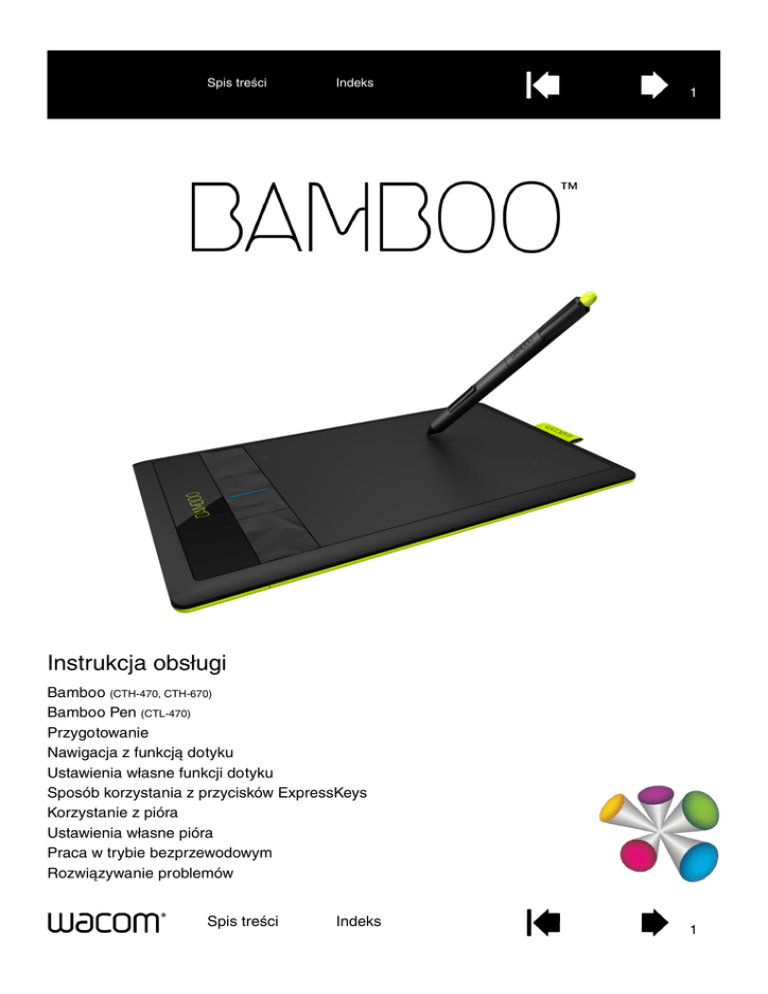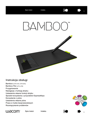 Spis treści Indeks 1 Instrukcja obsługi Bamboo (CTH-470, CTH-670) Bamboo Pen (CTL-470) Przygotowanie Nawigacja z funkcją dotyku Ustawienia własne funkcji dotyku Sposób korzystania z przycisków ExpressKeys Korzystanie z pióra Ustawienia własne pióra Praca w trybie bezprzewodowym Rozwiązywanie problemów Spis treści Indeks 1 Spis treści Indeks 2 BambooTM Instrukcja obsługi Wersja 1.1, uaktualnienie J2811 Copyright © Wacom Co., Ltd., 2011 Wszelkie prawa zastrzeżone. Kopiowanie całości lub części niniejszej instrukcji w celu innym niż użytek prywatny jest zabronione. Firma Wacom zastrzega sobie prawo do wprowadzenia zmian w niniejszej publikacji bez konieczności wcześniejszego powiadomienia o takich zmianach. Firma Wacom dołożyła wszelkich starań, by niniejsza instrukcja zawierała aktualne oraz dokładne informacje. Firma Wacom zastrzega sobie prawo do zmiany wszelkich danych technicznych oraz konfiguracji produktu według własnego uznania bez wcześniejszego powiadomienia oraz bez konieczności uwzględnienia takich zmian w tej instrukcji. Powyższy rok oznacza datę przygotowania instrukcji obsługi. Niezależnie od tego, niniejsza instrukcja zostanie udostępniona użytkownikom w momencie wprowadzenia do sprzedaży powiązanego z nią produktu firmy Wacom. Bamboo jest znakiem towarowym, a Wacom jest zastrzeżonym znakiem towarowym firmy Wacom Company, Ltd. Adobe i Photoshop są znakami towarowymi bądź zastrzeżonymi znakami towarowymi Adobe Systems Incorporated zarejestrowanymi w Stanach Zjednoczonych i/lub innych krajach. Microsoft, Windows oraz Vista są znakami towarowymi bądź zastrzeżonymi znakami towarowymi Microsoft Corporation zarejestrowanymi w Stanach Zjednoczonych i/lub innych krajach. Apple, logo Apple oraz Mac są znakami towarowymi firmy Apple, Inc. zarejestrowanymi w Stanach Zjednoczonych i innych krajach. Wszelkie inne nazwy firm bądź produktów wymienionych w niniejszej dokumentacji mogą być znakami towarowymi bądź zastrzeżonymi znakami towarowymi. Wymienione produkty stron trzecich służą jedynie celom informacyjnym i nie są wyrazem aprobaty bądź rekomendacji. Firma Wacom nie ponosi żadnej odpowiedzialności za wydajność bądź użytkowanie tych produktów. ExpressKey jest zastrzeżonym znakiem towarowym firmy Ginsan Industries, Inc. użytym za zgodą właściciela. Spis treści Indeks 2 Indeks Spis treści 3 SPIS TREŚCI Informacje dotyczące instrukcji obsługi 5 TABLET BAMBOO Identyfikacja modelu tabletu Tablet Bamboo Tablet Bamboo Pen Pióro Uchwyt pióra 6 6 7 8 9 9 PRZYGOTOWANIE TABLETU BAMBOO Ergonomiczna praca Konfigurowanie orientacji tabletu Zaznajomienie z obszarem aktywnym tabletu Praca z wieloma monitorami Podstawy panelu sterowania 10 10 12 13 15 15 KORZYSTANIE Z TABLETU BAMBOO Dotykowa obsługa tabletu Bamboo Nawigacja z funkcją dotyku Ustawienia własne funkcji dotyku Obsługa tabletu Bamboo przy użyciu pióra Sposób trzymania pióra Korzystanie z pióra na tablecie Przesuwanie Kliknięcie Przeciągnięcie Sposób korzystania z przycisków pióra Pisanie i rysowanie z wykorzystaniem czułości na nacisk Wymazywanie Ćwiczenia koordynacji ręka-oko Ustawienia własne wprowadzania danych za pomocą pióra Elementy sterujące tabletu Podstawy przycisków ExpressKeys Ustawienia własne przycisków ExpressKeys 16 16 17 28 28 29 29 30 32 32 33 Spis treści 34 35 36 36 36 37 37 Indeks USTAWIENIA WŁASNE TABLETU BAMBOO Otwieranie panelu sterowania Informacje ogólne o panelu sterowania Ustawienia własne obsługi dotykowej Ustawienie opcji dotykowych Ustawienie funkcji dotykowych Wyłączenie obsługi dotyku Ustawienia własne obsługi przy pomocy pióra Ustawienie czułości końcówki i gumki oraz odstępu dwukrotnego kliknięcia Ustawienie funkcji przycisku pióra Ustawienie mapowania tabletu Wyznaczanie obszaru ekranu Wyznaczanie obszaru tabletu Ustawienie szybkości pióra w trybie pracy myszy Ustawienia własne tabletu i funkcji przycisków ExpressKeys Ustawienia własne menu podręcznego Praca z funkcją Przełączanie wyświetlacza Funkcje przycisków 38 38 39 40 40 41 42 43 44 45 46 48 48 49 50 51 52 53 PRACA W TRYBIE BEZPRZEWODOWYM Z TABLETEM BAMBOO Elementy zestawu akcesoriów bezprzewodowych Konfiguracja połączenia bezprzewodowego Nawiązywanie połączenia bezprzewodowego Optymalizacja połączenia bezprzewodowego Akumulator i zarządzanie energią Ładowanie akumulatora Stan akumulatora i połączenia bezprzewodowego Funkcje oszczędzania energii Żywotność akumulatora Wymiana akumulatora Wyjmowanie modułu bezprzewodowego 3 58 58 59 60 62 63 63 64 65 66 67 68 Spis treści Indeks Schowek na odbiornik bezprzewodowy 69 MASZ PROBLEM Z BAMBOO? Testowanie tabletu Testowanie pióra Tabele rozwiązywania problemów Problemy ogólne Problemy funkcji dotykowych Problemy wprowadzania danych za pomocą pióra Problemy związane z połączeniem bezprzewodowym Problemy typowe dla systemu operacyjnego Windows Problemy typowe dla komputerów Macintosh Opcje pomocy technicznej Pobieranie sterowników 70 71 73 74 74 75 76 Spis treści 78 80 81 83 84 Indeks 4 DODATEK Konserwacja tabletu Bamboo Wymiana wkładu pióra Bamboo Dock Odinstalowywanie tabletu Bamboo Zarządzanie preferencjami Możliwości pióra i atramentu cyfrowego podczas pracy w systemie Windows Informacje o produkcie Zamawianie części i akcesoriów Dostępne części i akcesoria 85 85 86 87 87 88 89 90 91 91 SŁOWNICZEK 92 INDEKS 95 4 Spis treści Indeks 5 INFORMACJE DOTYCZĄCE INSTRUKCJI OBSŁUGI Niniejsza instrukcja umożliwia szybki dostęp do informacji na temat tabletu Bamboo. Podane informacje dotyczą zarówno systemu operacyjnego Windows, jak i komputerów Mac. Przedstawione obrazy pochodzą z systemu Windows, o ile nie wskazano inaczej. • Przejdź bezpośrednio do tematu spis treści lub indeks, klikając jego nazwę. • Do przemieszczania się po instrukcji należy używać przycisków nawigacji. Przejdź do strony głównej. Spis tr
